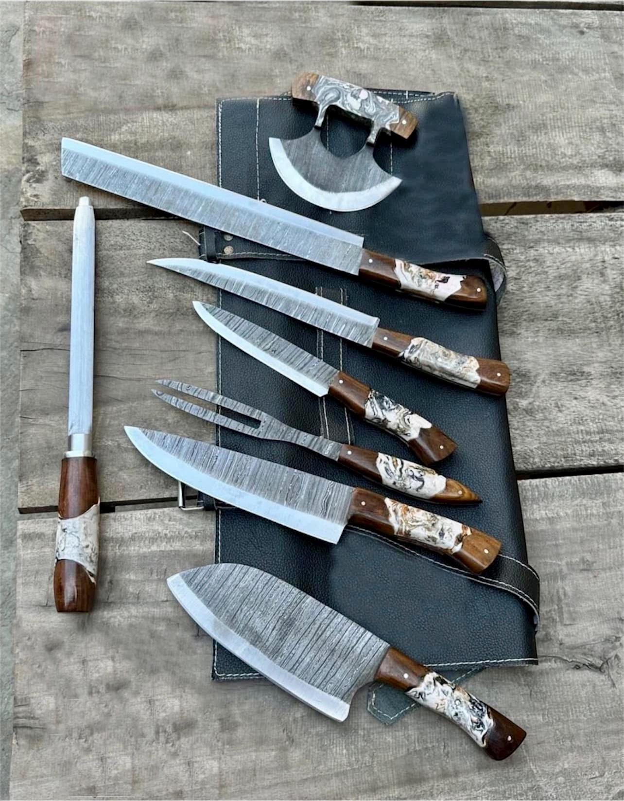 Take your kitchen or BBQ game to the next level with this masterfully crafted 8-piece knife set. Each blade is hand-forged using high-quality Damascus steel, known for its incredible sharpness, edge retention, and beautiful flowing patterns. Whether you are a professional chef, a backyard pitmaster, or looking for the ultimate gift, this set offers precision and durability for every cut.