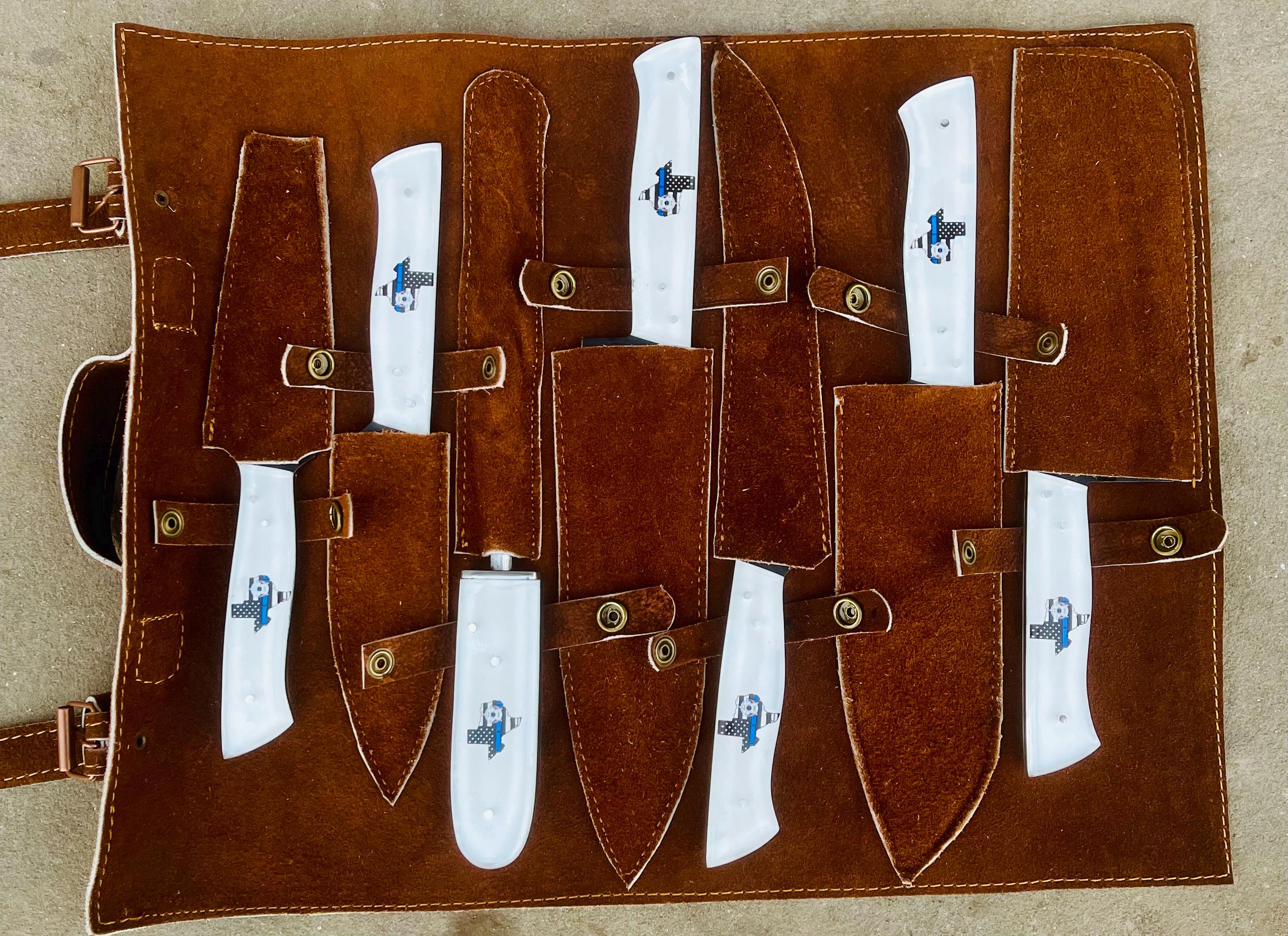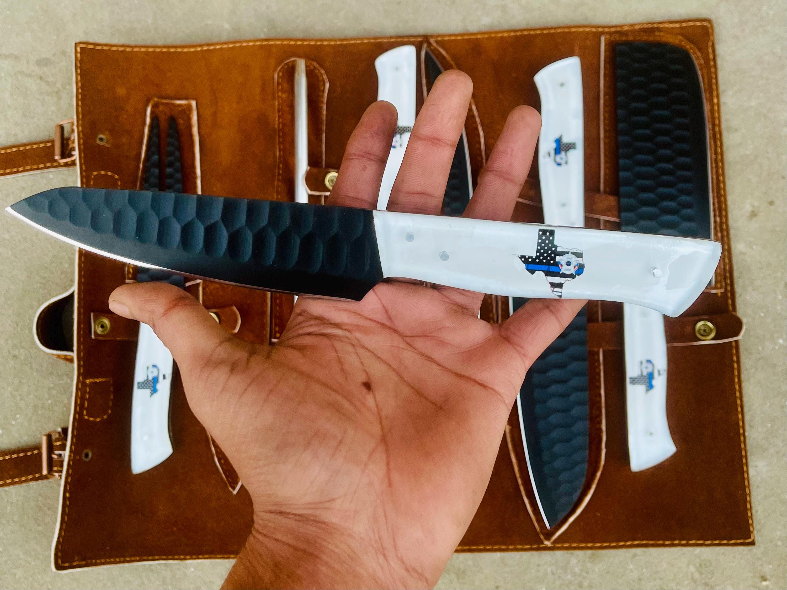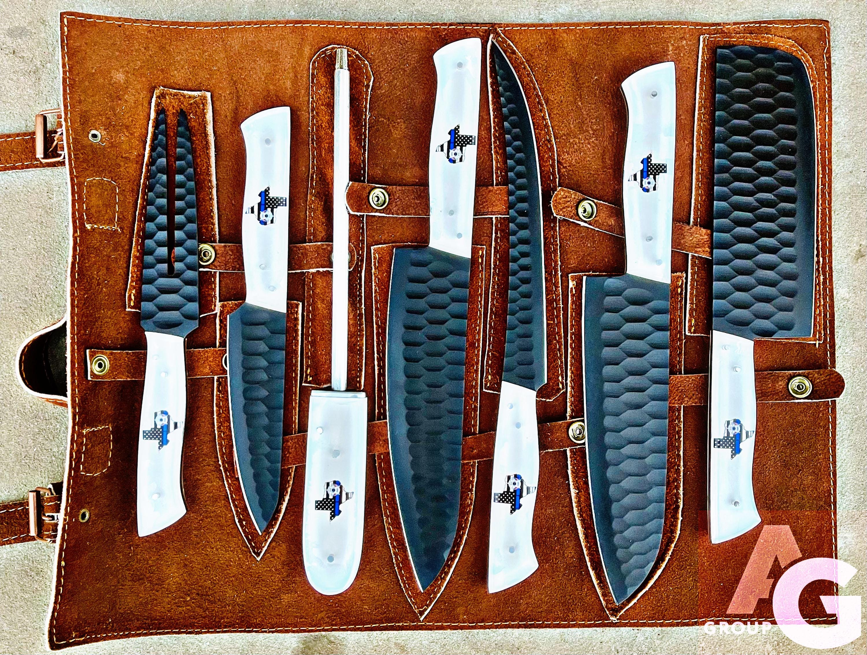 Custom Handmade D2 Steel TEXAS Real Flag Kitchen BBQ 7 PCS Chef Knives Set Overall Length: 10.5. to 13.5'' Inches Handle Length: 5.0'' Inches Handle Material: TEXAS FLAG REAL LOGOS Blade Material: D2 STEEL Sweet Leather Roll Kit Excellent husband wife gift Wedding gift Father's Day gift Mother's Day gift Birthday Gift Groomsmen gift Christmas gift Best Knife Gift Luxury Handmade Gifts ''All of our knives are 100% hand crafted. True quality material used to form the blade. The handle materials, blade steels, and leather sheaths are professionally made with no spare expense. Great handle fitting, exception sharp edge, nicely balanced grasp''