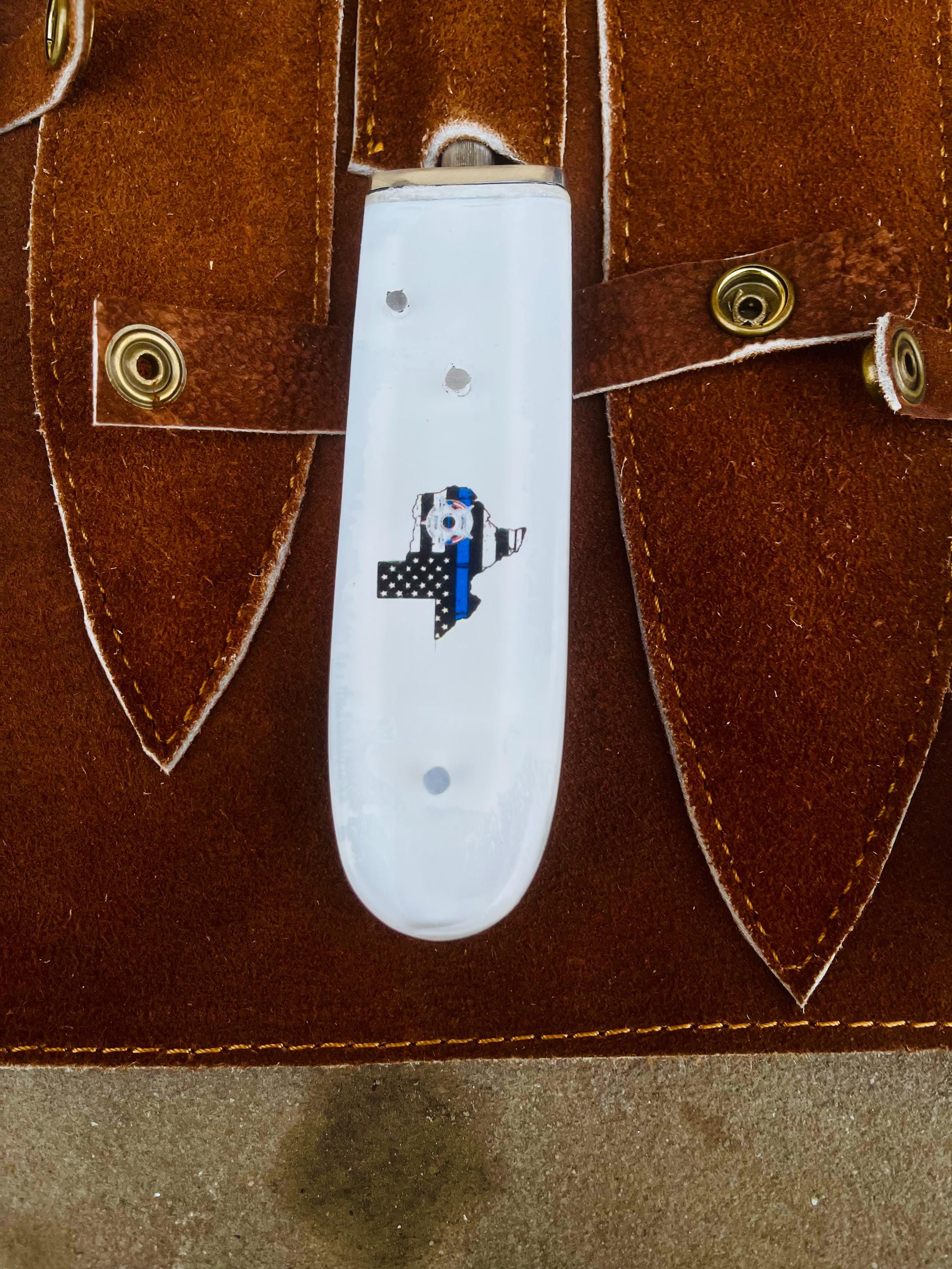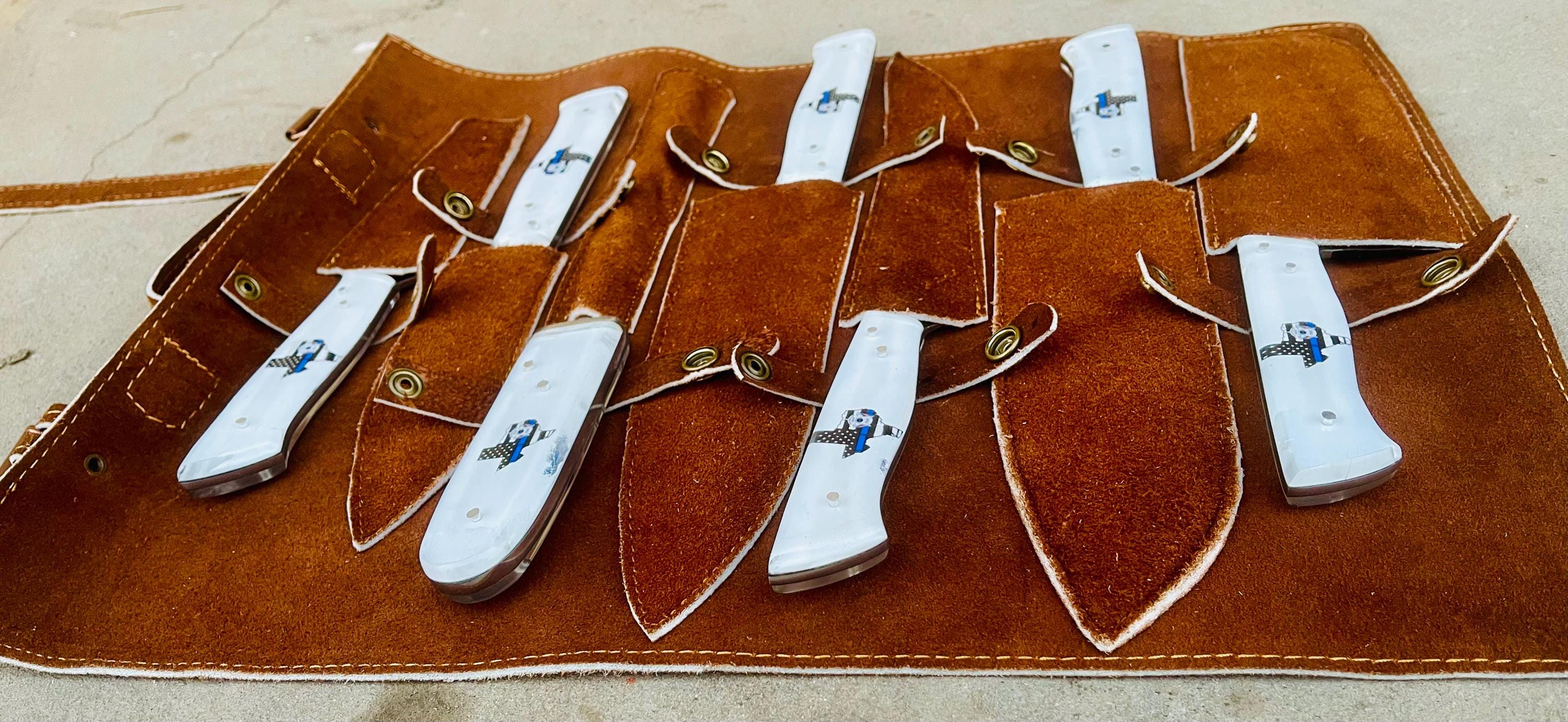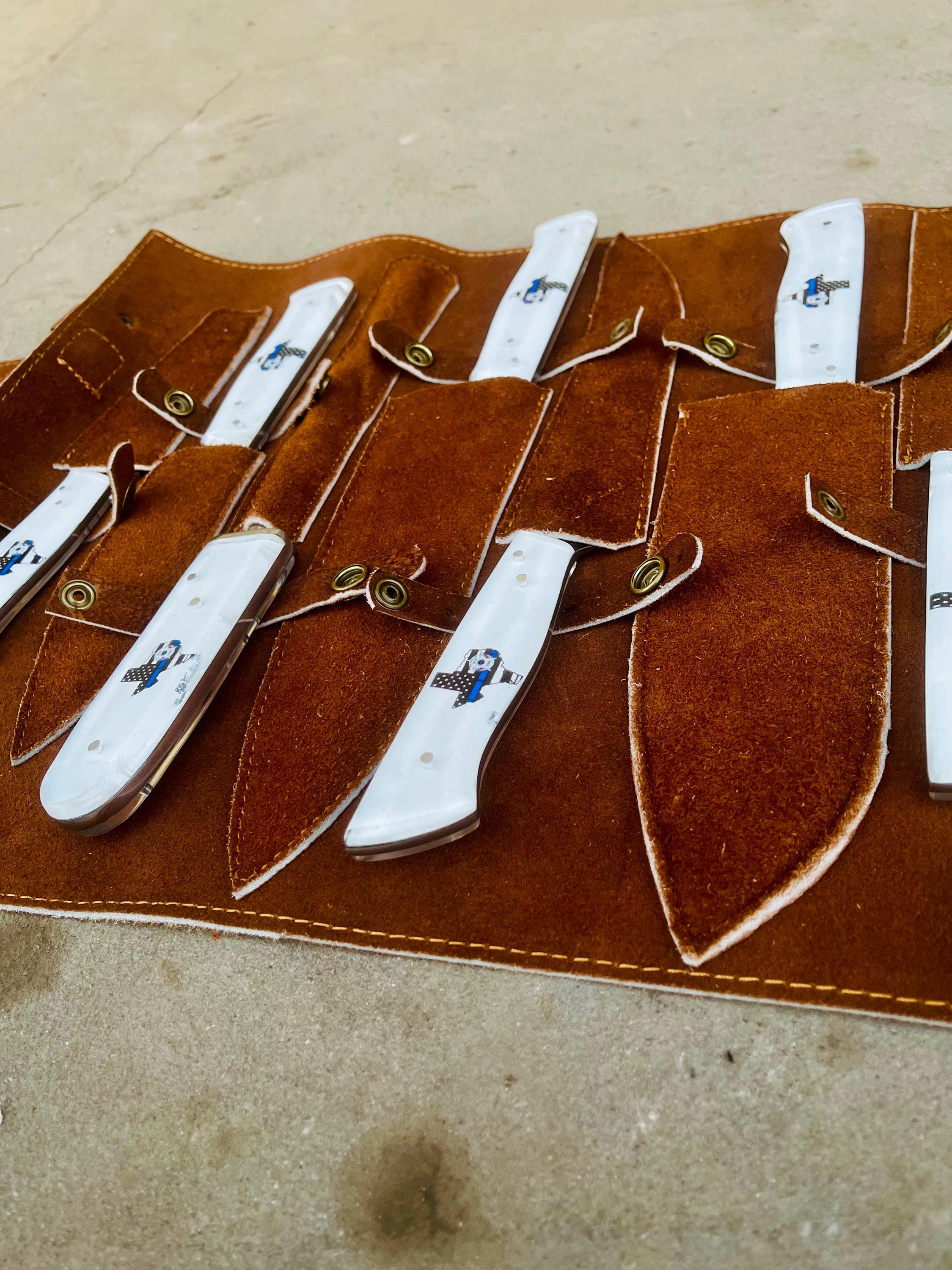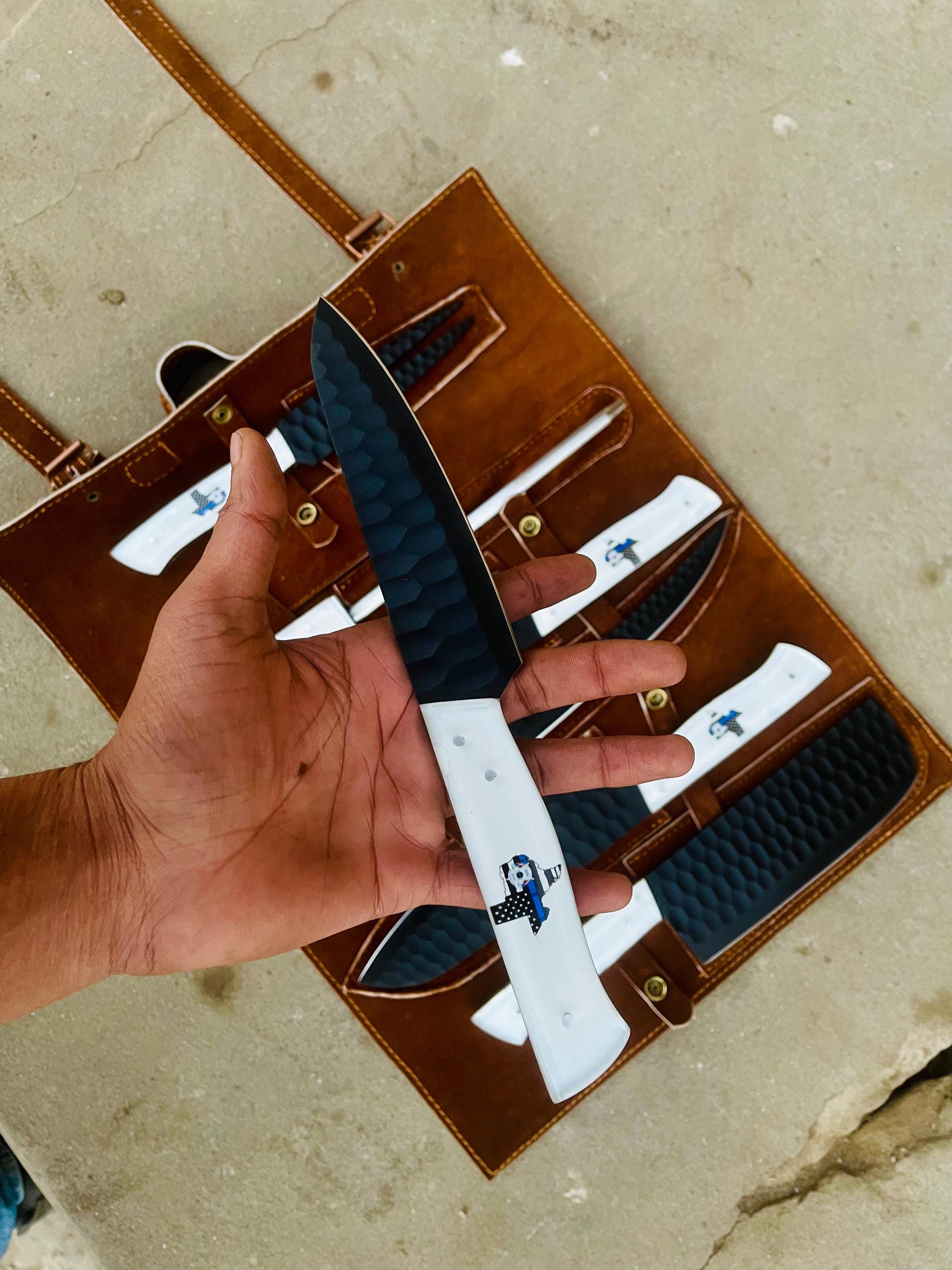 Custom Handmade D2 Steel TEXAS Real Flag Kitchen BBQ 7 PCS Chef Knives Set Overall Length: 10.5. to 13.5'' Inches Handle Length: 5.0'' Inches Handle Material: TEXAS FLAG REAL LOGOS Blade Material: D2 STEEL Sweet Leather Roll Kit Excellent husband wife gift Wedding gift Father's Day gift Mother's Day gift Birthday Gift Groomsmen gift Christmas gift Best Knife Gift Luxury Handmade Gifts ''All of our knives are 100% hand crafted. True quality material used to form the blade. The handle materials, blade steels, and leather sheaths are professionally made with no spare expense. Great handle fitting, exception sharp edge, nicely balanced grasp''