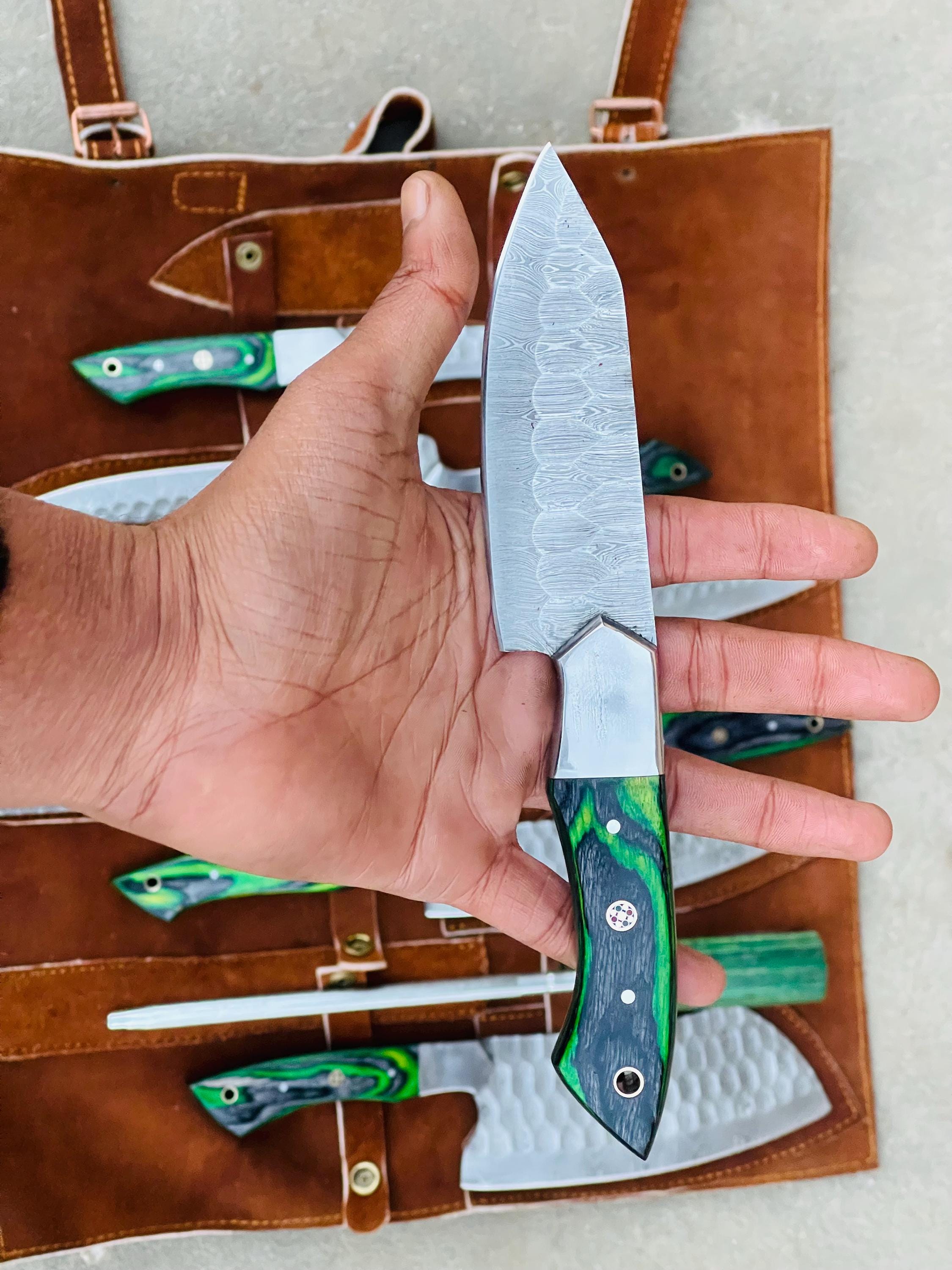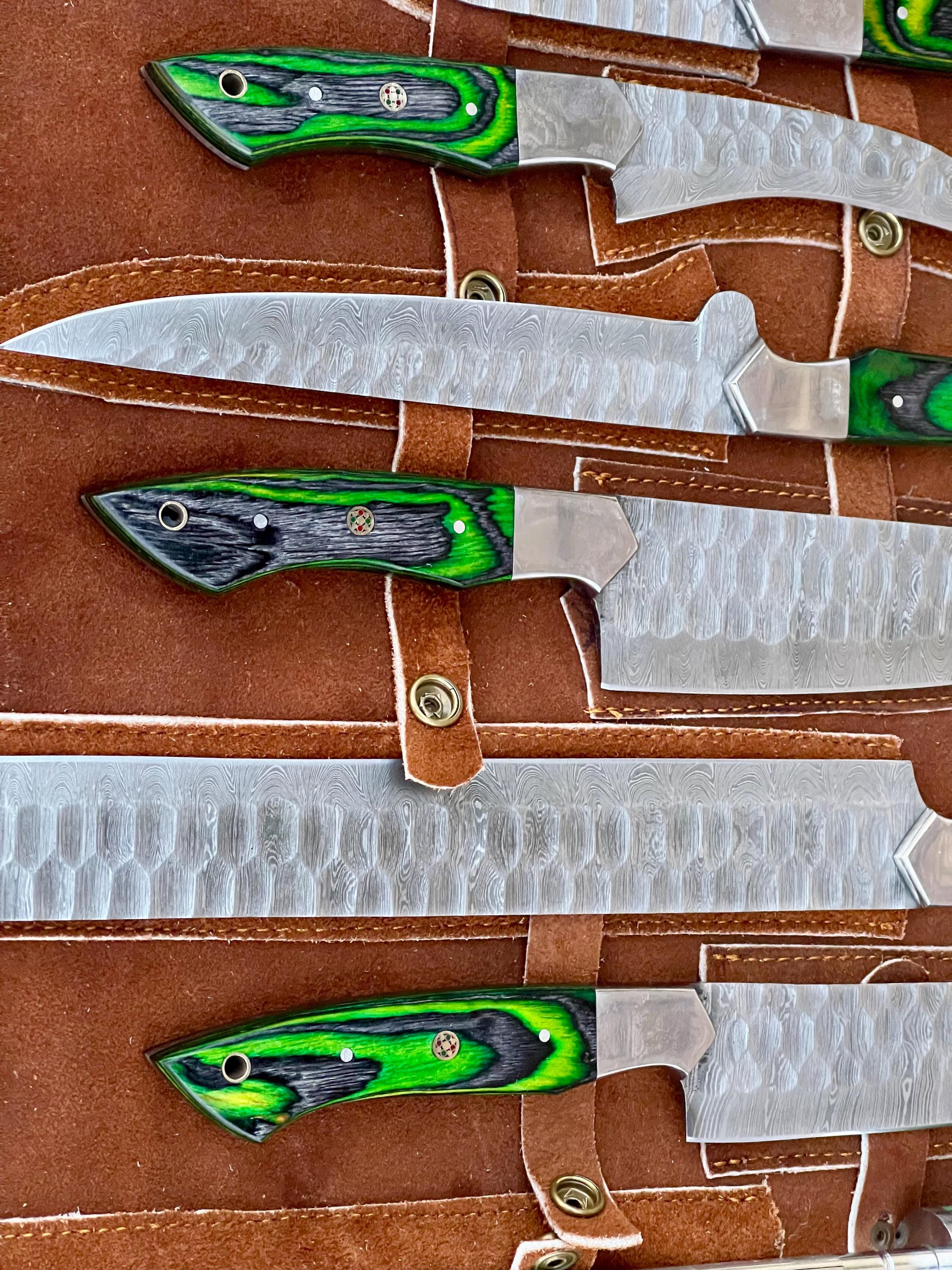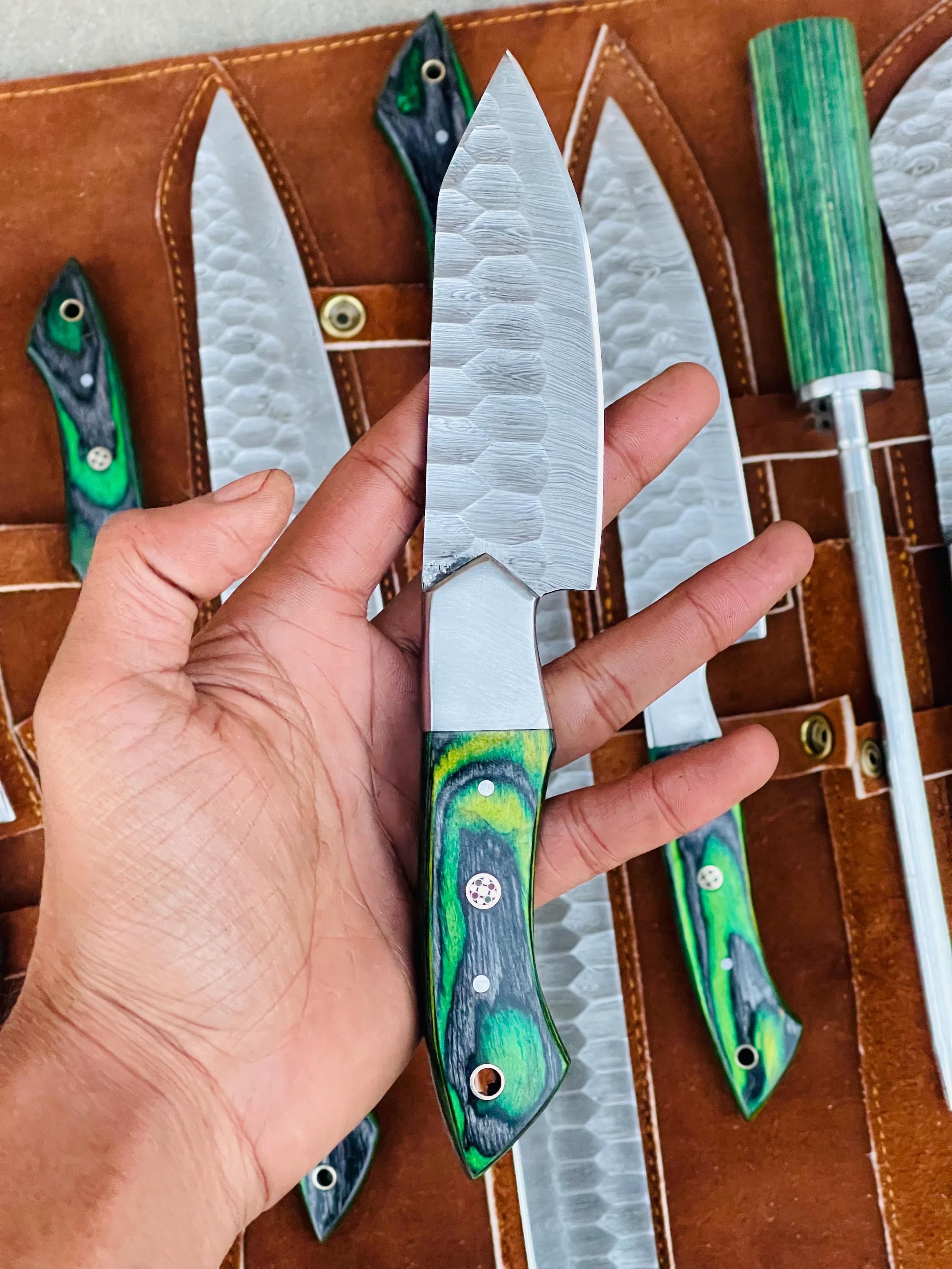 Custom Handmade D2 Steel Green Kitchen BBQ 8 PCS Chef Knives Set Overall Length: 8.5 to 15 '' Inches Handle Length: 5.0'' Inches Handle Material: GREEN DARK Blade Material: Damascus Steel Sweet Leather Roll Kit Excellent husband wife gift Wedding gift Father's Day gift Mother's Day gift Birthday Gift Groomsmen gift Christmas gift Best Knife Gift Luxury Handmade Gifts
