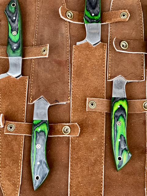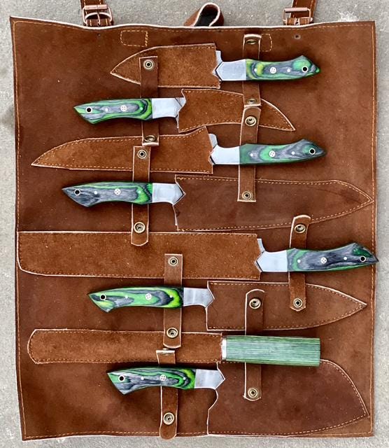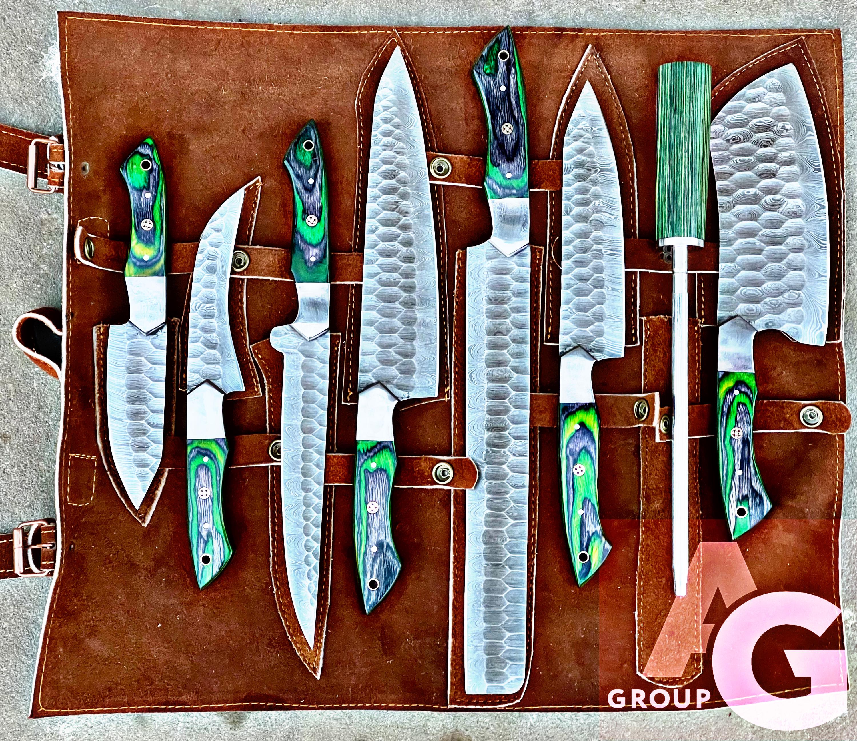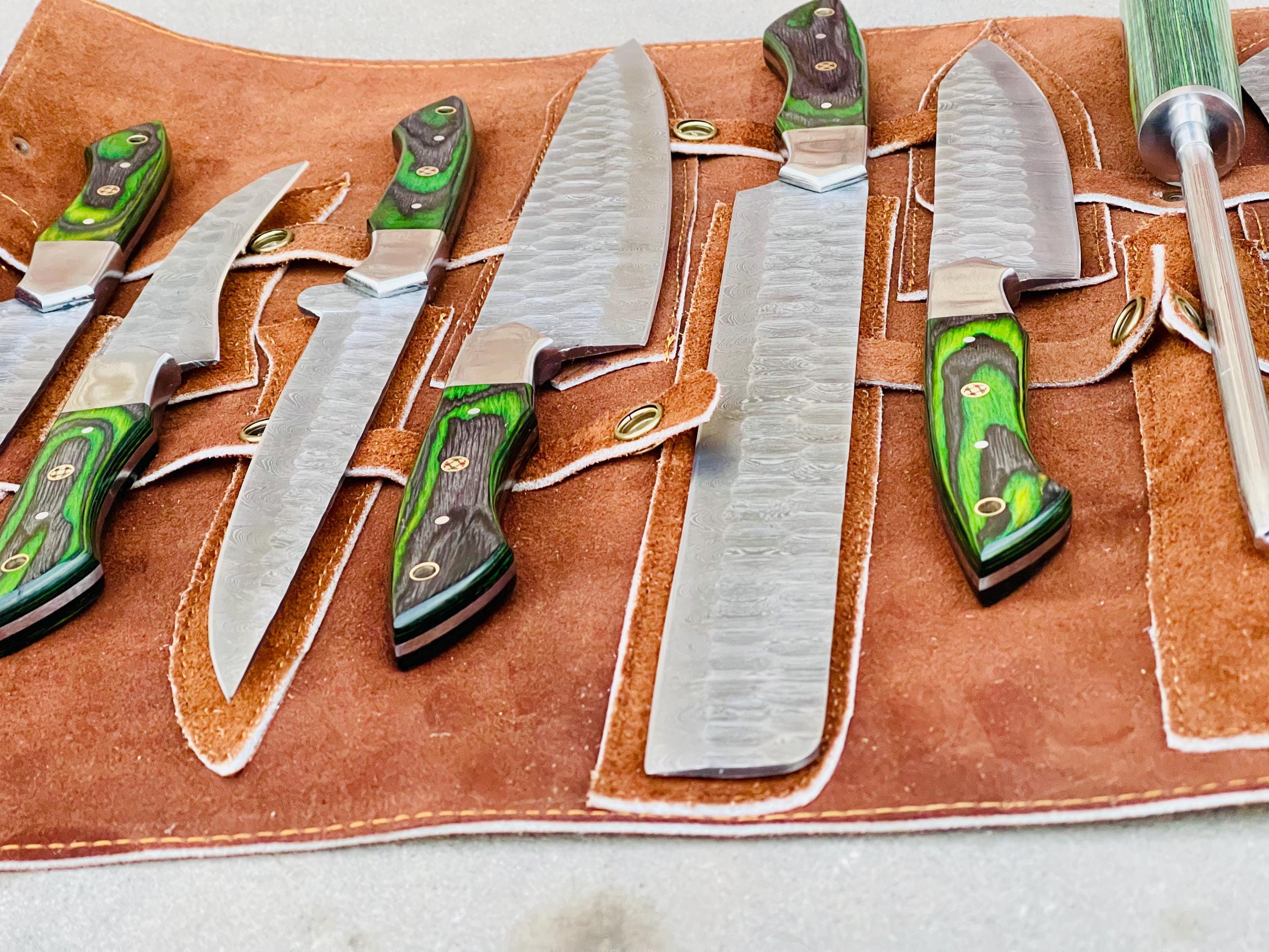 Custom Handmade D2 Steel Green Kitchen BBQ 8 PCS Chef Knives Set Overall Length: 8.5 to 15 '' Inches Handle Length: 5.0'' Inches Handle Material: GREEN DARK Blade Material: Damascus Steel Sweet Leather Roll Kit Excellent husband wife gift Wedding gift Father's Day gift Mother's Day gift Birthday Gift Groomsmen gift Christmas gift Best Knife Gift Luxury Handmade Gifts