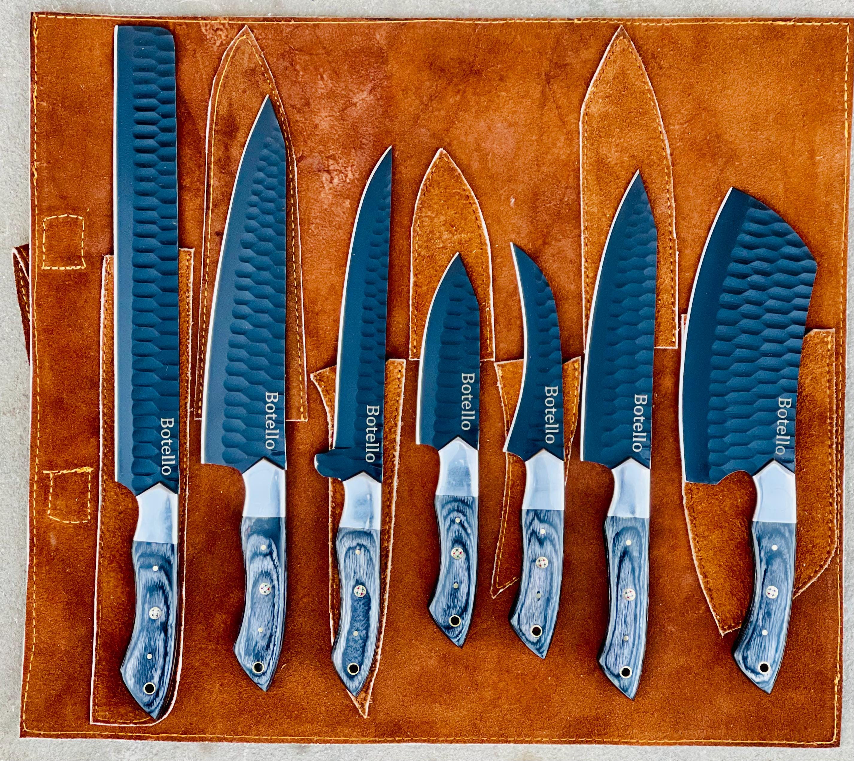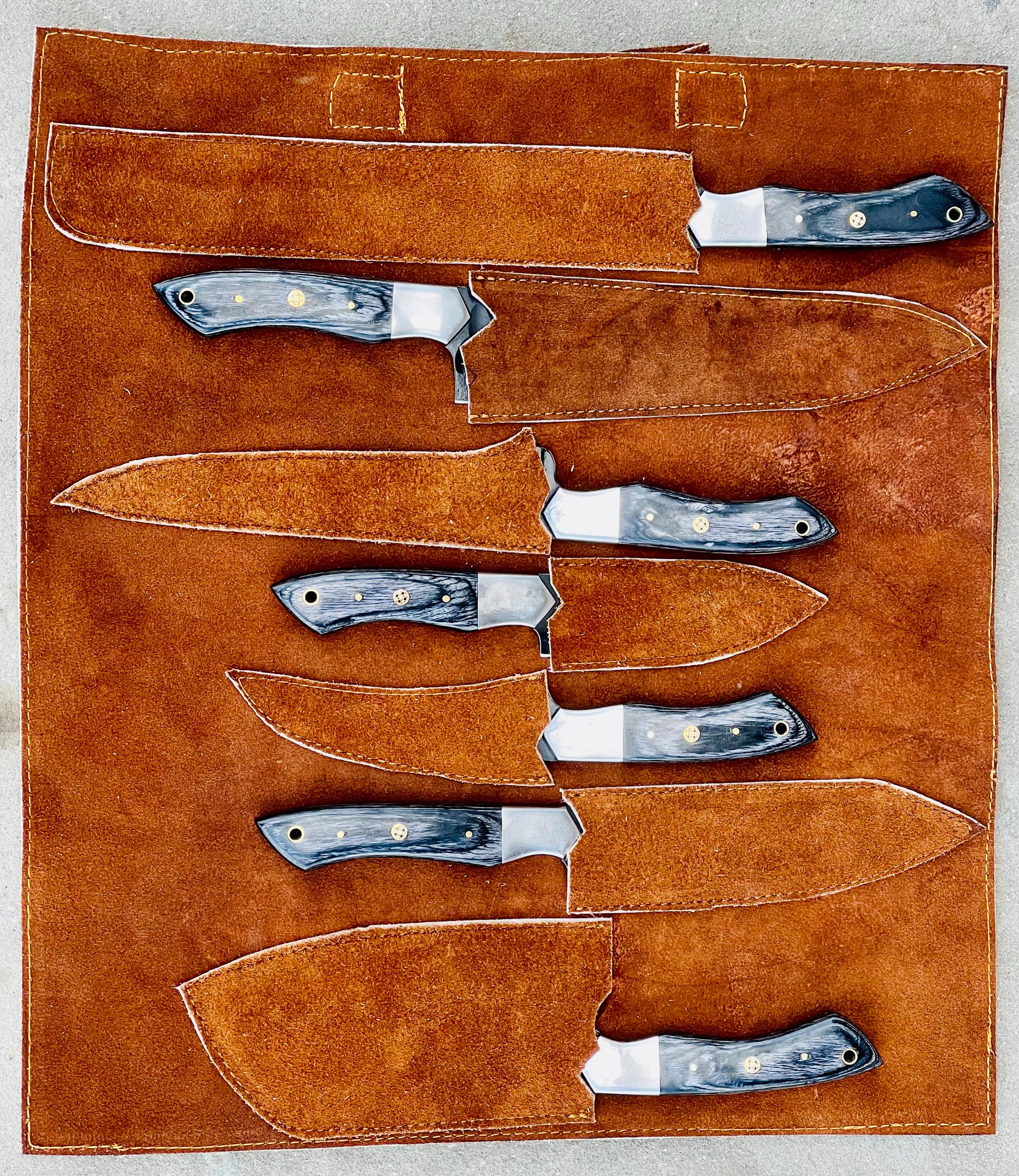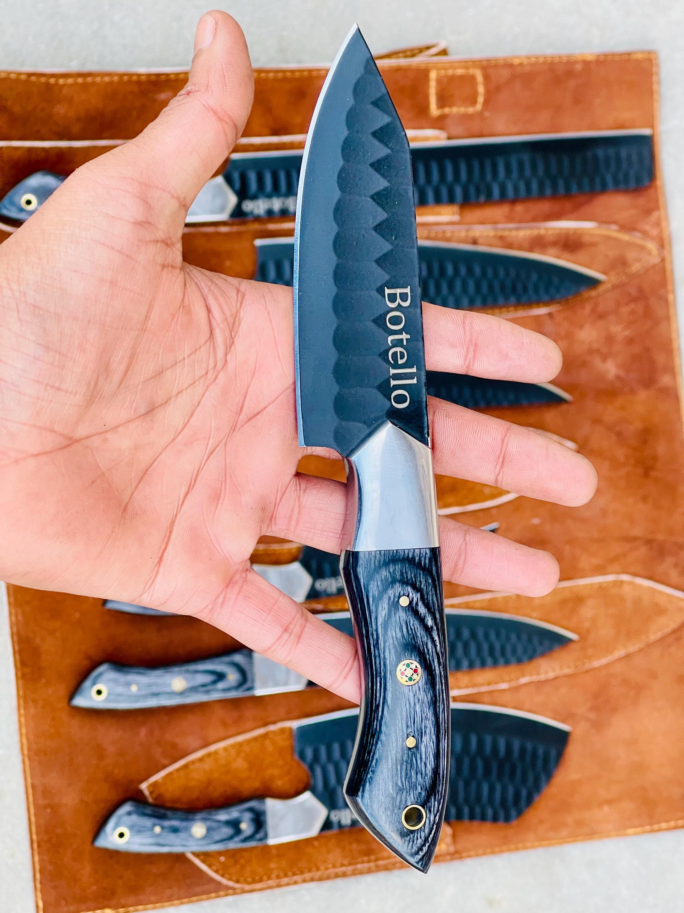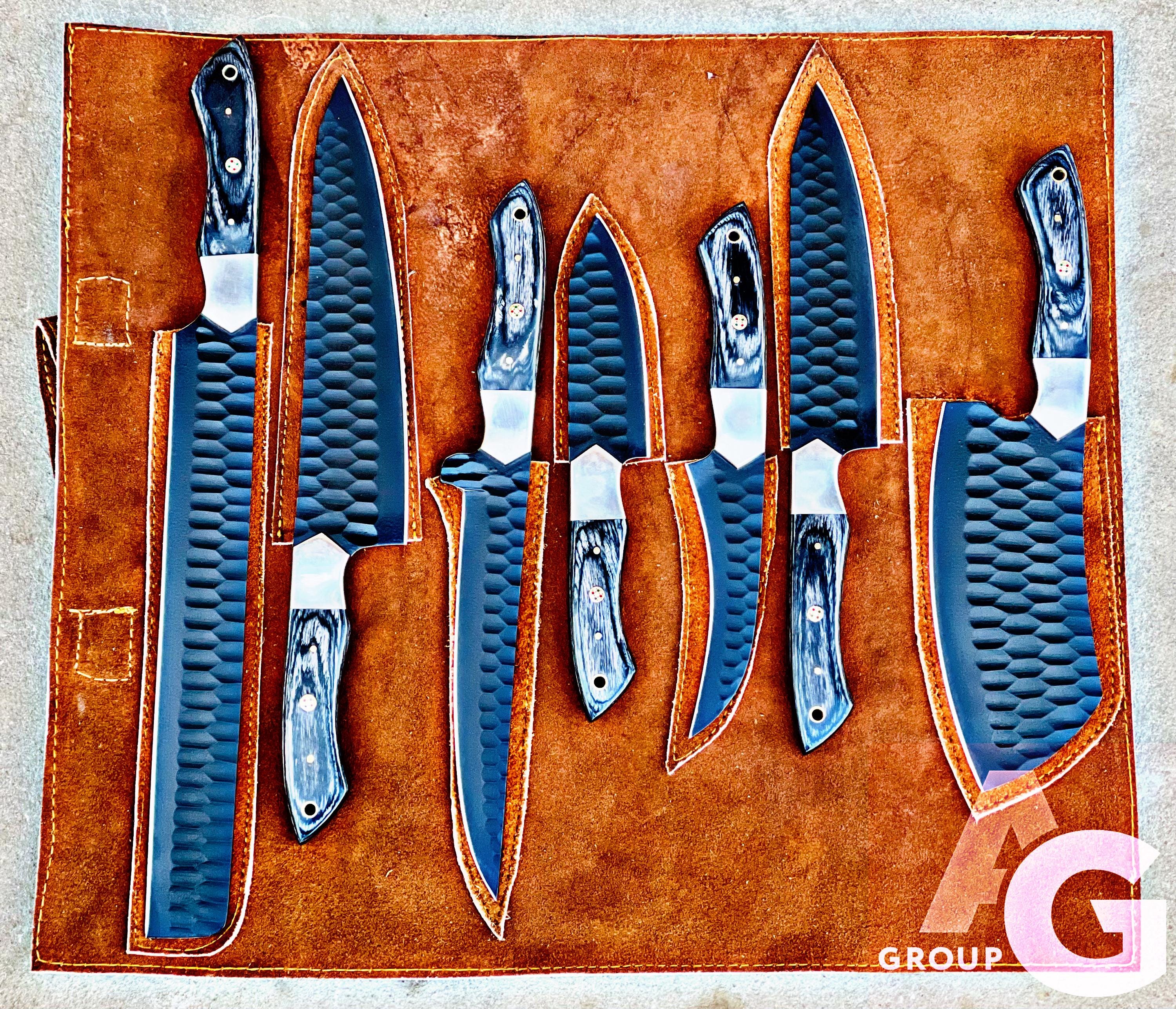Custom Handmade D2 Steel BLACK Dark Kitchen BBQ 7 PCS Chef Knives Set Overall Length: 8.5 to 15 '' Inches Handle Length: 5.0'' Inches Handle Material: BLACK DARK Blade Material: D2 STEEL Sweet Leather Roll Kit Excellent husband wife gift Wedding gift Father's Day gift Mother's Day gift Birthday Gift Groomsmen gift Christmas gift Best Knife Gift Luxury Handmade Gifts