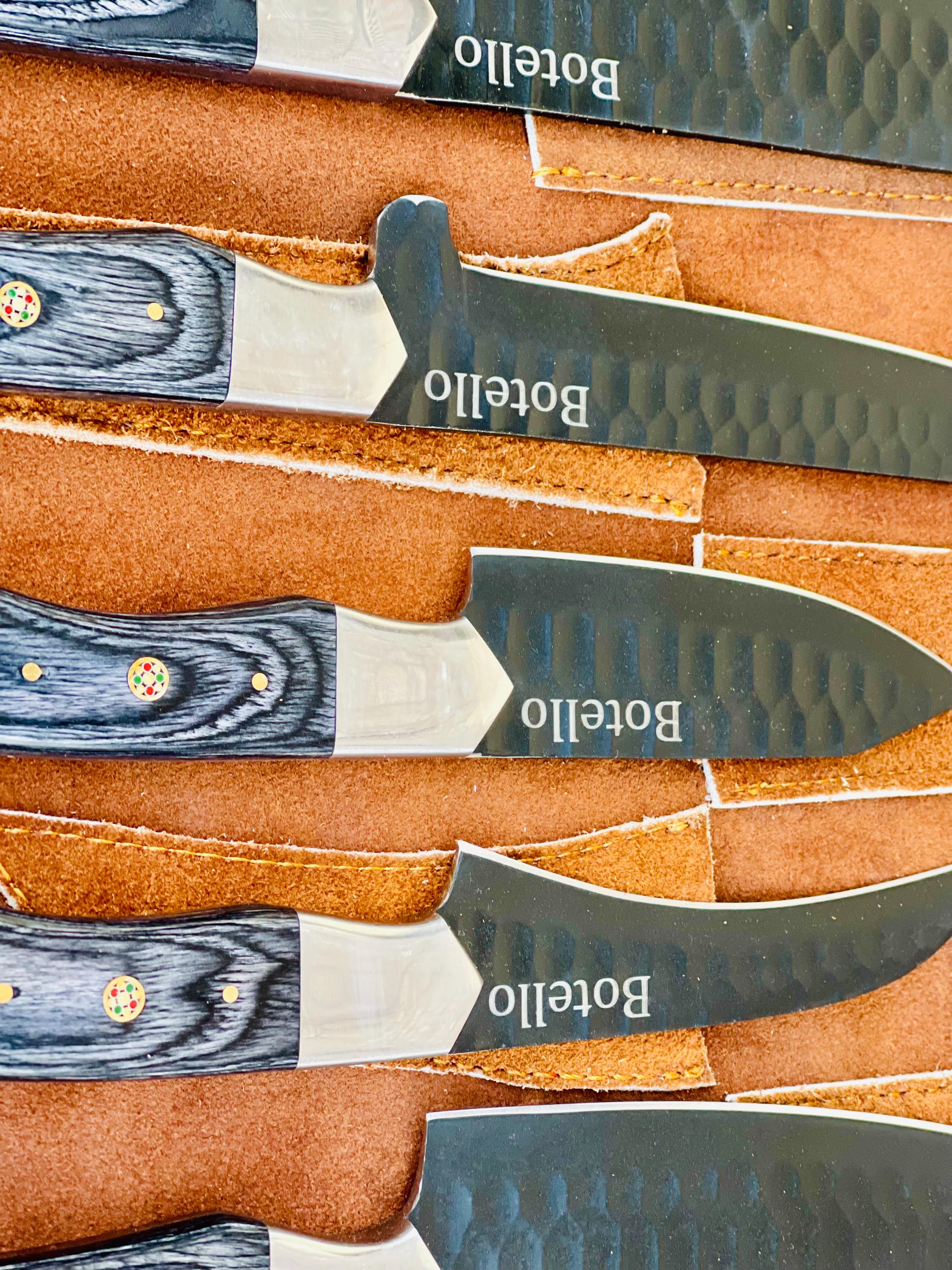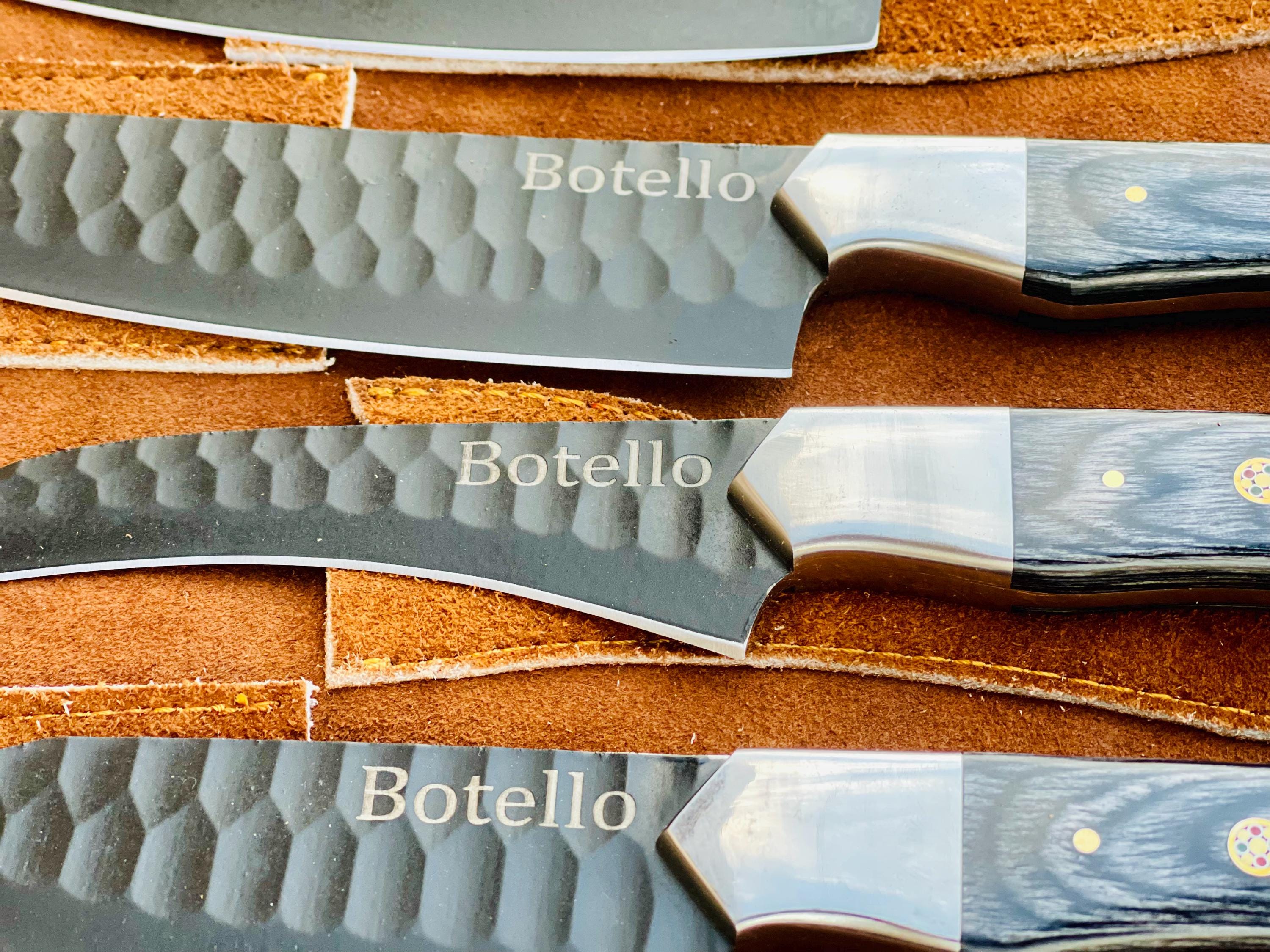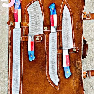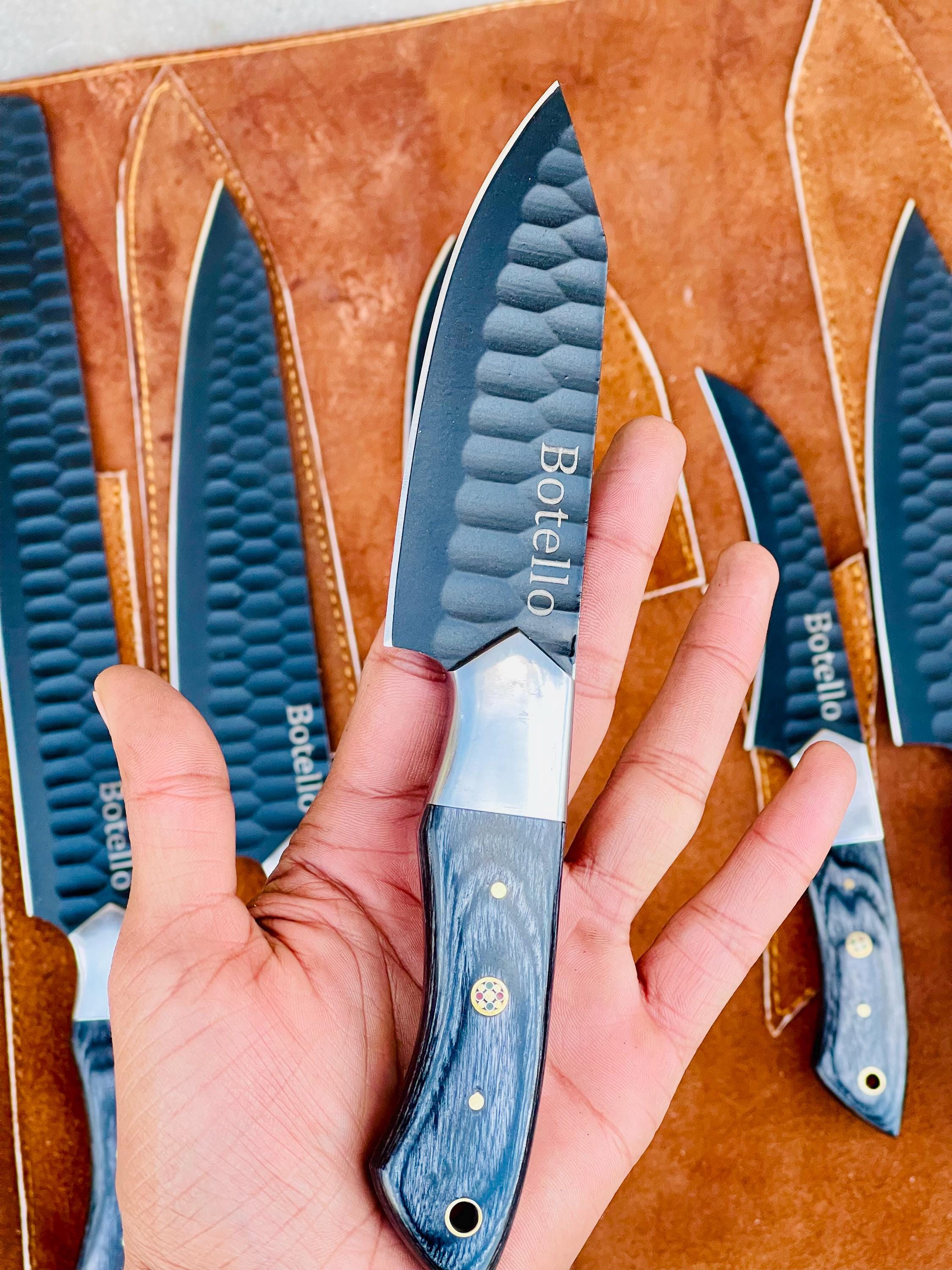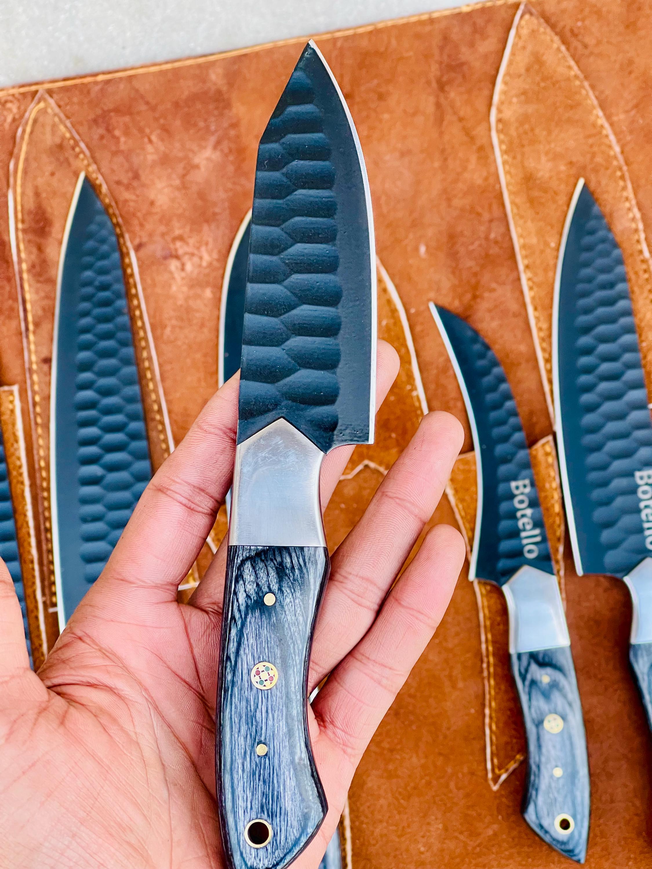 Custom Handmade D2 Steel BLACK Dark Kitchen BBQ 7 PCS Chef Knives Set Overall Length: 8.5 to 15 '' Inches Handle Length: 5.0'' Inches Handle Material: BLACK DARK Blade Material: D2 STEEL Sweet Leather Roll Kit Excellent husband wife gift Wedding gift Father's Day gift Mother's Day gift Birthday Gift Groomsmen gift Christmas gift Best Knife Gift Luxury Handmade Gifts