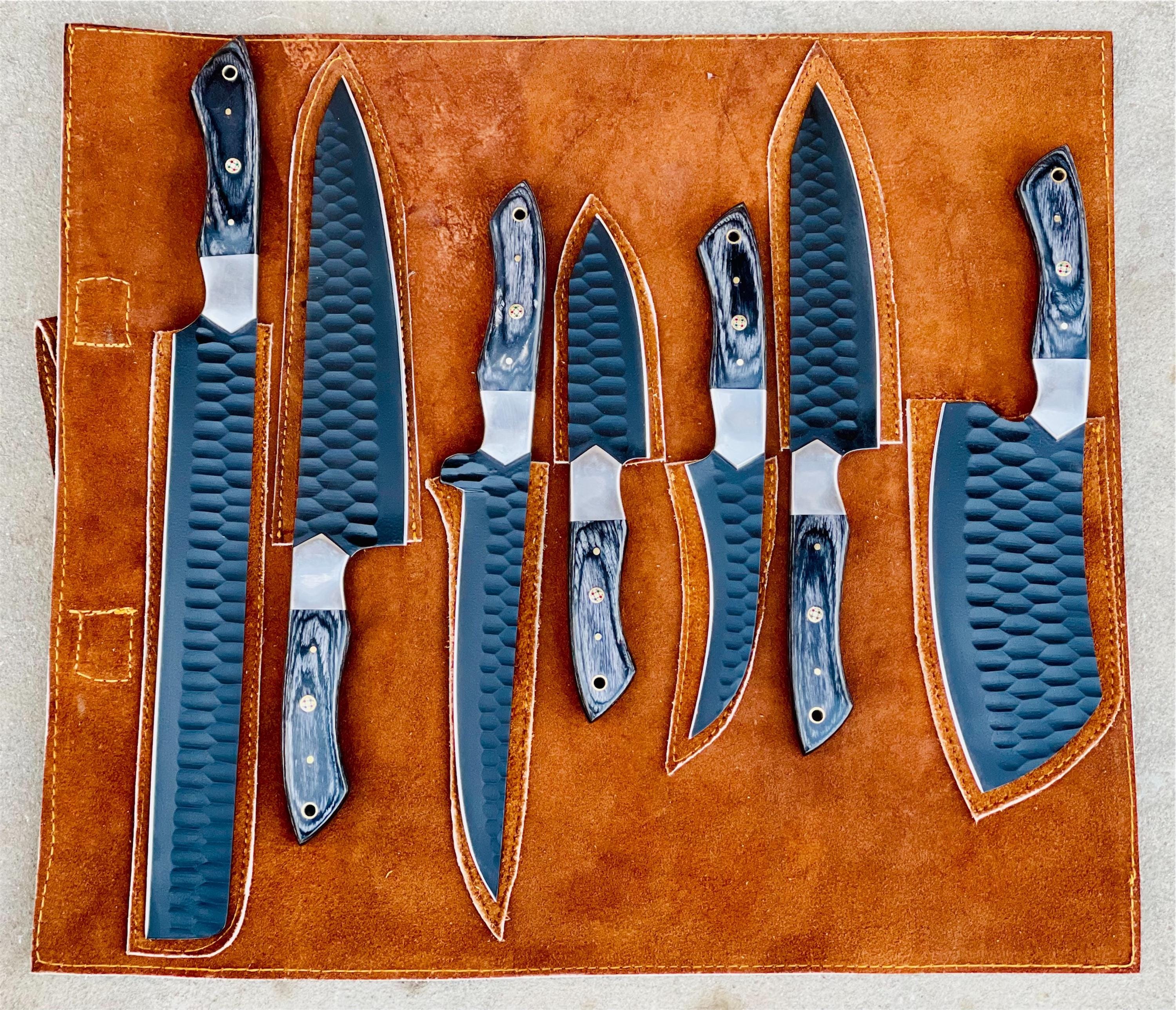 7-Piece D2 Steel Chef Knife Set | Forged Hammered Black Blades, Leather Roll Bag