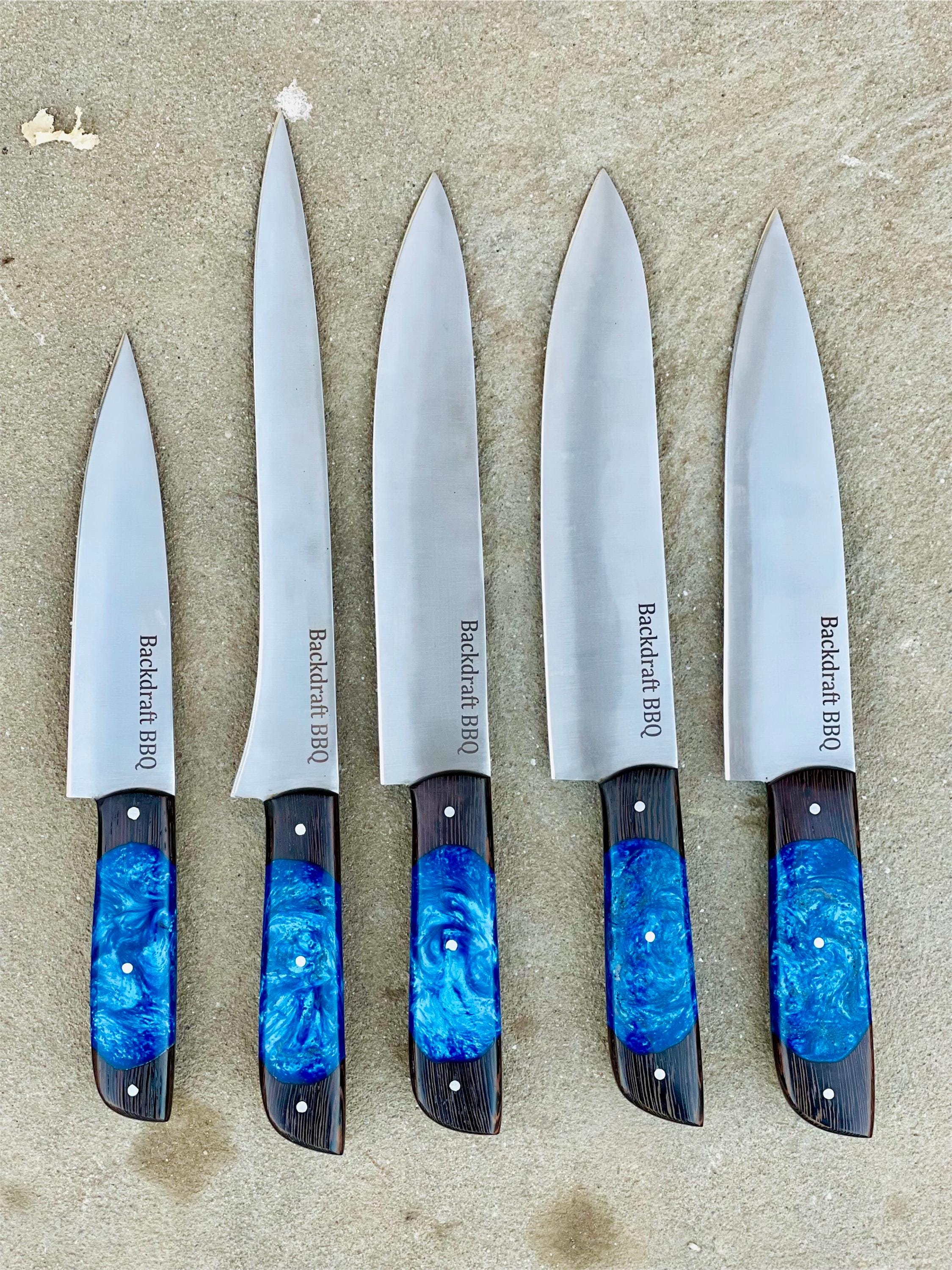 Take your culinary skills to the next level with this stunning 5-piece professional knife set. Engineered for precision and designed to turn heads, these knives feature a striking "Backdraft BBQ" branding on the blades, signaling high-performance tools for both the kitchen and the grill.