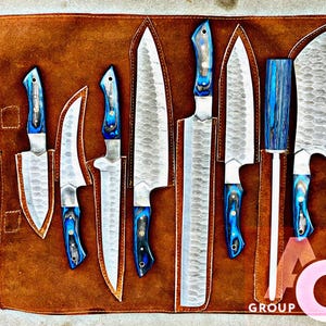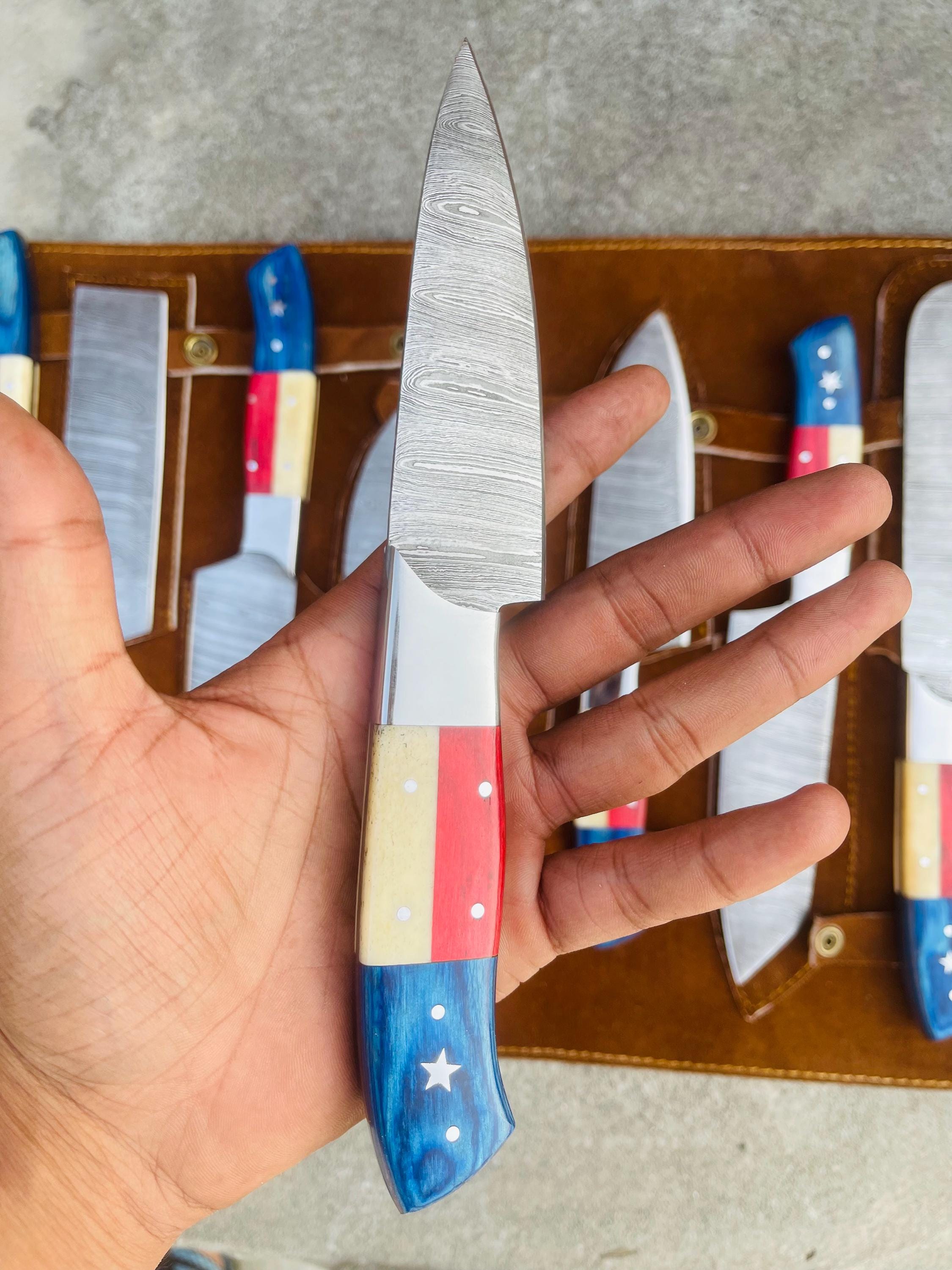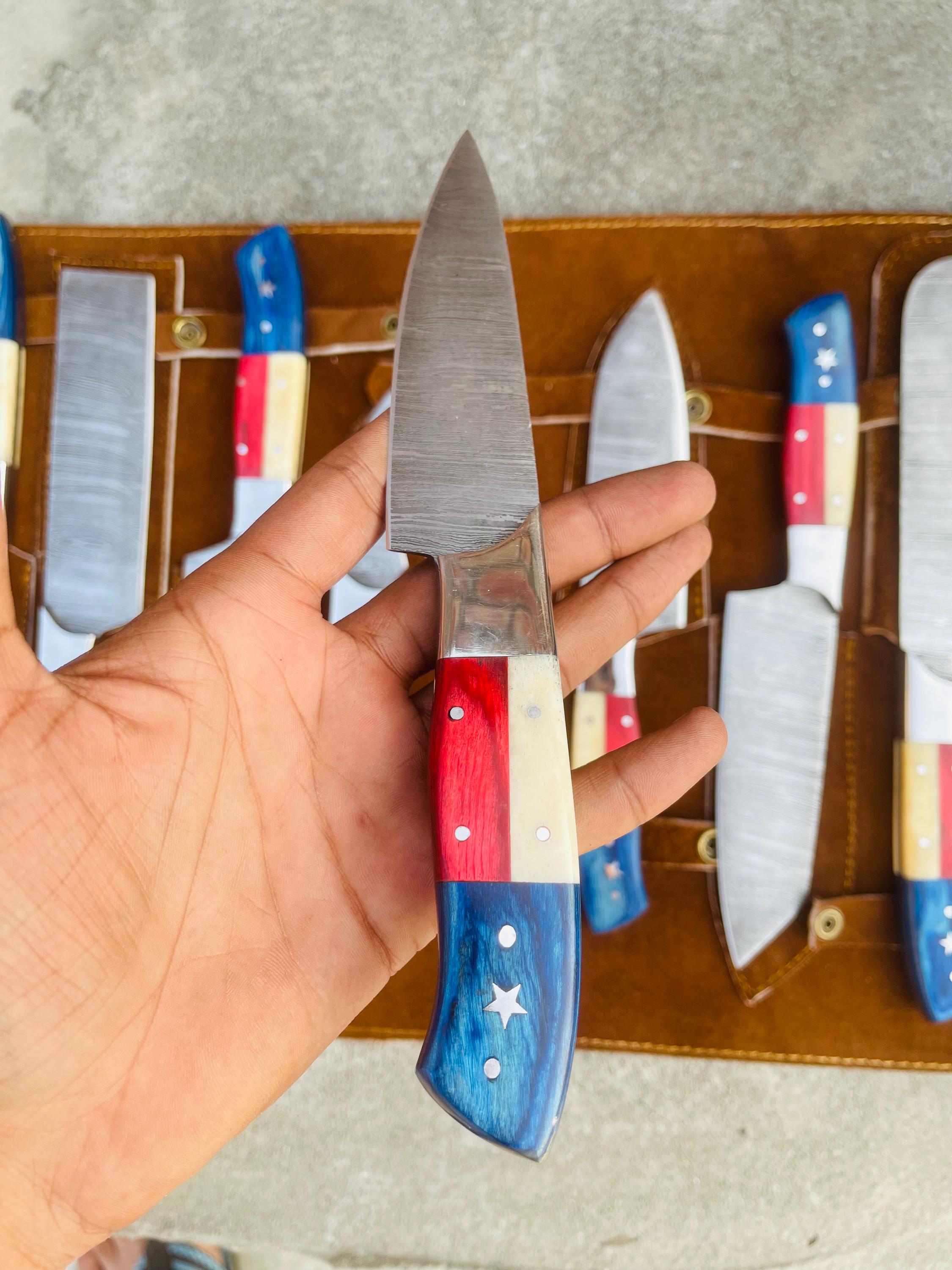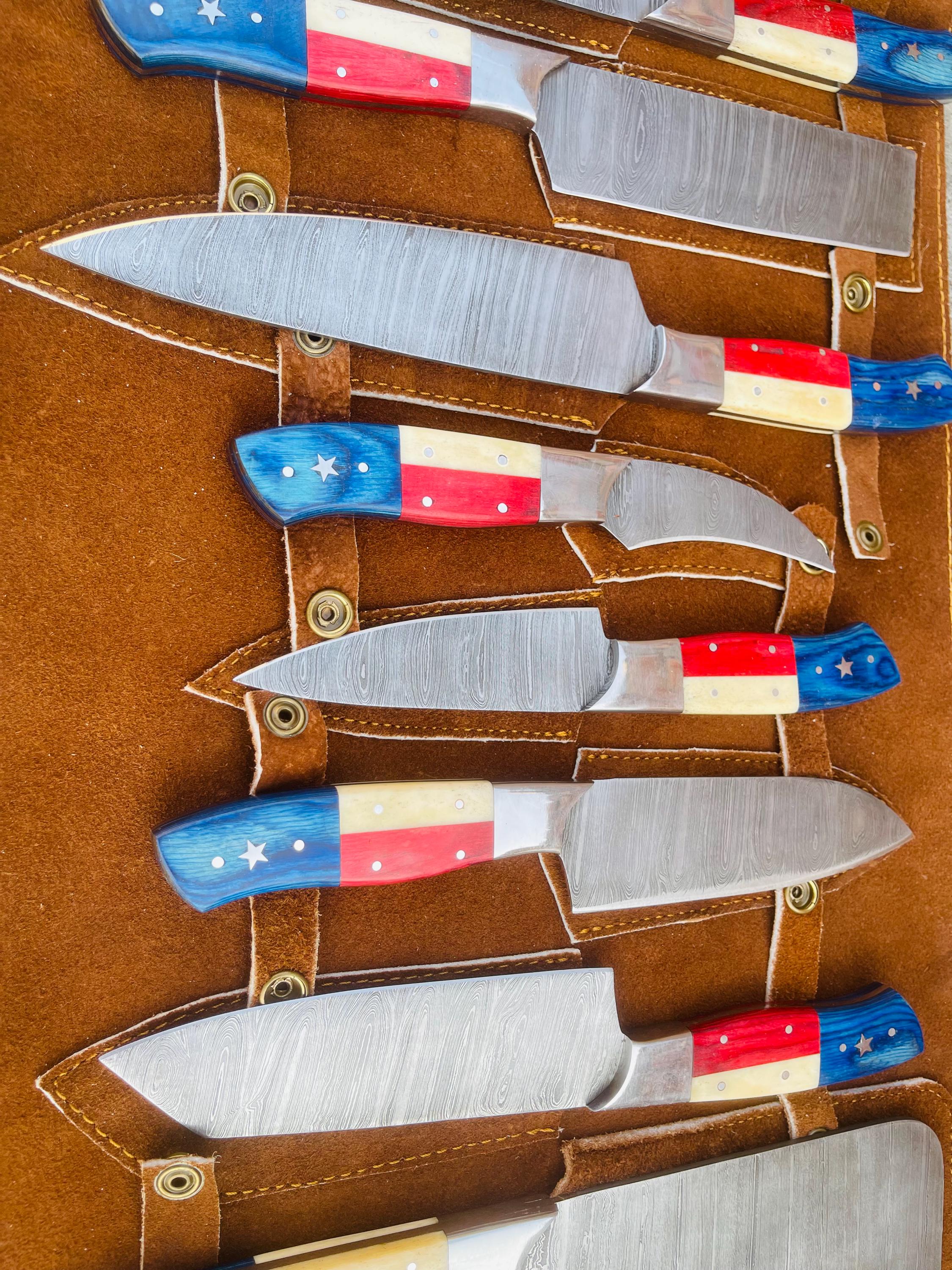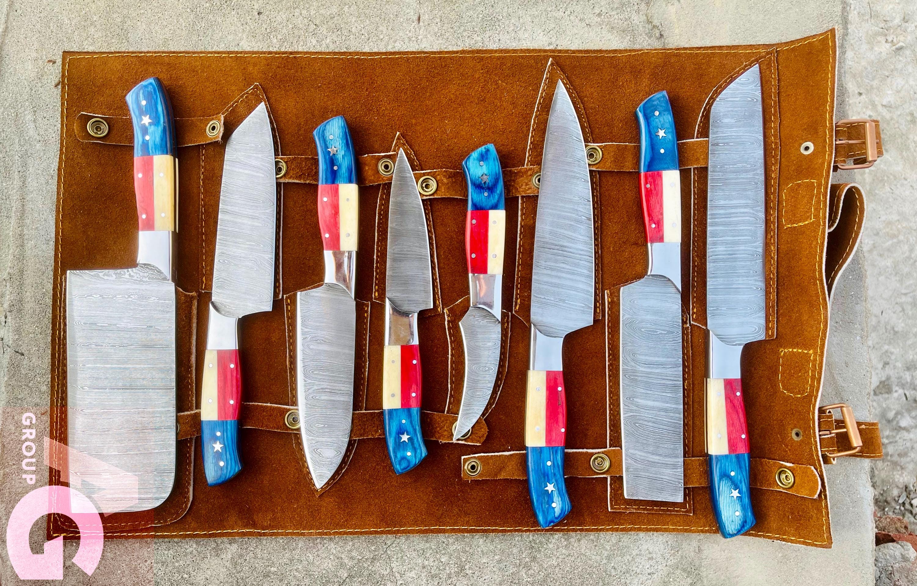 Custom Handmade Damascus Steel Kitchen BBQ 8 PCS TEXAS FLAG Chef Knives Set Overall Length: 8.5 to 12. '' Inches Handle Length: 5.0'' Inches Handle Material : TEXAS FLAG Blade Material: Damascus Steel Sweet Leather Roll Kit Excellent husband wife gift Wedding gift Father's Day gift Mother's Day gift Birthday Gift Groomsmen gift Christmas gift Best Knife Gift Luxury Handmade Gifts