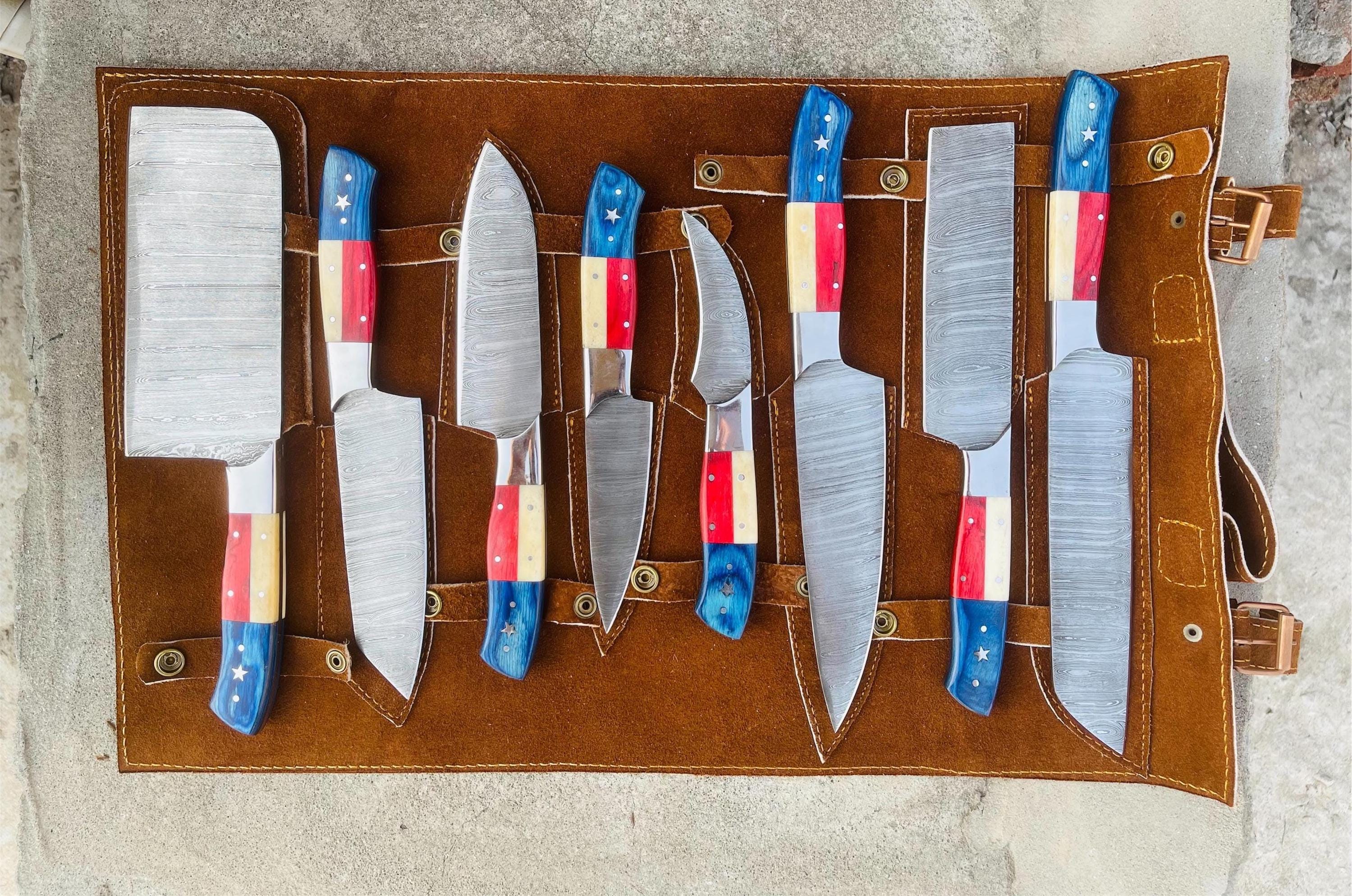Custom Handmade Damascus Steel Kitchen Knife Set – 8 Piece Chef Set with Texas Flag Handles