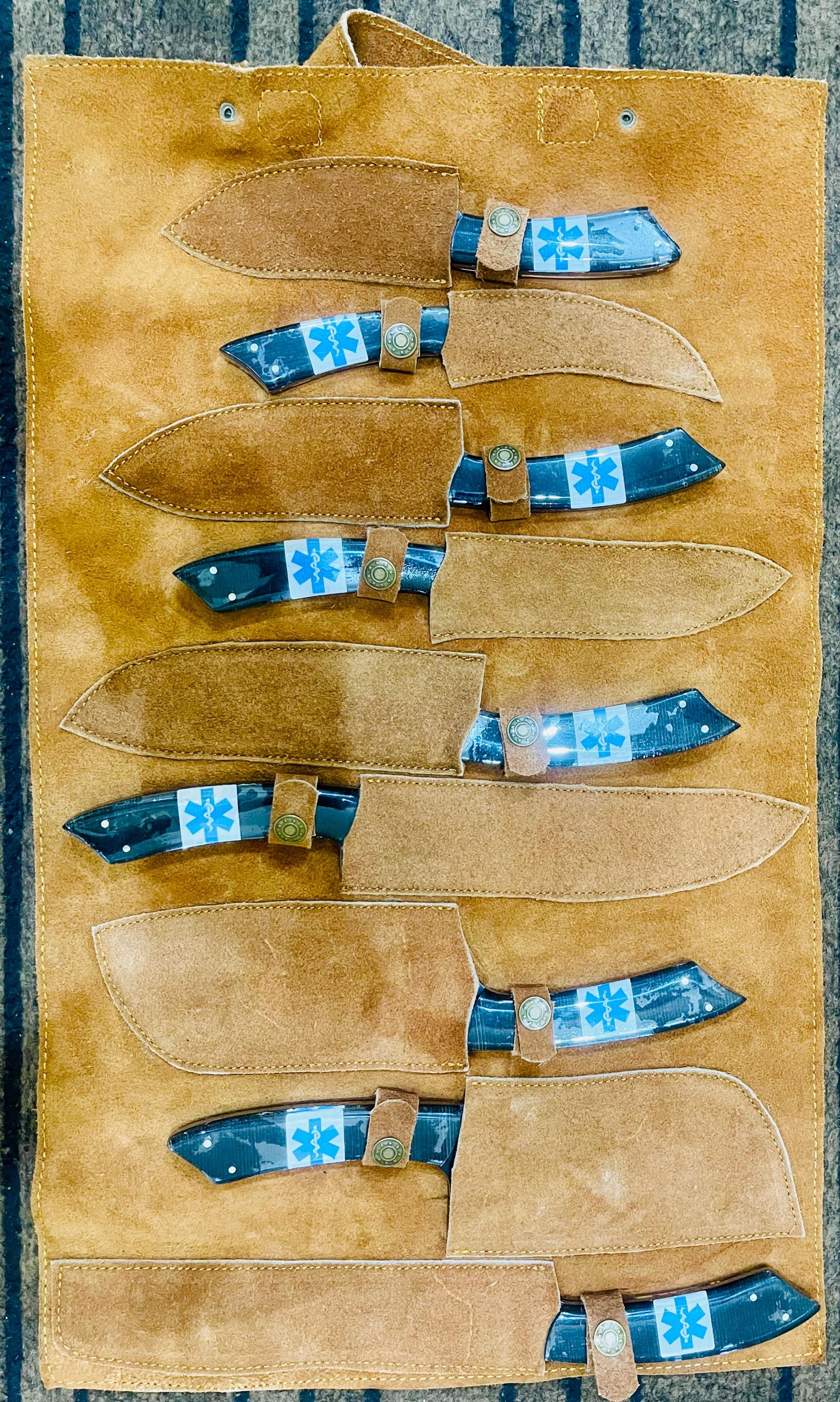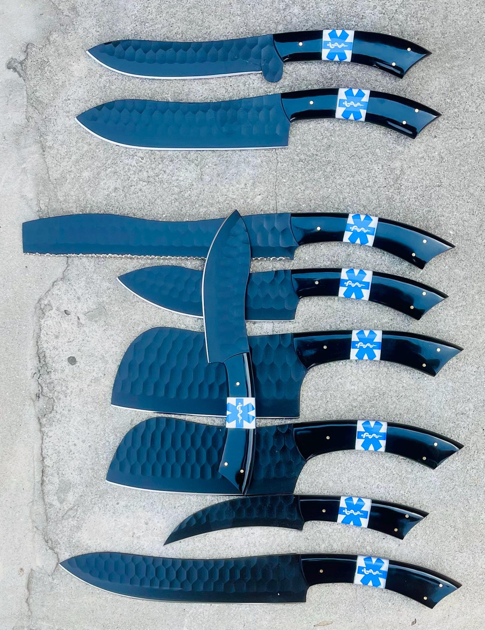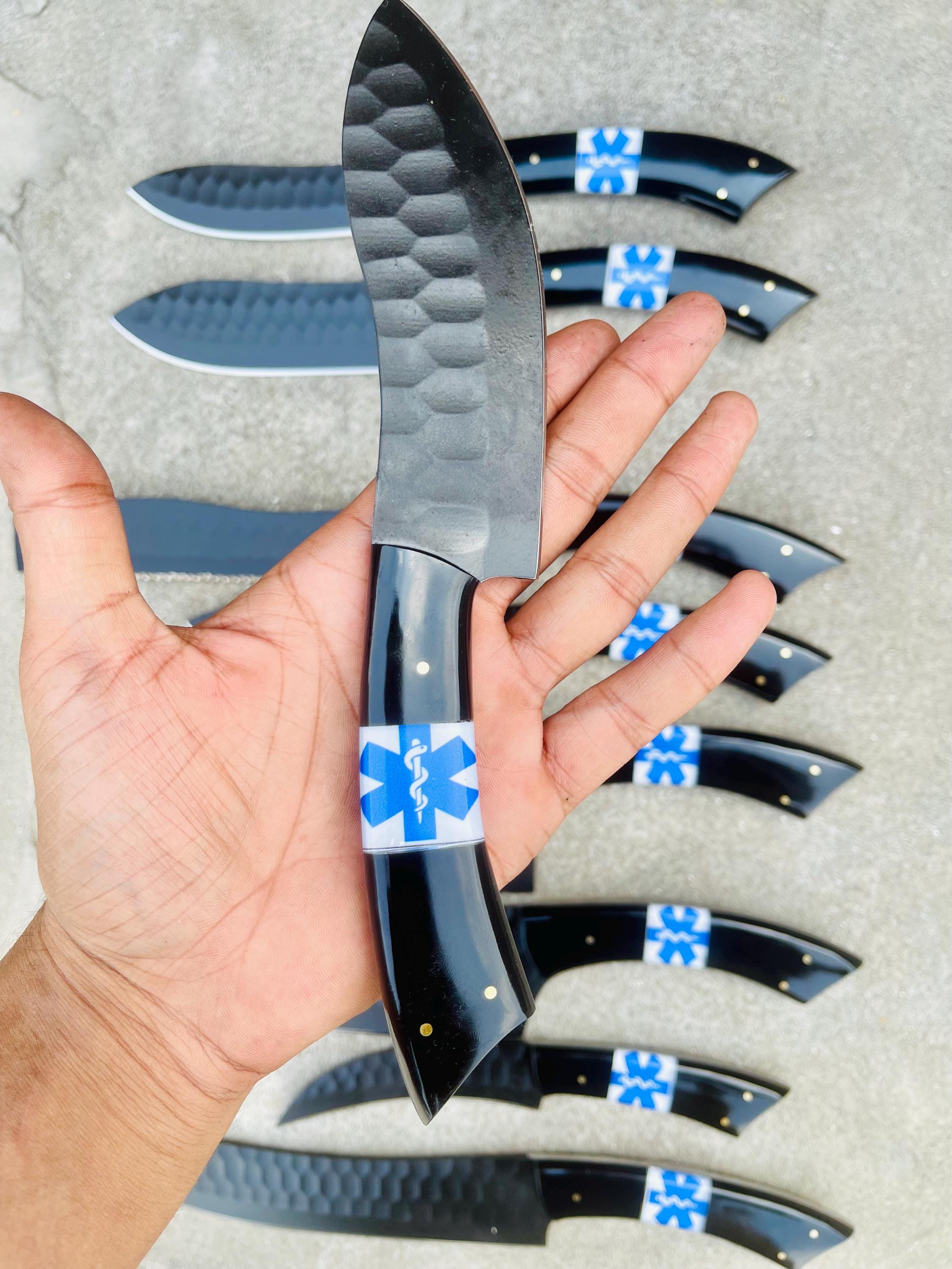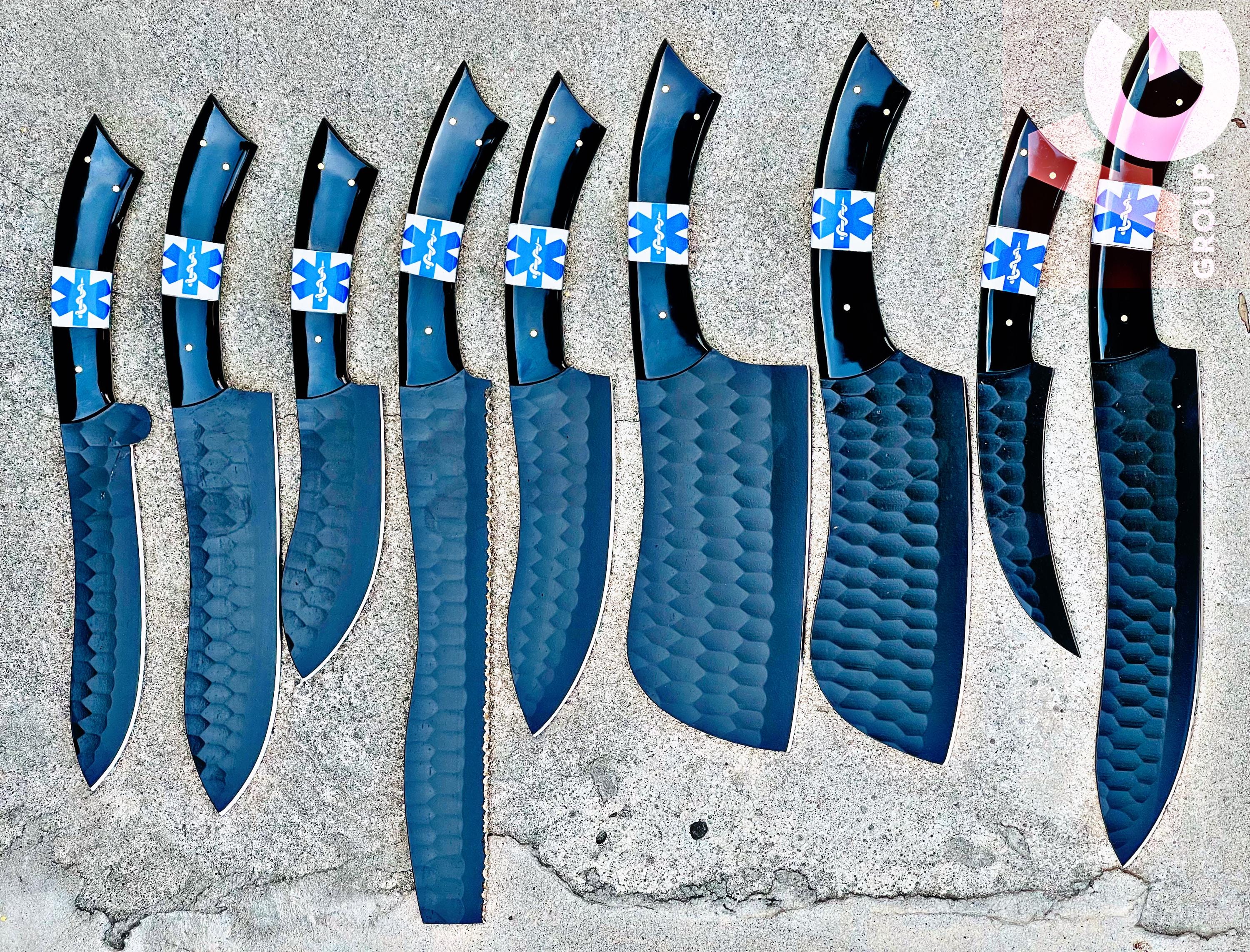 Custom Handmade D2 Steel Kitchen BBQ 9 PCS Chef Knives Set Overall Length: 8.5 to 14 '' Inches Handle Length: 5.0'' Inches Handle Material: Black handles The logo on the knife handle is the Star of Life, a widely recognized international symbol for emergency medical services (EMS). Blade Material: D2 Steel Sweet Leather Roll Kit Excellent husband wife gift Wedding gift Father's Day gift Mother's Day gift Birthday Gift Groomsmen gift Christmas gift Best Knife Gift Luxury Handmade Gifts
