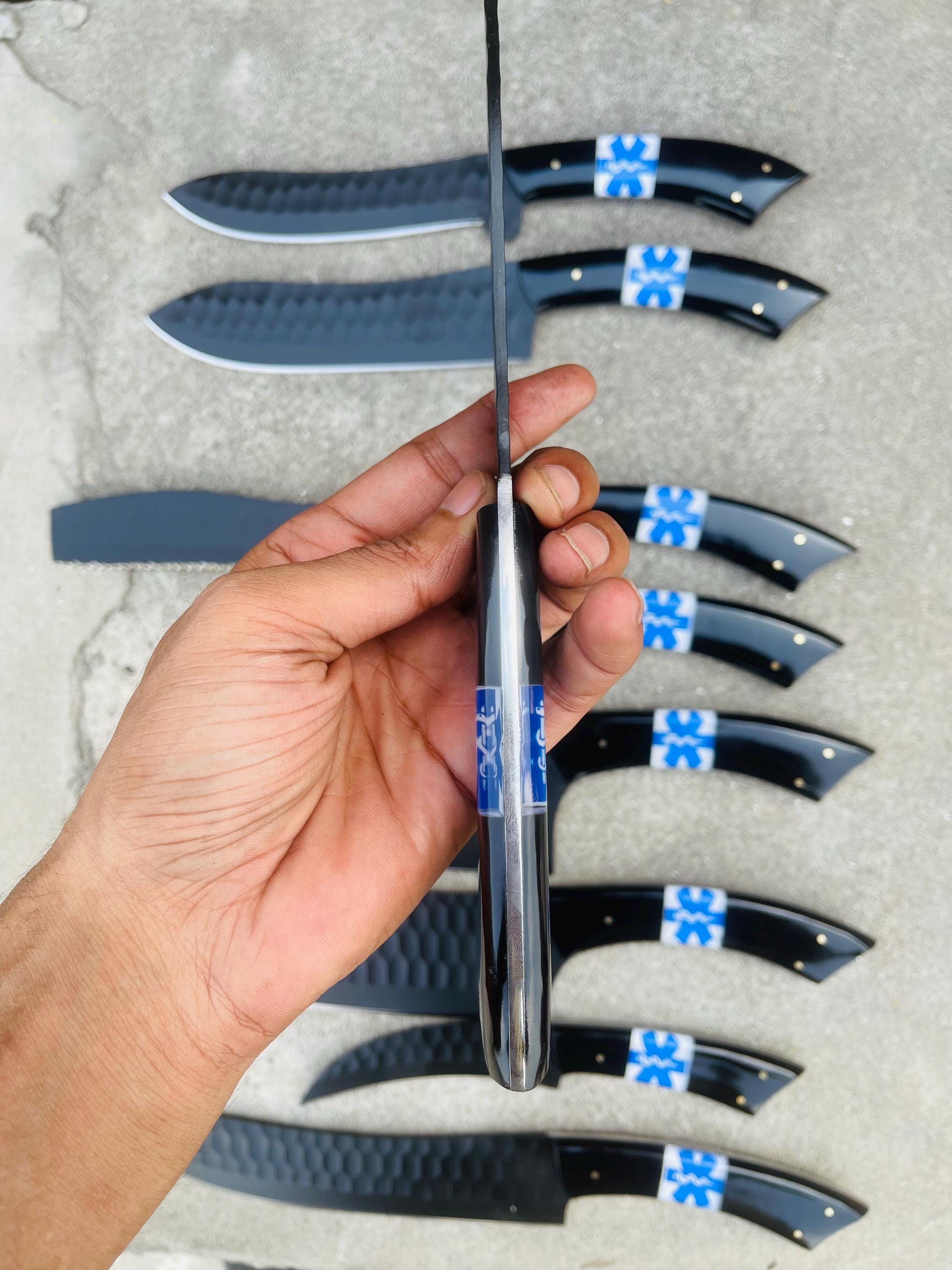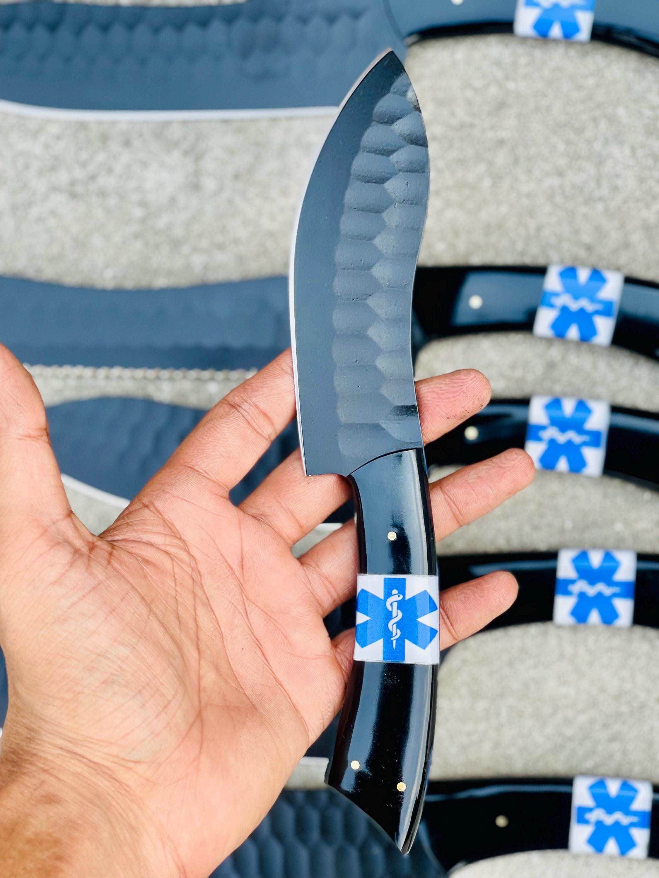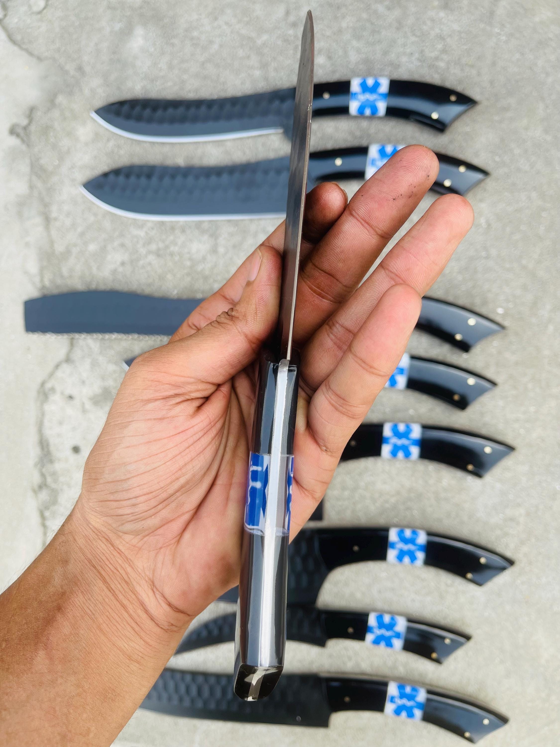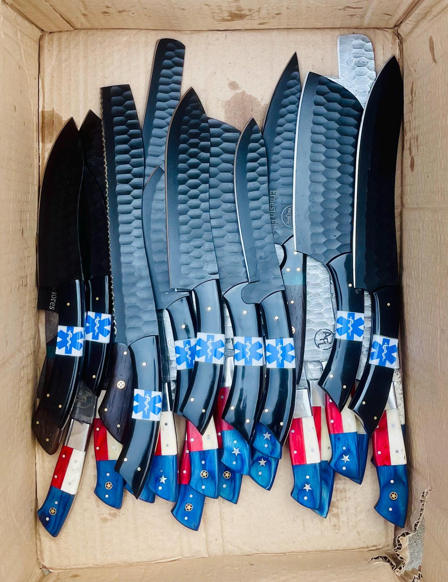 Custom Handmade D2 Steel Kitchen BBQ 9 PCS Chef Knives Set Overall Length: 8.5 to 14 '' Inches Handle Length: 5.0'' Inches Handle Material: Black handles The logo on the knife handle is the Star of Life, a widely recognized international symbol for emergency medical services (EMS). Blade Material: D2 Steel Sweet Leather Roll Kit Excellent husband wife gift Wedding gift Father's Day gift Mother's Day gift Birthday Gift Groomsmen gift Christmas gift Best Knife Gift Luxury Handmade Gifts