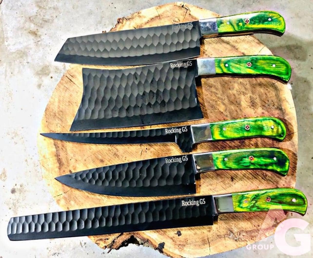 Custom Handmade D2 Steel Green Kitchen BBQ 5 PCS Chef Knives Set Overall Length: 11.5 to 13.5 '' Inches Handle Length: 5.0'' Inches Handle Material: GREEN Blade Material: D2 Steel Sweet Leather Roll Kit Excellent husband wife gift Wedding gift Father's Day gift Mother's Day gift Birthday Gift Groomsmen gift Christmas gift Best Knife Gift Luxury Handmade Gifts