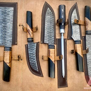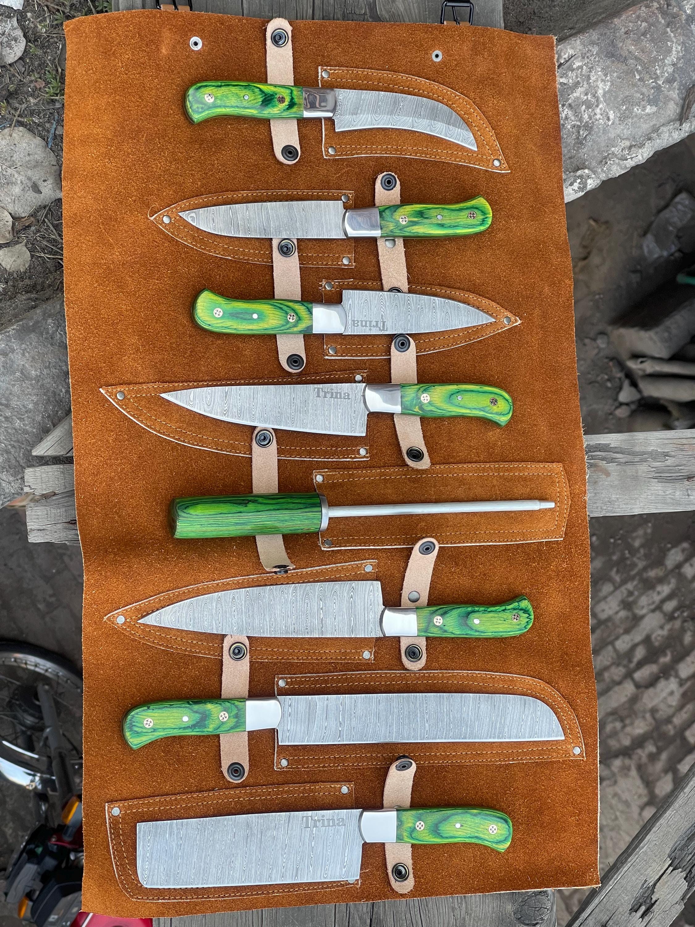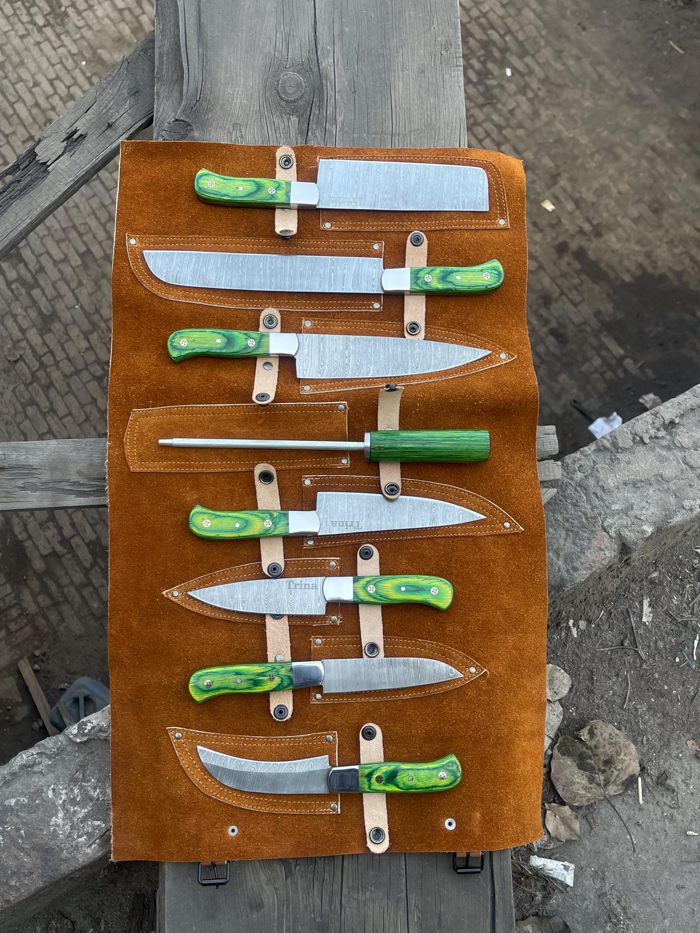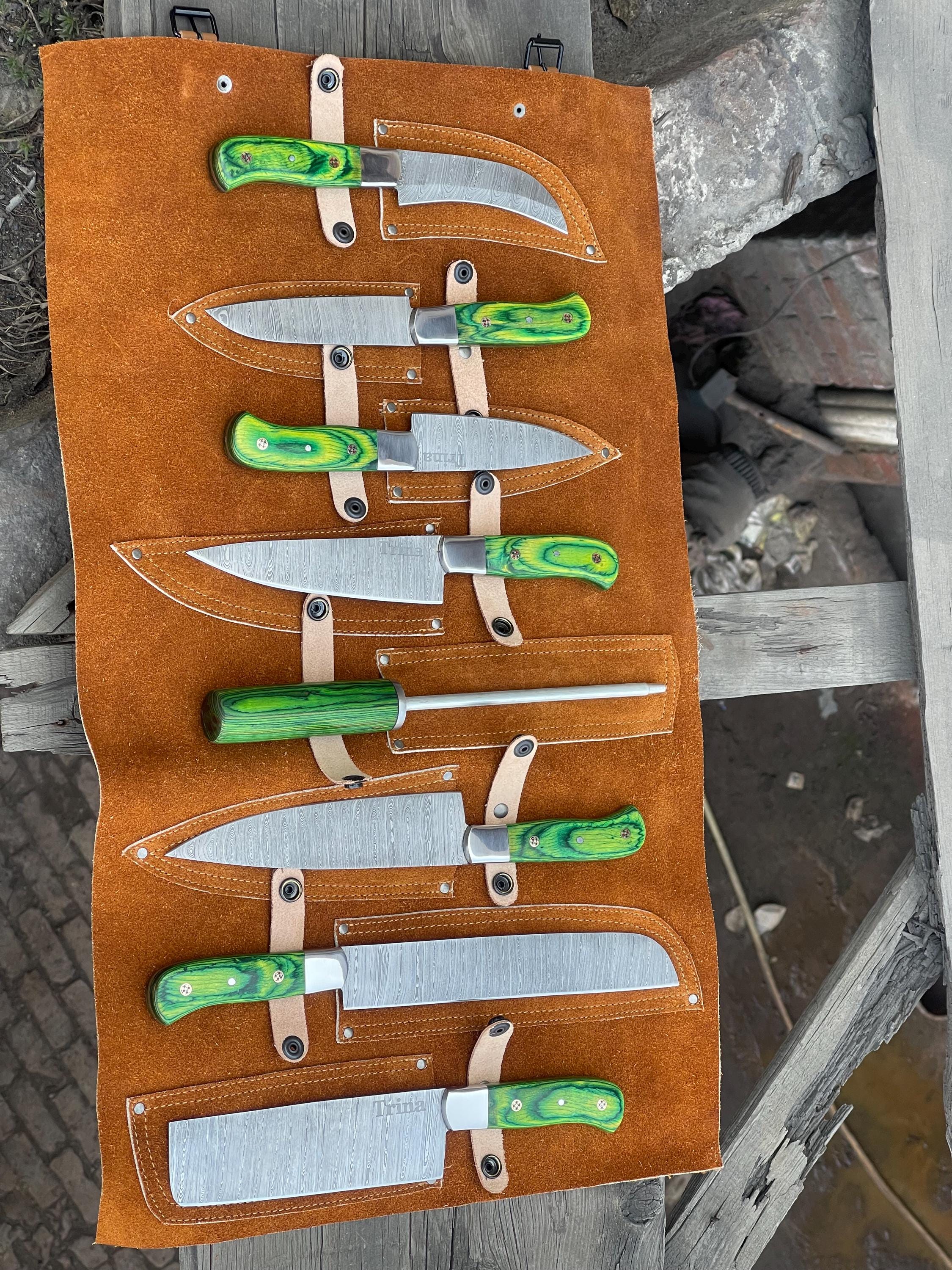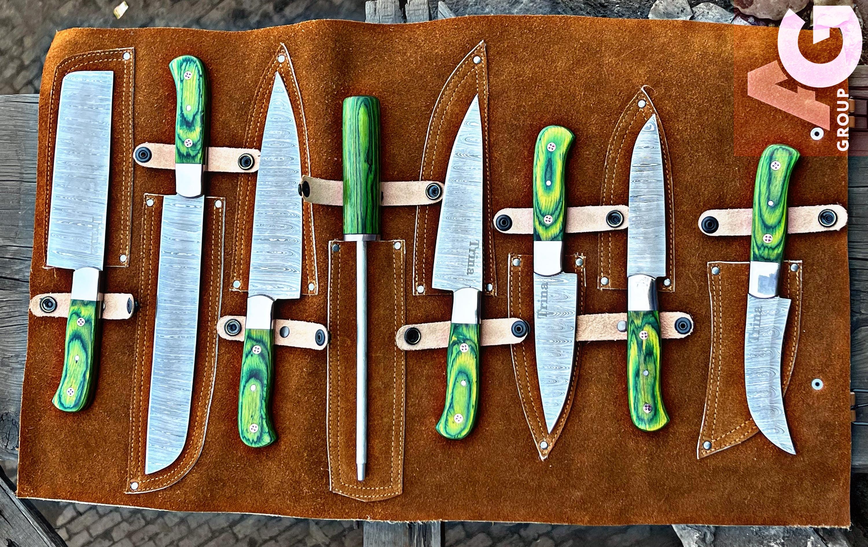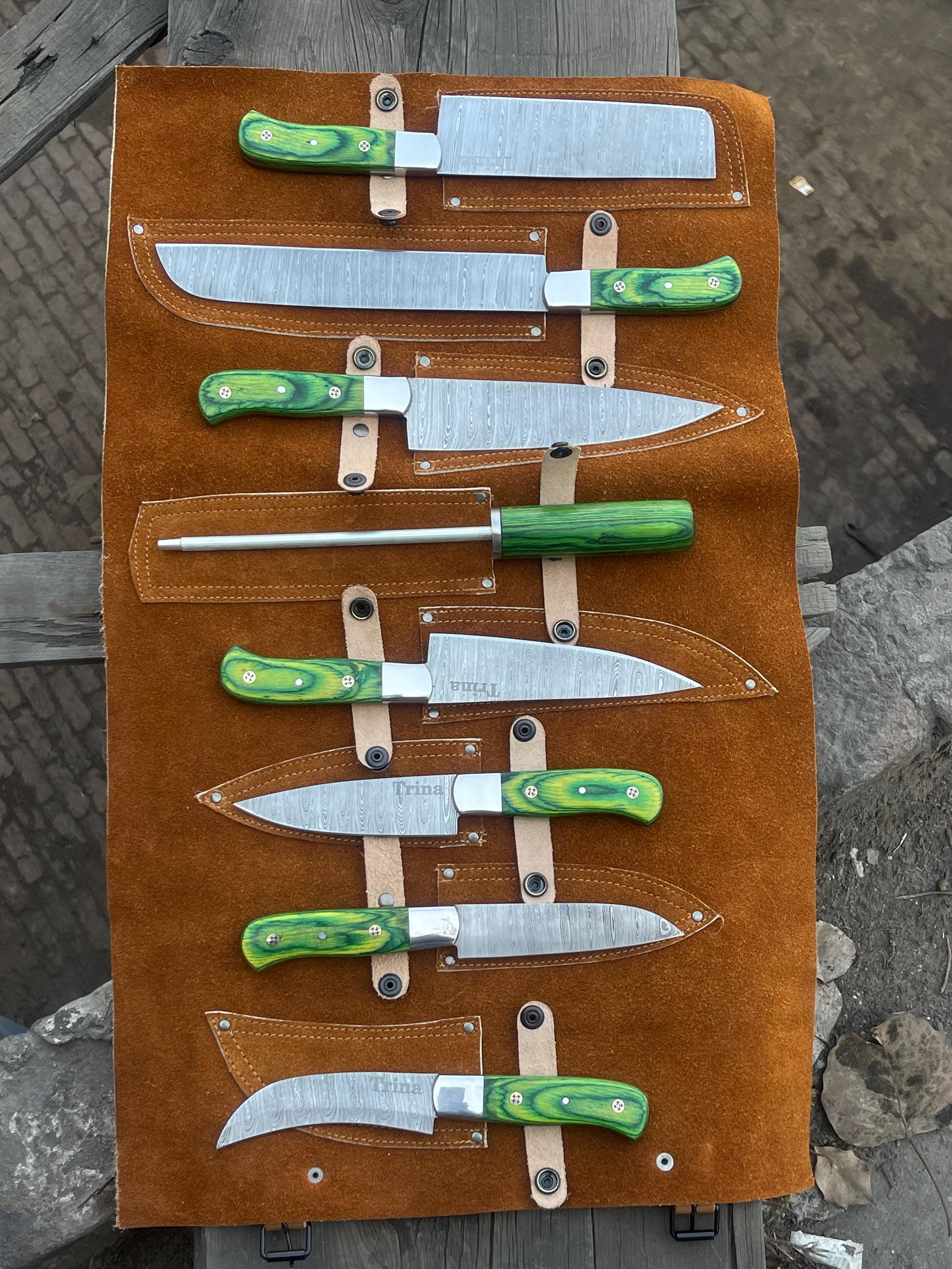 Custom Handmade Damascus Steel Green Kitchen BBQ 8 PCS Chef Knives Set Overall Length: 8.5 to 15 '' Inches Handle Length: 5.0'' Inches Handle Material: GREEN DARK Blade Material: Damascus Steel Sweet Leather Roll Kit Excellent husband wife gift Wedding gift Father's Day gift Mother's Day gift Birthday Gift Groomsmen gift Christmas gift Best Knife Gift Luxury Handmade Gifts