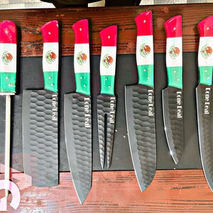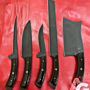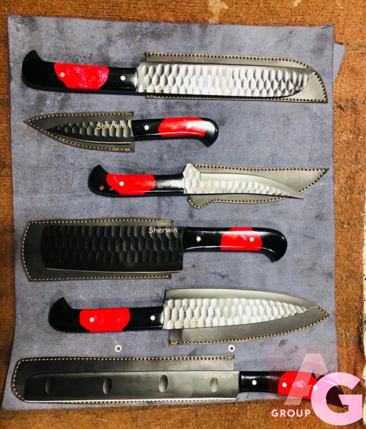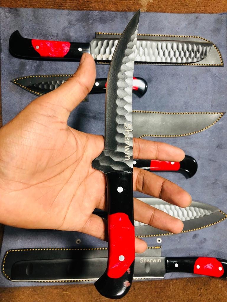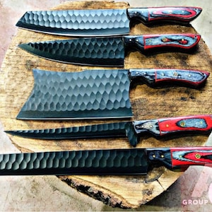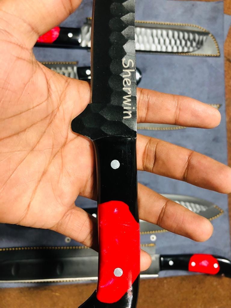 Custom Handmade D2 Steel red black mix Kitchen BBQ 6 PCS Chef Knives Set Overall Length: 8 to 14 '' Inches Handle Length: 5.0'' Inches Handle Material: RED BLACK RESIN Blade Material: D2 steel Sweet Leather Roll Kit Excellent husband wife gift Wedding gift Father's Day gift Mother's Day gift Birthday Gift Groomsmen gift Christmas gift Best Knife Gift Luxury Handmade Gifts