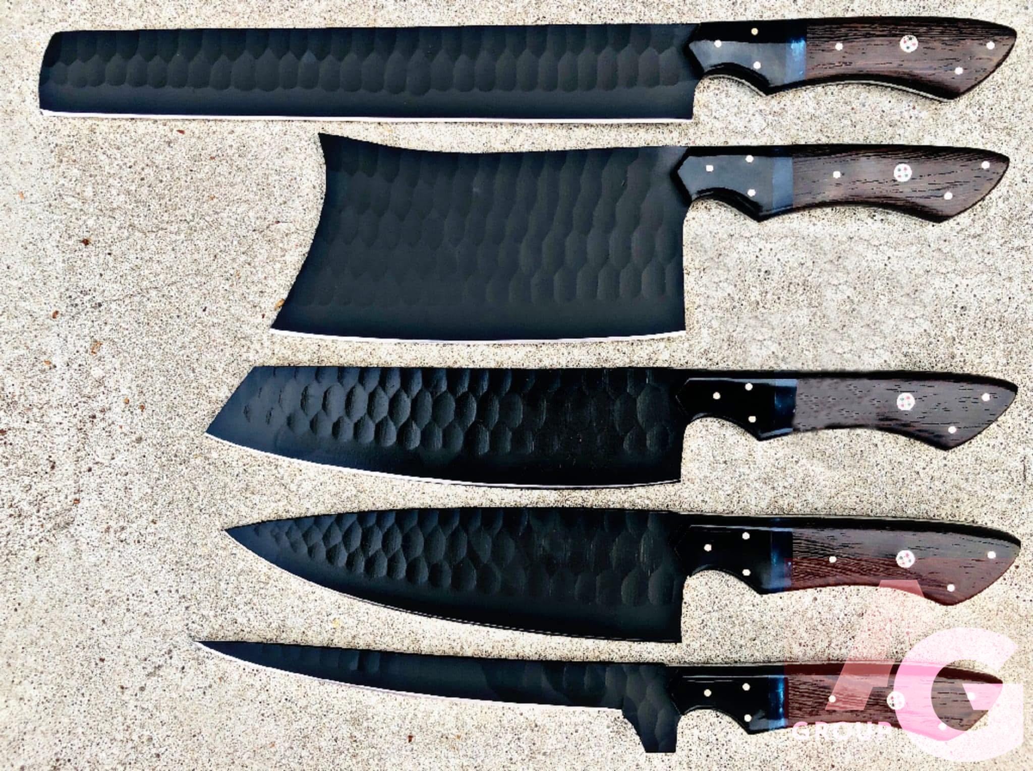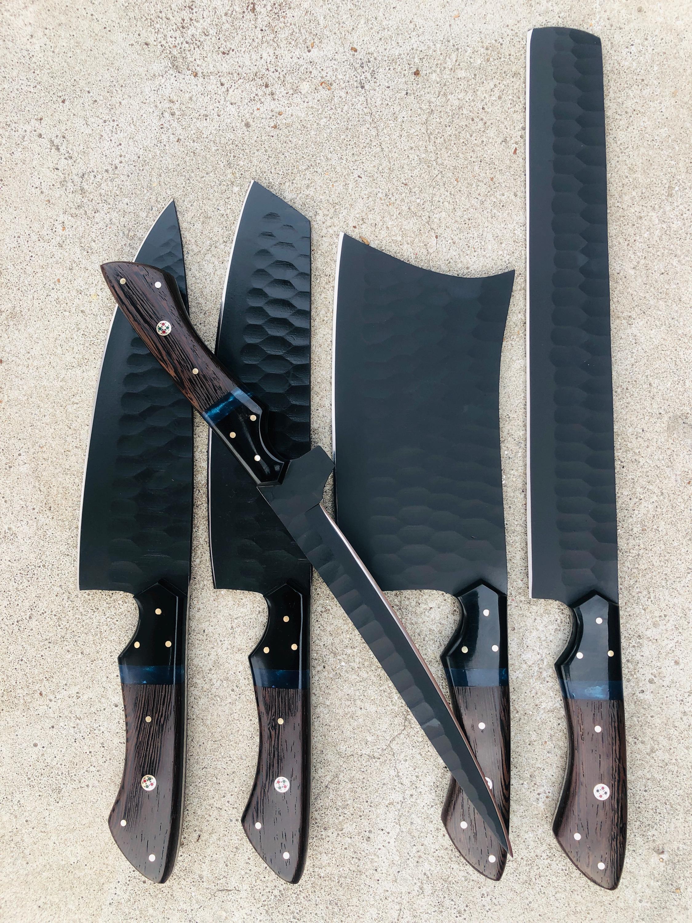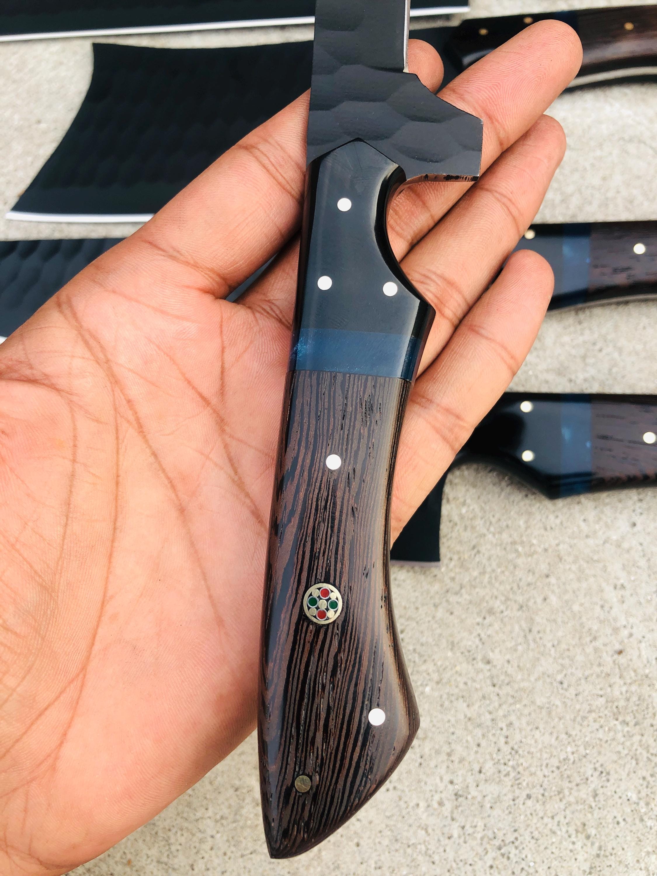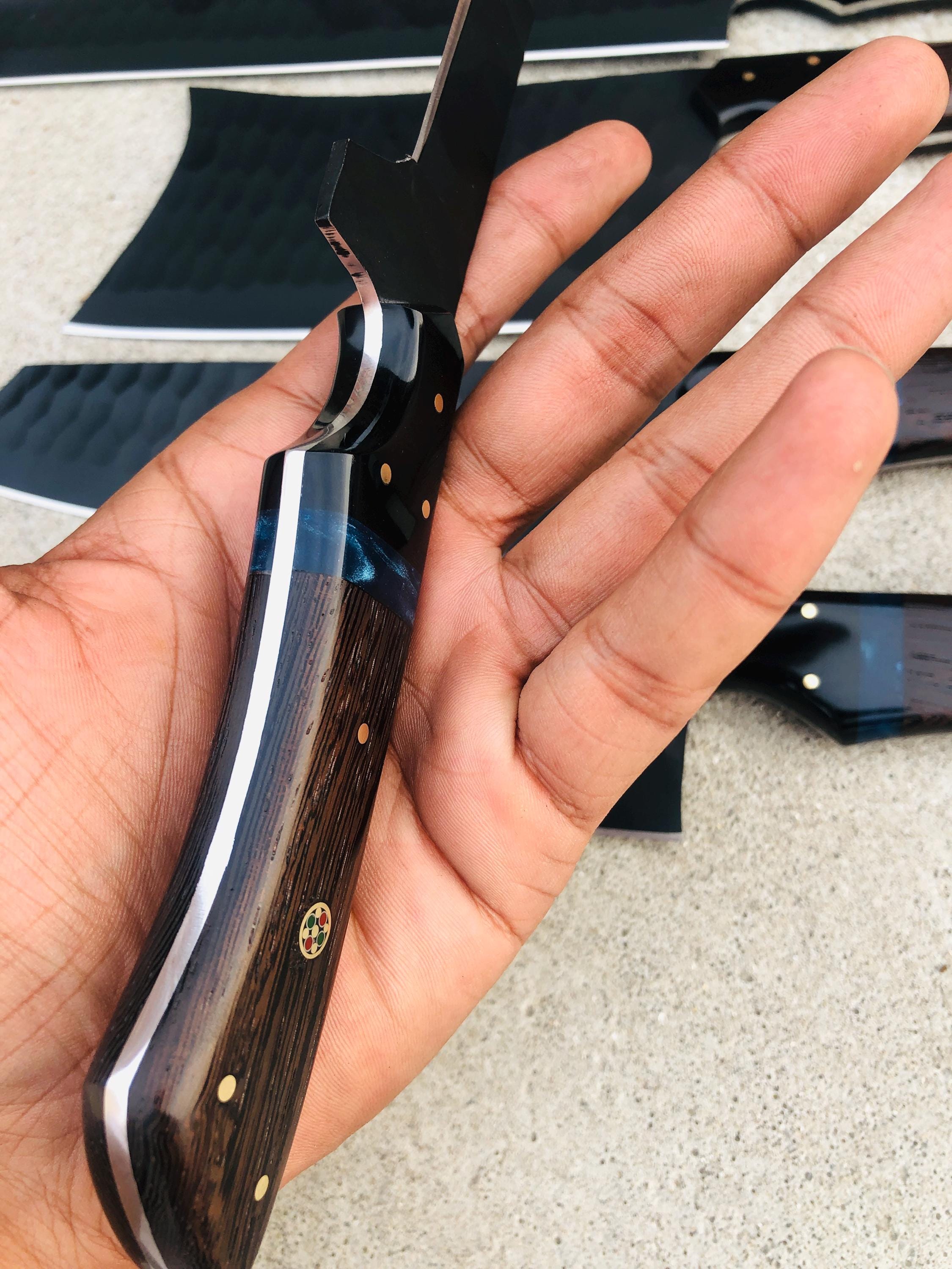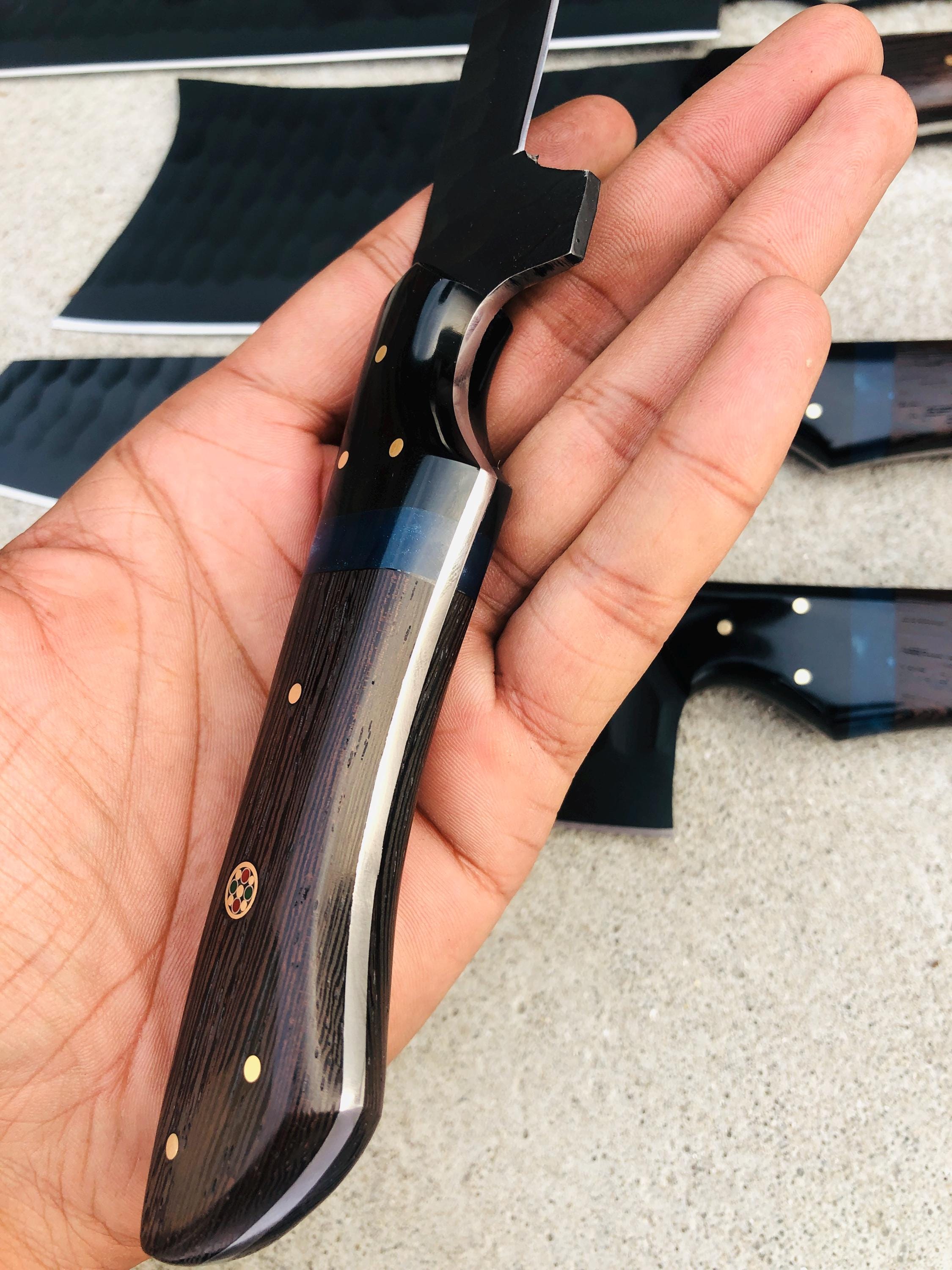Custom Handmade D2 Steel Black Blue Wenge Kitchen BBQ 5 PCS Chef Knives Set Overall Length: 11.5 to 13.5 '' Inches Handle Length: 5.0'' Inches Handle Material: Black Blue Wenge Resin Blade Material: D2 Steel Sweet Leather Roll Kit Excellent husband wife gift Wedding gift Father's Day gift Mother's Day gift Birthday Gift Groomsmen gift Christmas gift Best Knife Gift Luxury Handmade Gifts
