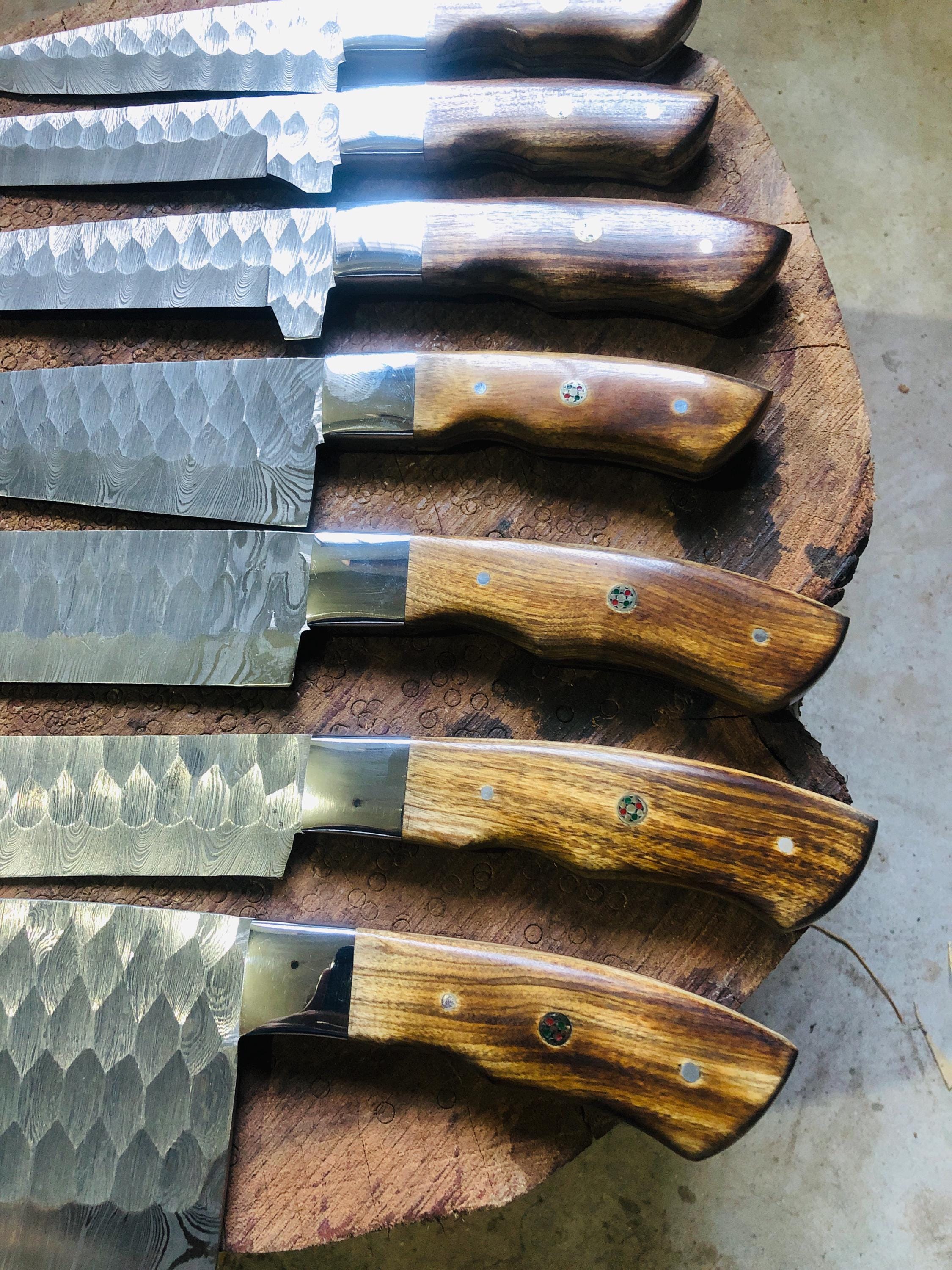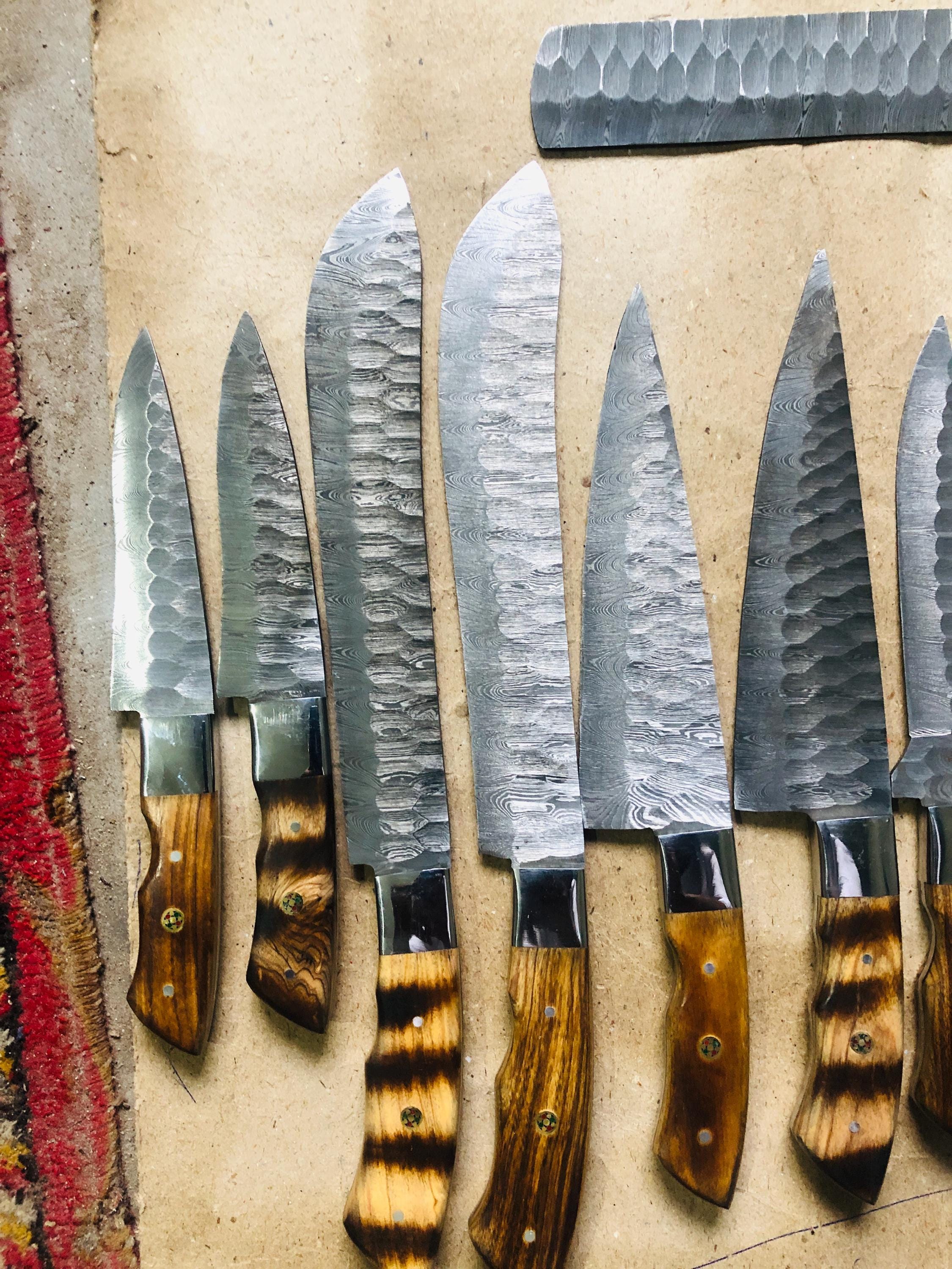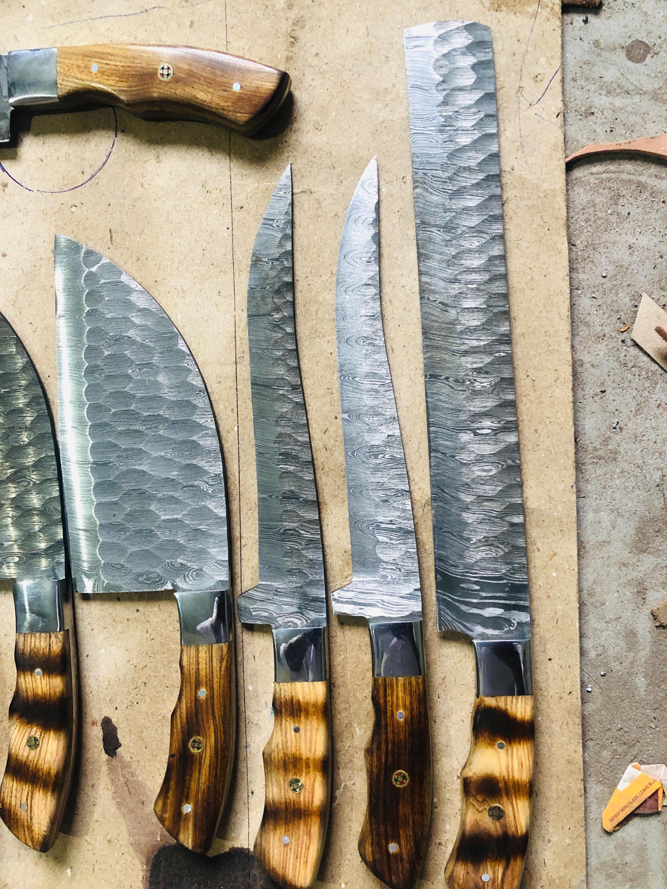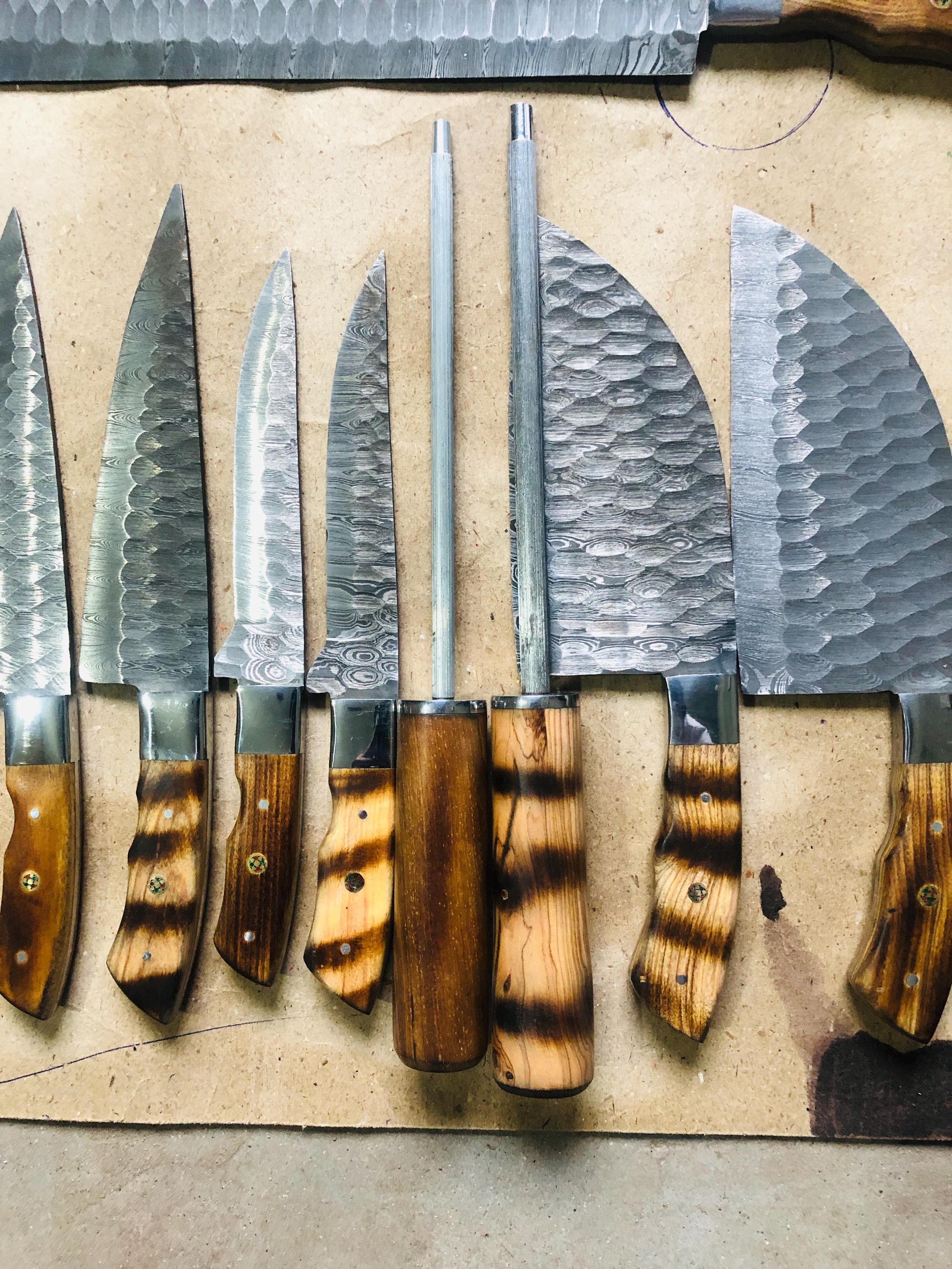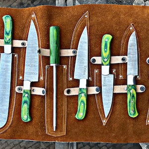 Custom Handmade Damascus Steel Wood Kitchen BBQ 8 PCS Chef Knives Set Overall Length: 8.5 to 15 '' Inches Handle Length: 5.0'' Inches Handle Material: Wood Blade Material: Damascus Steel Sweet Leather Roll Kit Excellent husband wife gift Wedding gift Father's Day gift Mother's Day gift Birthday Gift Groomsmen gift Christmas gift Best Knife Gift Luxury Handmade Gifts