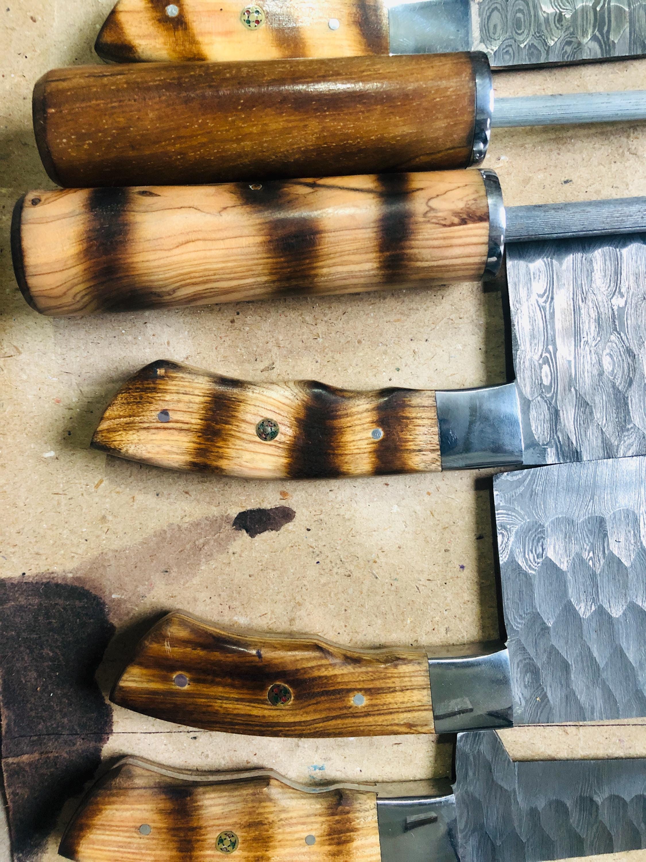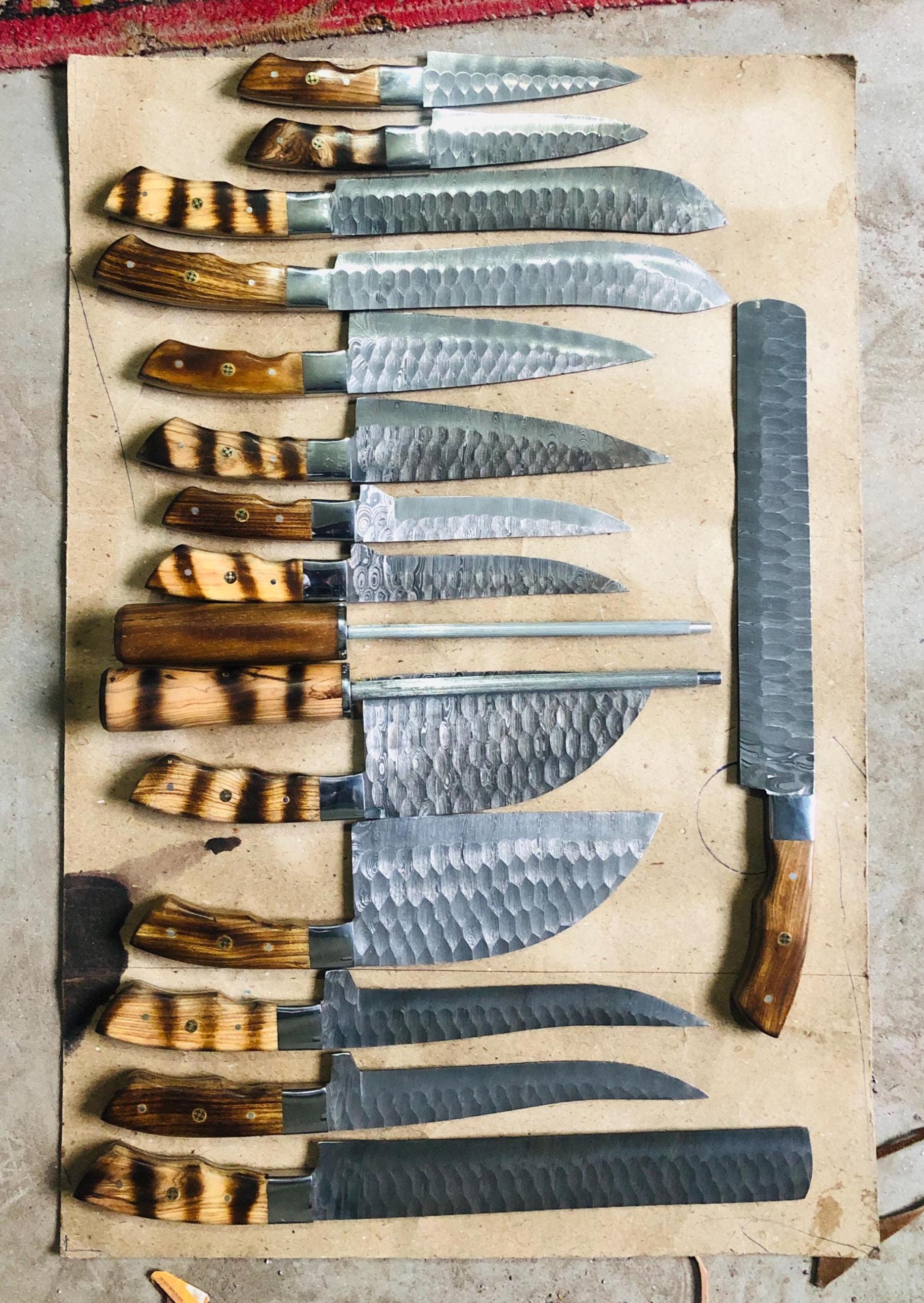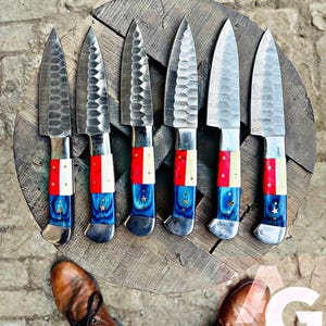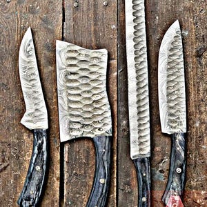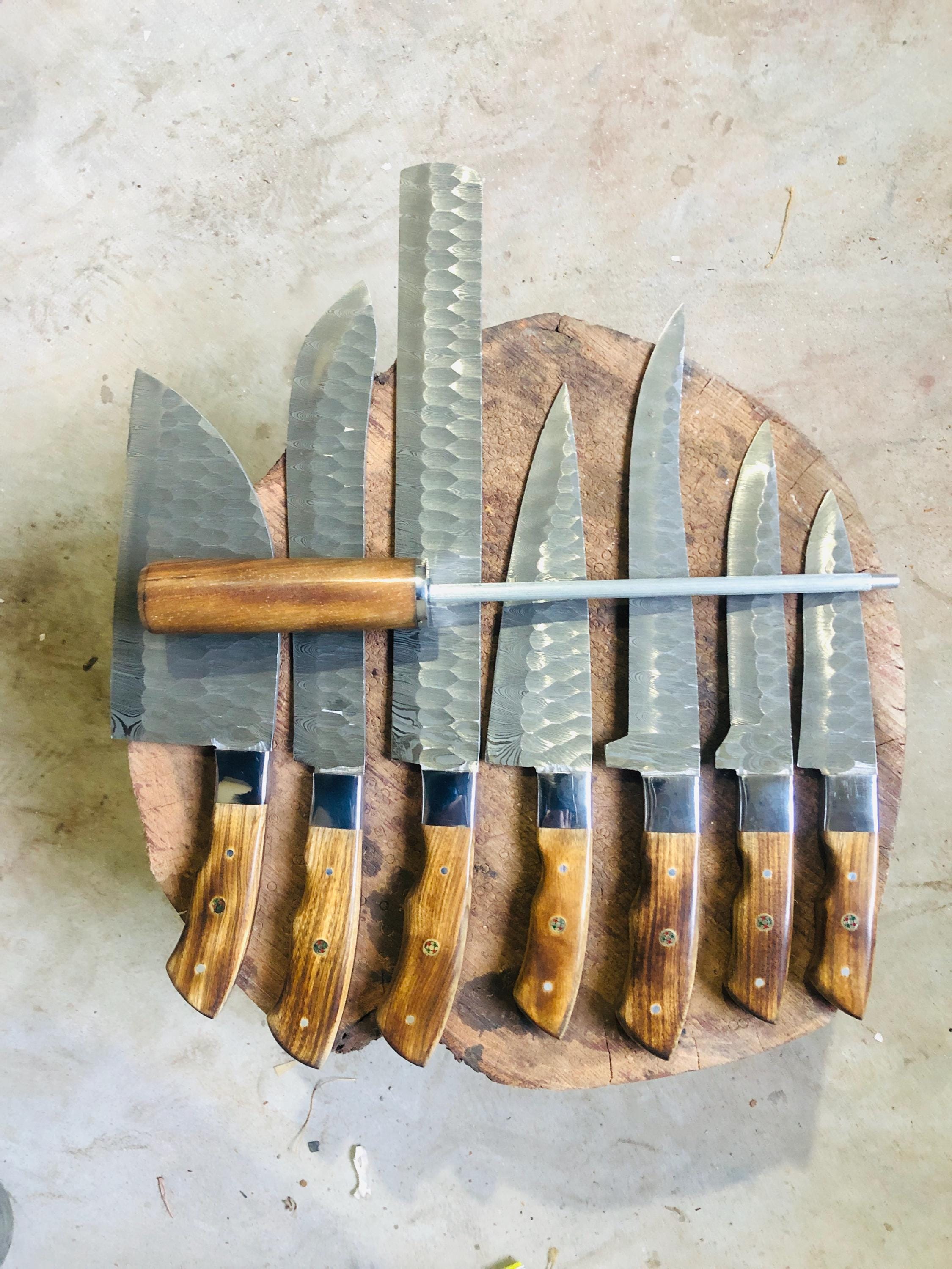 Custom Handmade Damascus Steel Wood Kitchen BBQ 8 PCS Chef Knives Set Overall Length: 8.5 to 15 '' Inches Handle Length: 5.0'' Inches Handle Material: Wood Blade Material: Damascus Steel Sweet Leather Roll Kit Excellent husband wife gift Wedding gift Father's Day gift Mother's Day gift Birthday Gift Groomsmen gift Christmas gift Best Knife Gift Luxury Handmade Gifts