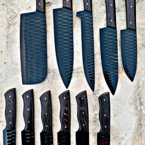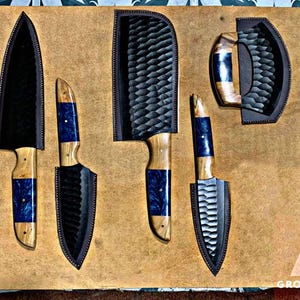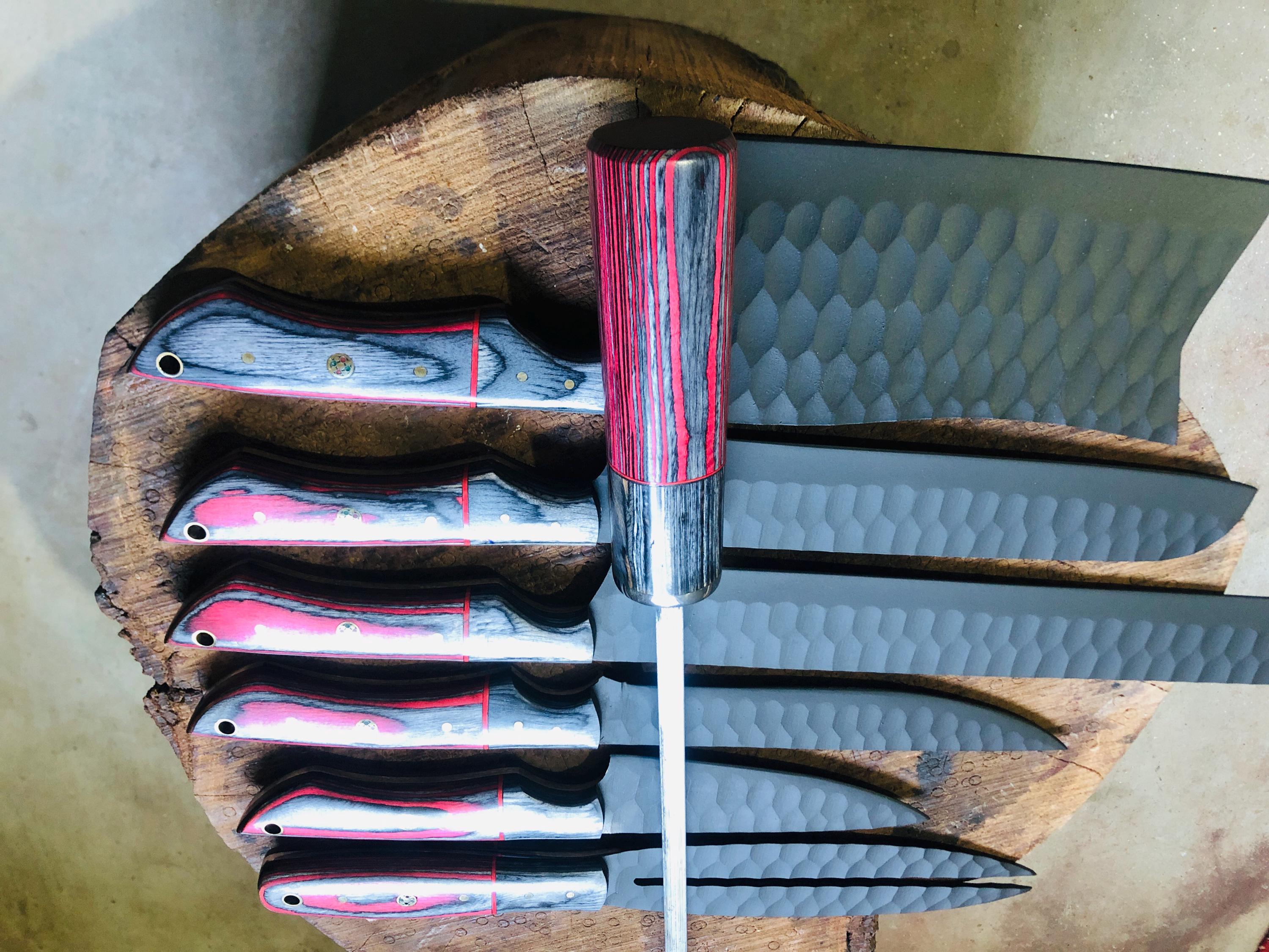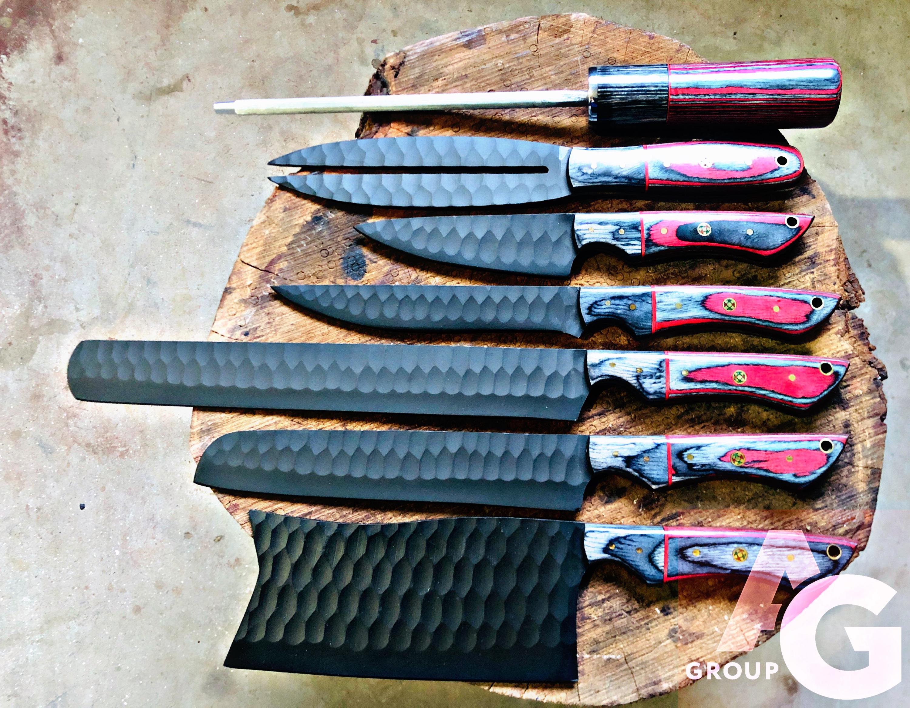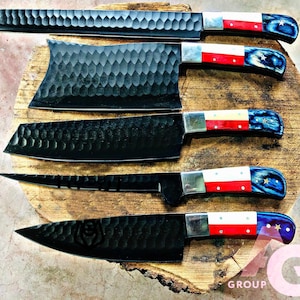 Custom Handmade D2 Steel REDBlackMix handle Kitchen BBQ 7 PCS Chef Knives Set Overall Length: 8 to 14 '' Inches Handle Length: 5.0'' Inches Handle Material: Red Black MIX Blade Material: D2 Steel Sweet Leather Roll Kit Excellent husband wife gift Wedding gift Father's Day gift Mother's Day gift Birthday Gift Groomsmen gift Christmas gift Best Knife Gift Luxury Handmade Gifts