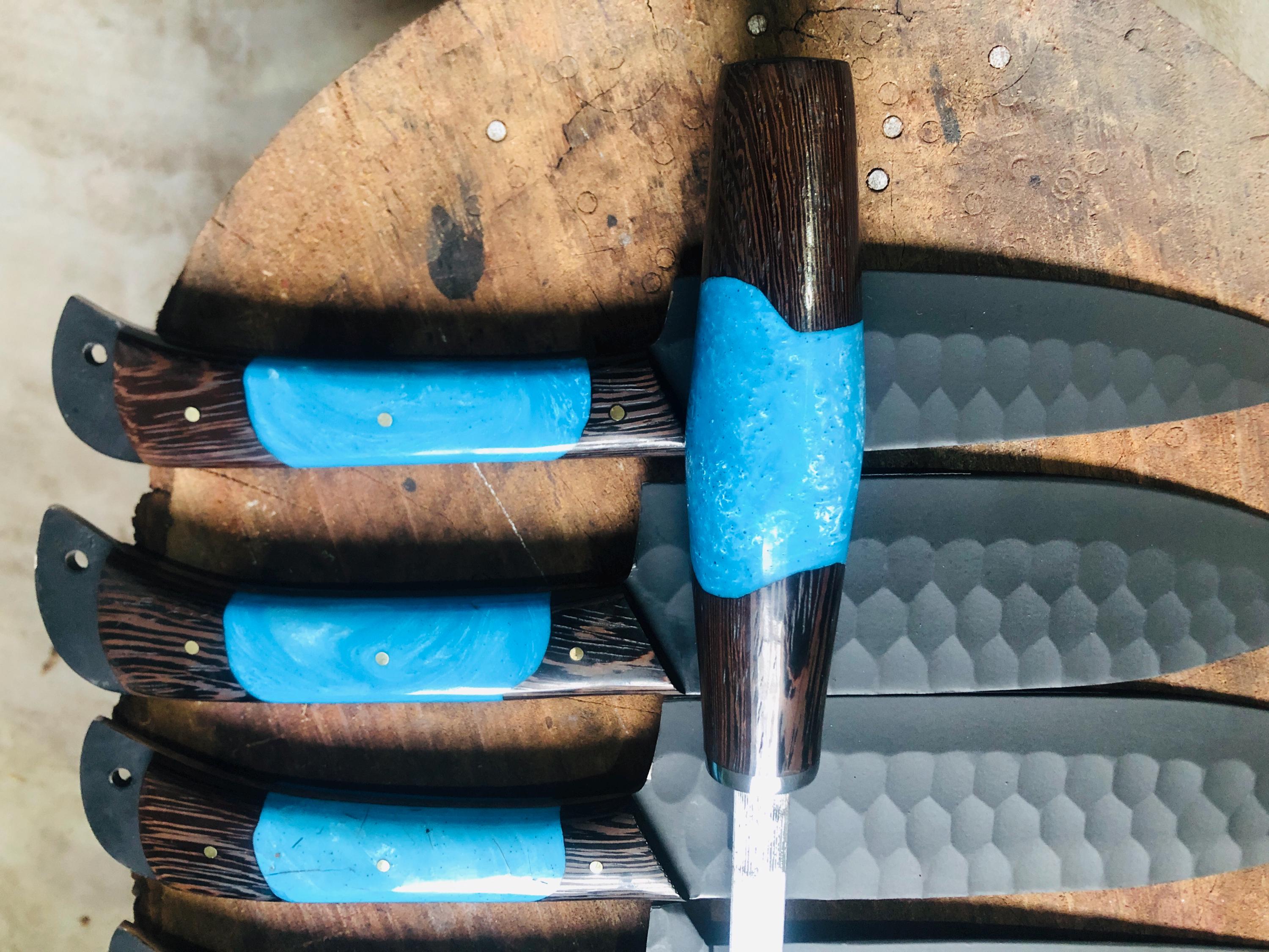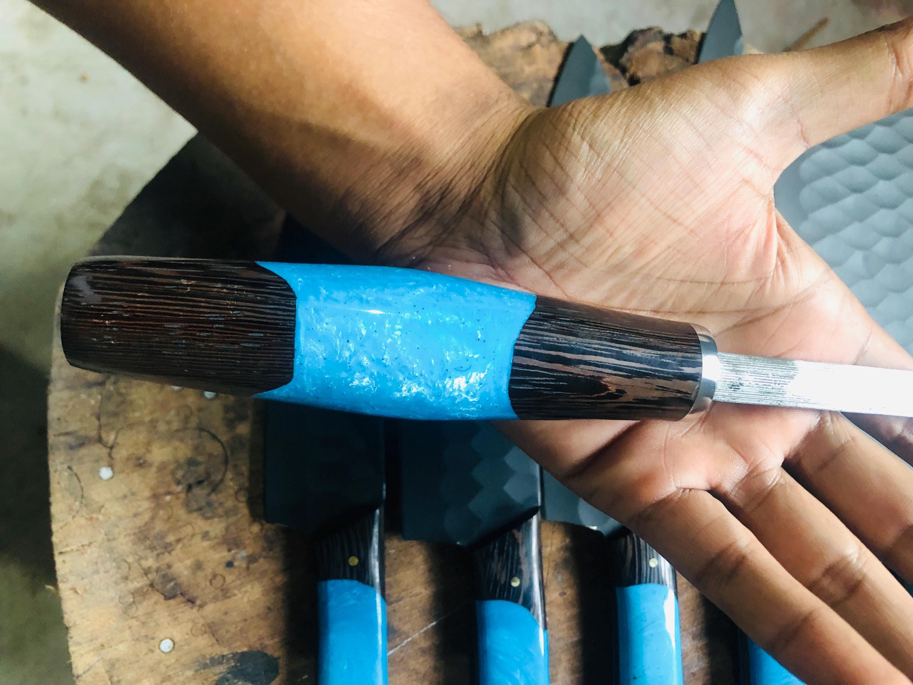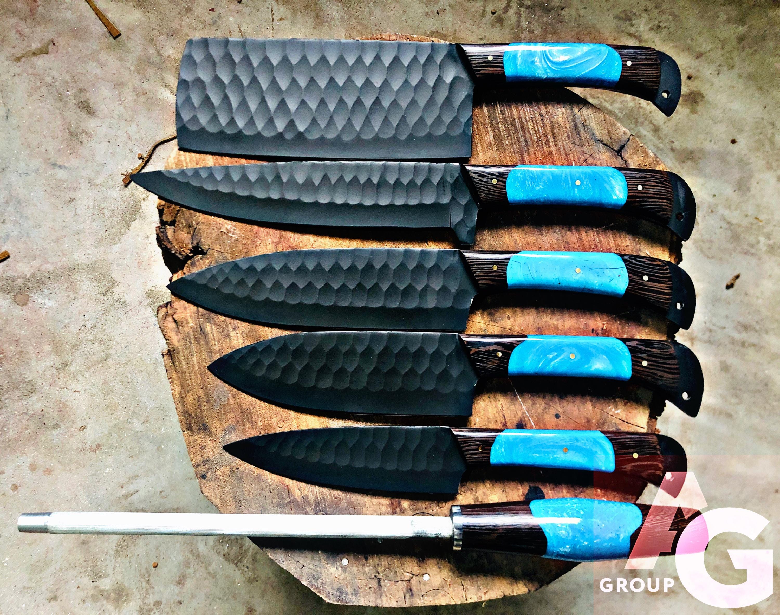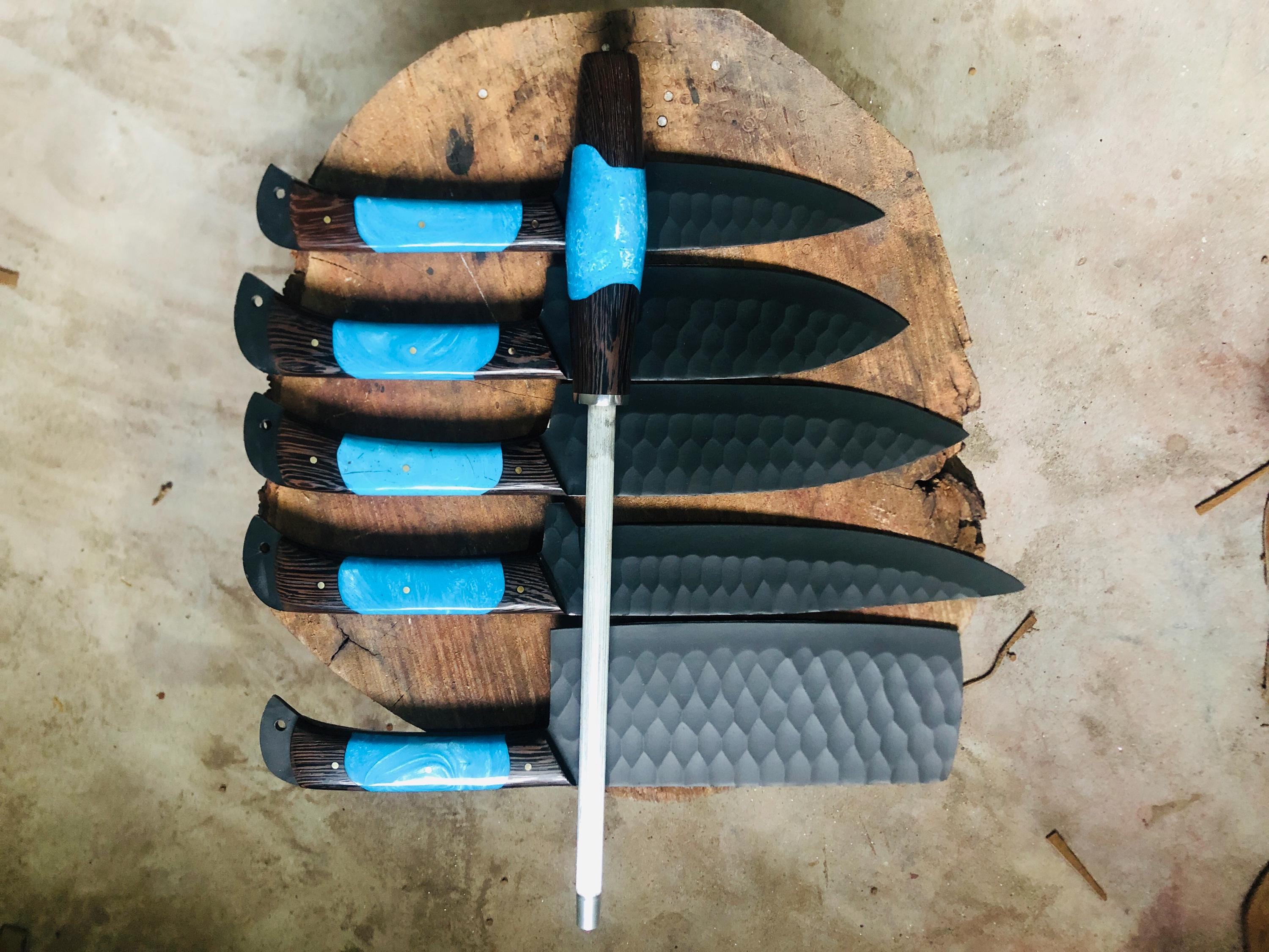 Custom Handmade D2 Steel Wenge And Resin Kitchen BBQ 6 PCS Chef Knives Set Overall Length: 8.5 to 12 '' Inches Handle Length: 5.0'' Inches Handle Material: Wenge And Resin Blade Material: D2 steel Sweet Leather Roll Kit Excellent husband wife gift Wedding gift Father's Day gift Mother's Day gift Birthday Gift Groomsmen gift Christmas gift Best Knife Gift Luxury Handmade Gifts