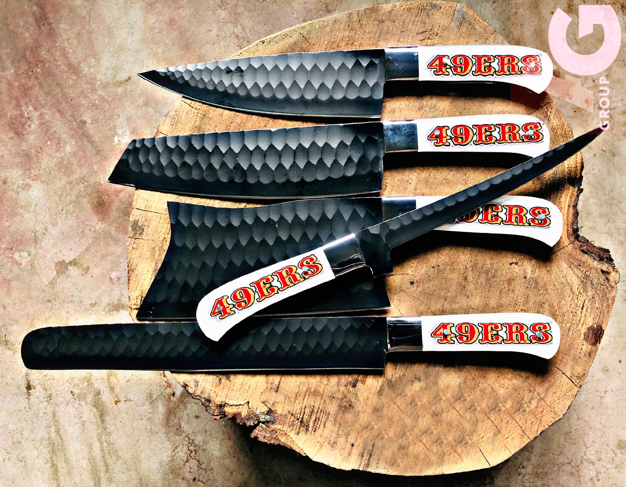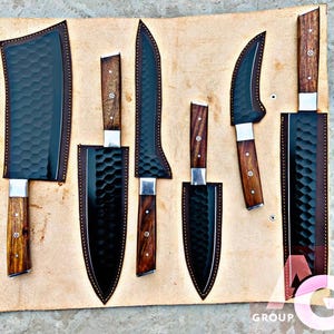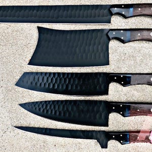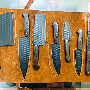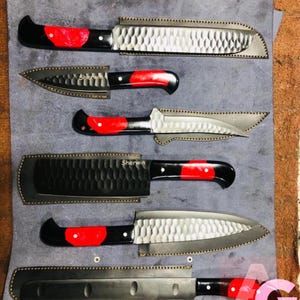 Custom Handmade D2 Steel Kitchen BBQ 5 PCS 49 ERS Chef Knives Set Overall Length: 11.5 to 13.5 '' Inches Handle Length: 5.0'' Inches Handle Material: 49 ERS Blade Material: D2 Steel Sweet Leather Roll Kit Excellent husband wife gift Wedding gift Father's Day gift Mother's Day gift Birthday Gift Groomsmen gift Christmas gift Best Knife Gift Luxury Handmade Gifts