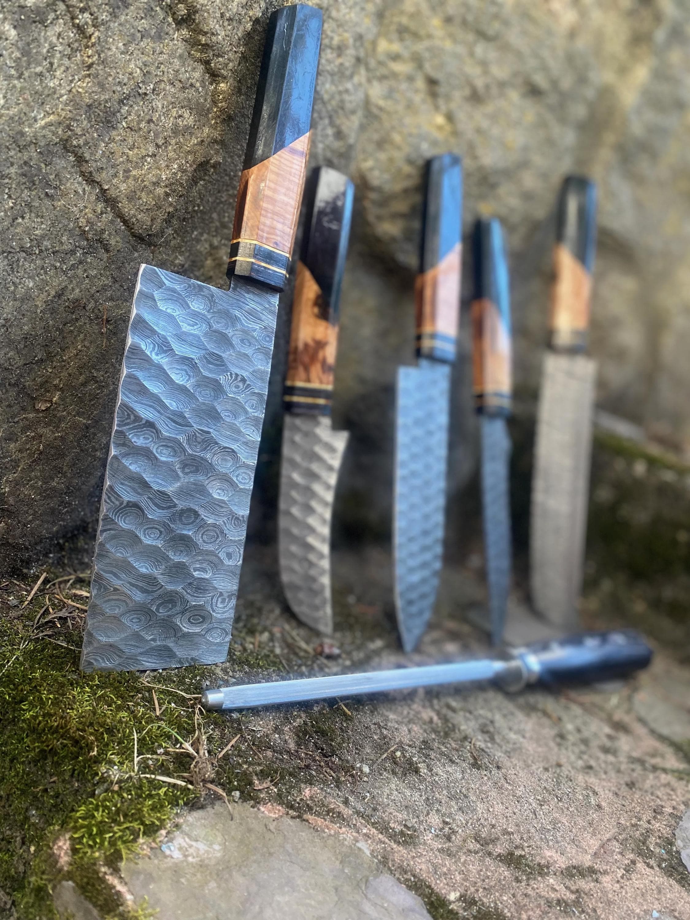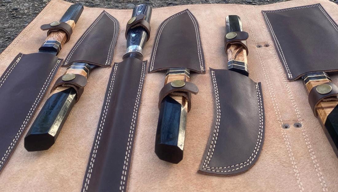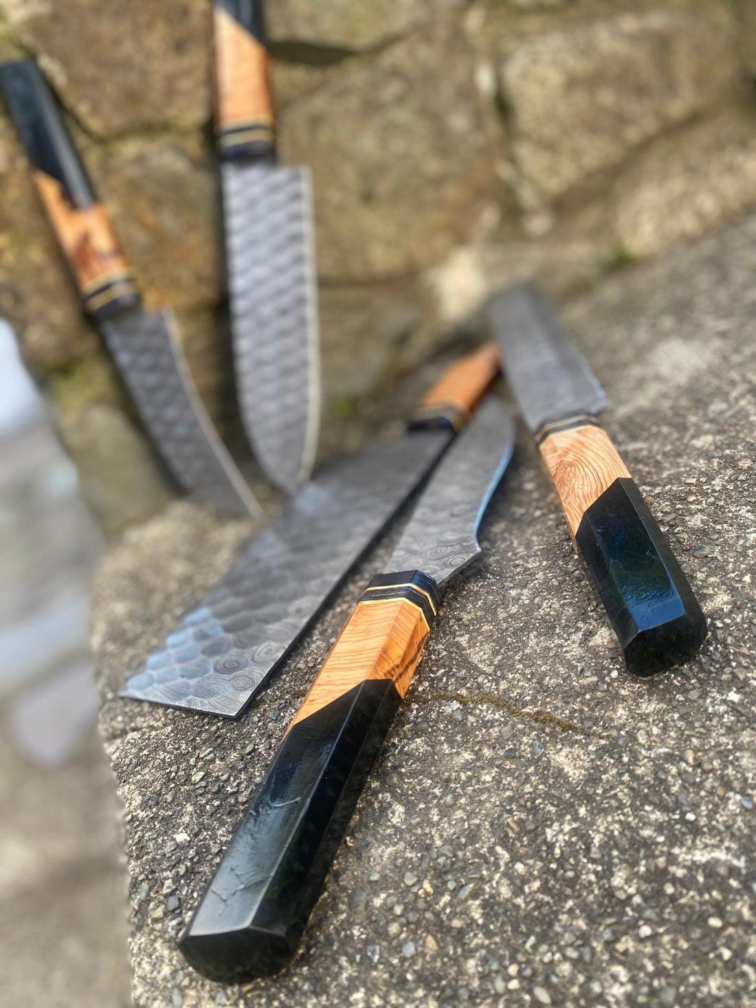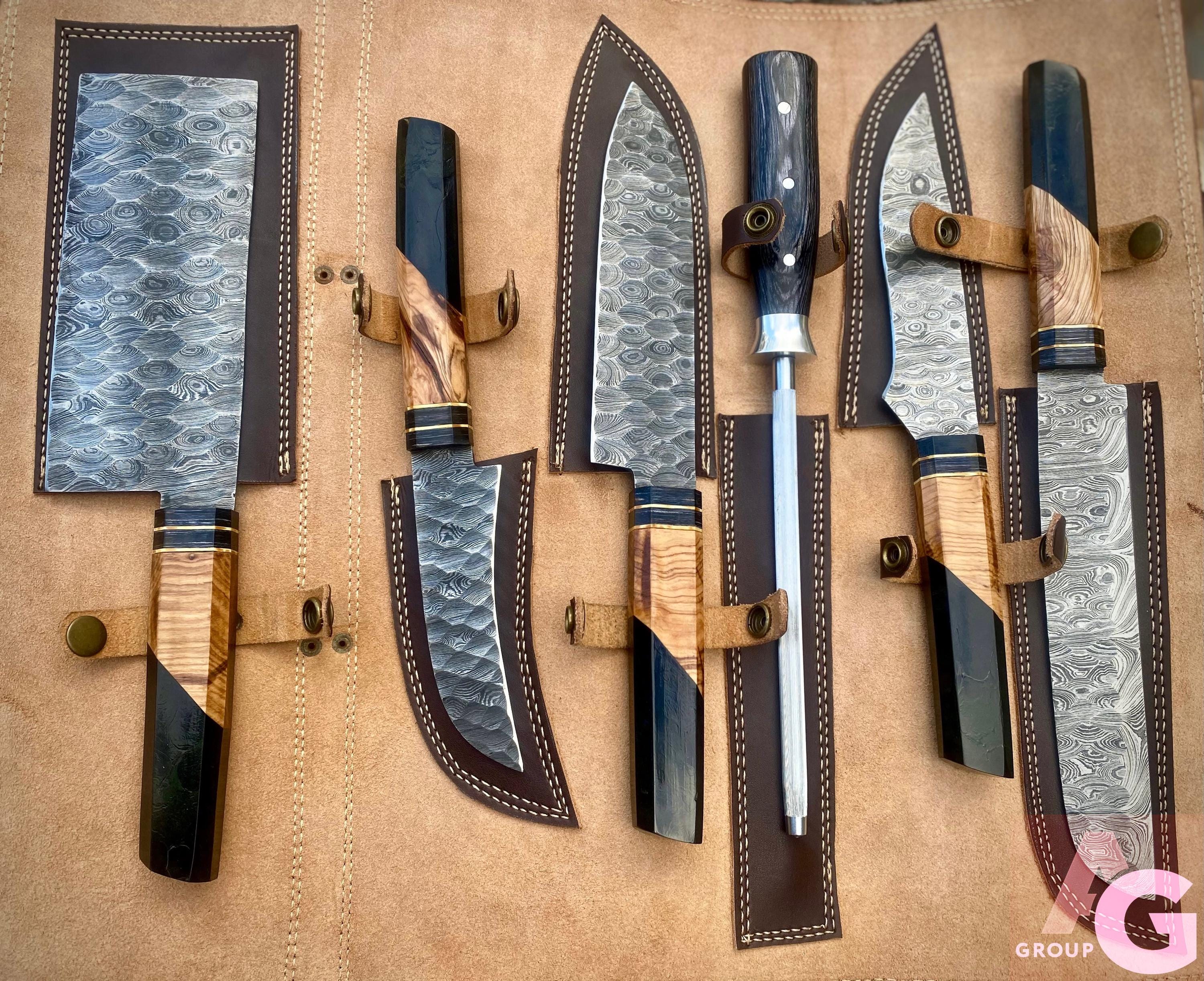 Custom Handmade Damascus Steel HANDFORGED Resin Kitchen BBQ 6 PCS Chef Knives Set Overall Length: 8.5 to 13 '' Inches Handle Length: 5.0'' Inches Handle Material: RESIN Blade Material: Damascus steel Sweet Leather Roll Kit Excellent husband wife gift Wedding gift Father's Day gift Mother's Day gift Birthday Gift Groomsmen gift Christmas gift Best Knife Gift Luxury Handmade Gifts