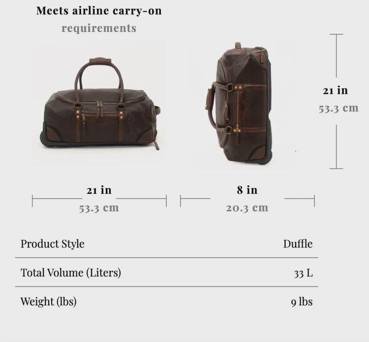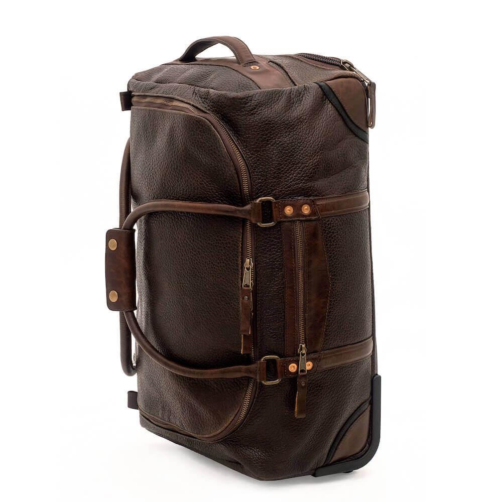 The Theodore Leather Rolling Carry-On Duffle is artisan-crafted with our hand-selected Espresso finish extremely durable full-grain pebbled Pakistan steerhide leather. It's exquisitely appointed with chocolate full-grain chrome tanned leather accents and solid copper rivets at all stress points. Sized to efficiently meet all major airline carry-on restrictions.