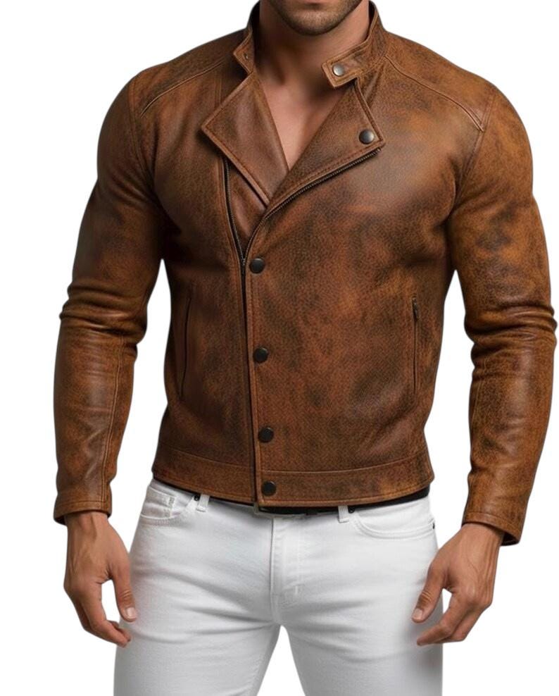 Elevate your style with this rugged yet sophisticated Men's Distressed Brown Leather Jacket. Handcrafted from premium lambskin, this Cafe Racer style jacket offers a perfect blend of vintage aesthetics and modern fit, making it an essential addition to any wardrobe.