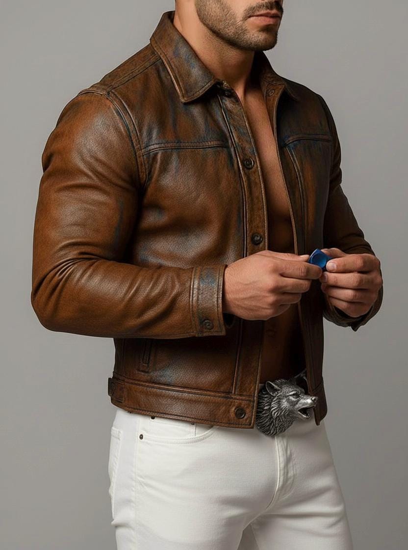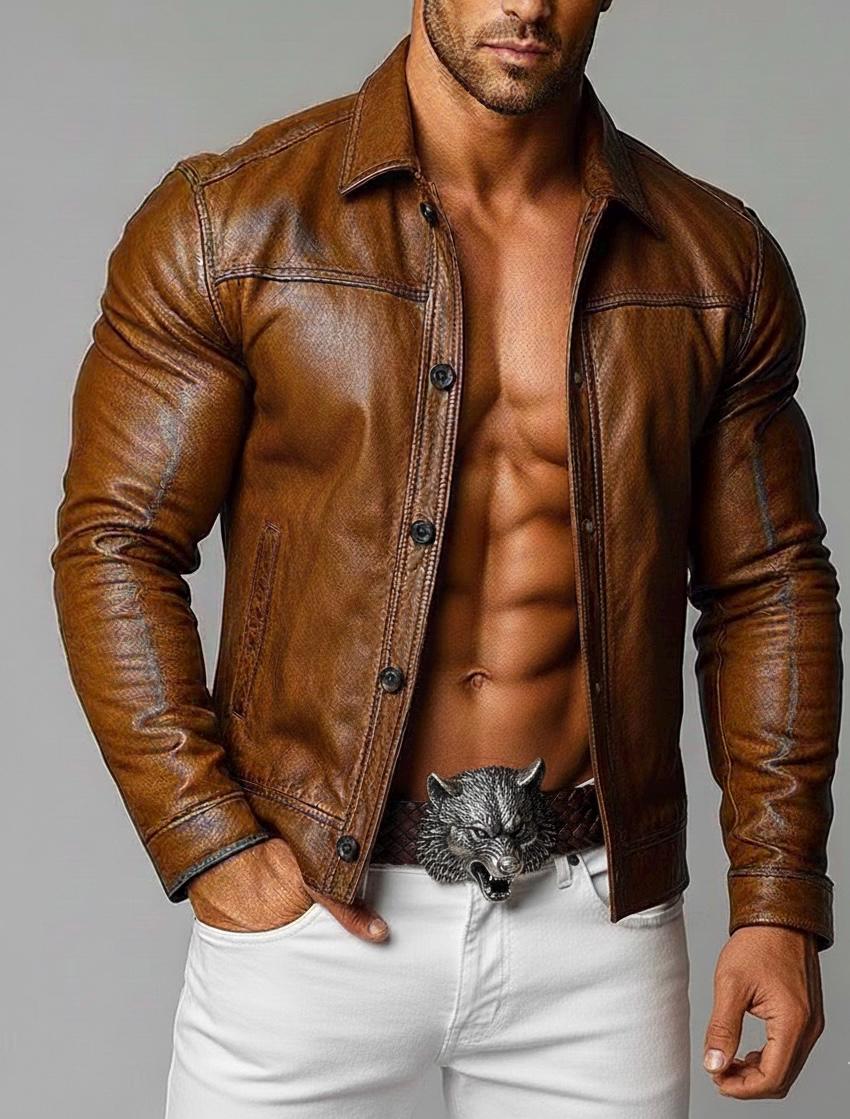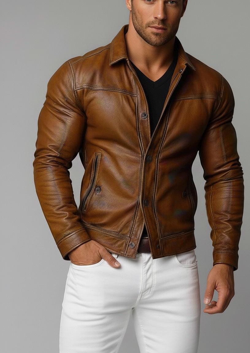 Elevate your style with this Men's Brown Leather Jacket, a perfect blend of classic biker style and modern slim fit design. Crafted from premium genuine lambskin leather, this jacket offers superior softness, durability, and a luxurious feel that is built to last. The rich cognac brown color and vintage-inspired finish add a rugged, timeless edge to any outfit, whether you're hitting the road on your motorcycle or just out for a casual evening. This isn't just outerwear; it's a statement piece designed to turn heads while keeping you comfortable and confident. Key Features Premium Material: Made from 100% genuine, ultra-soft lambskin leather for a lightweight yet durable feel. Slim Fit Design: Tailored for a sharp, flattering silhouette that allows for easy movement. Classic Biker Style: Features a stylish front button-up closure, a classic shirt-style collar, and sleek detailing for that iconic retro look. Functional & Stylish: Equipped with two side pockets for quick access and internal pockets for secure storage of your essentials like phone and keys. Comfortable Lining: Smooth inner lining for added comfort during all-day wear. Versatile: Ideal for layering over t-shirts, sweaters, or hoodies, suitable for casual outings or special occasions. Specifications Material: 100% Real Lambskin Leather Color: Cognac Brown / Tan Brown Fit: Slim Fit Closure: Button-up front Pockets: Two outer side pockets, two inner pockets Care Instructions: Spot clean with a damp cloth; avoid excessive moisture; apply leather conditioner to maintain softness.