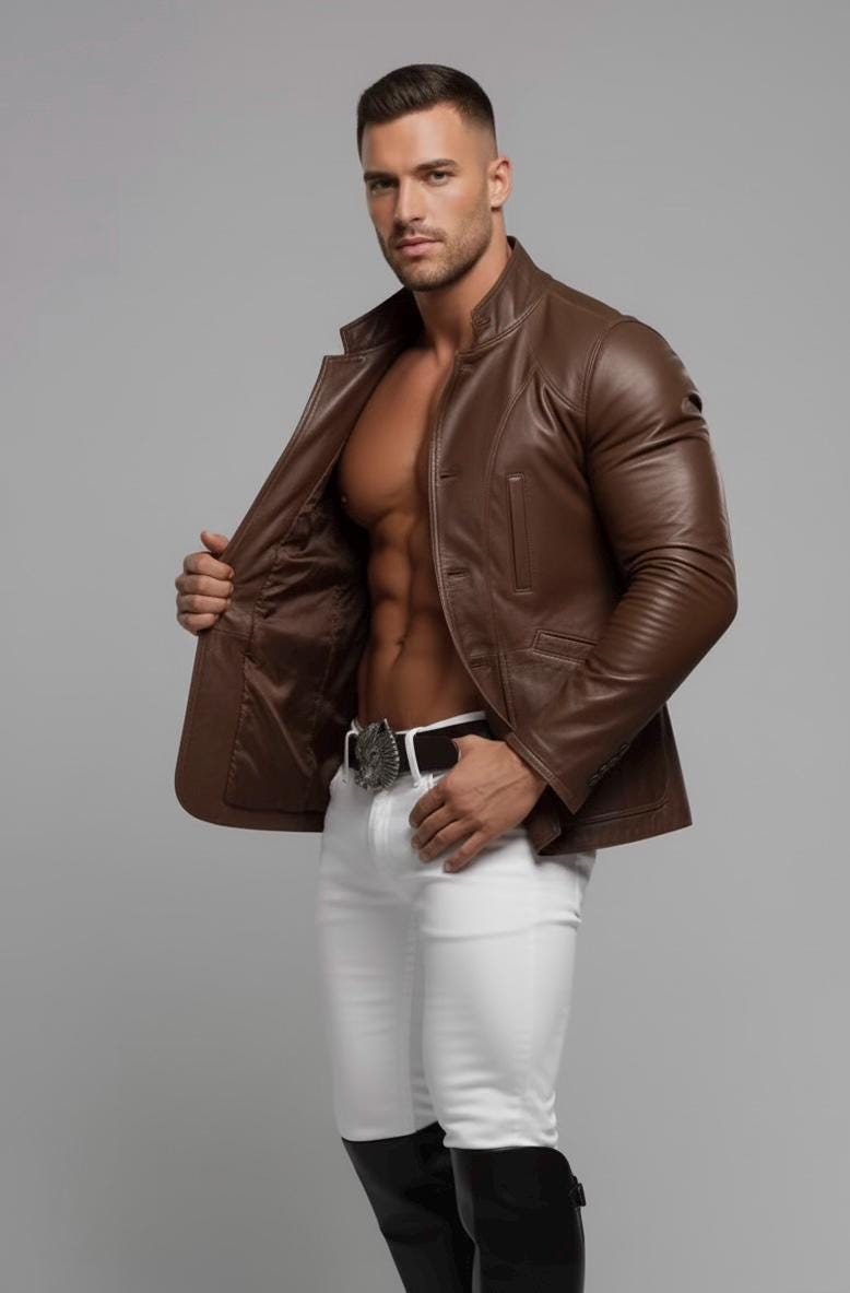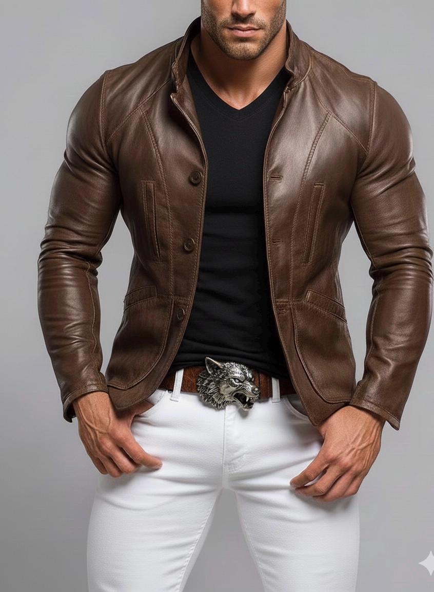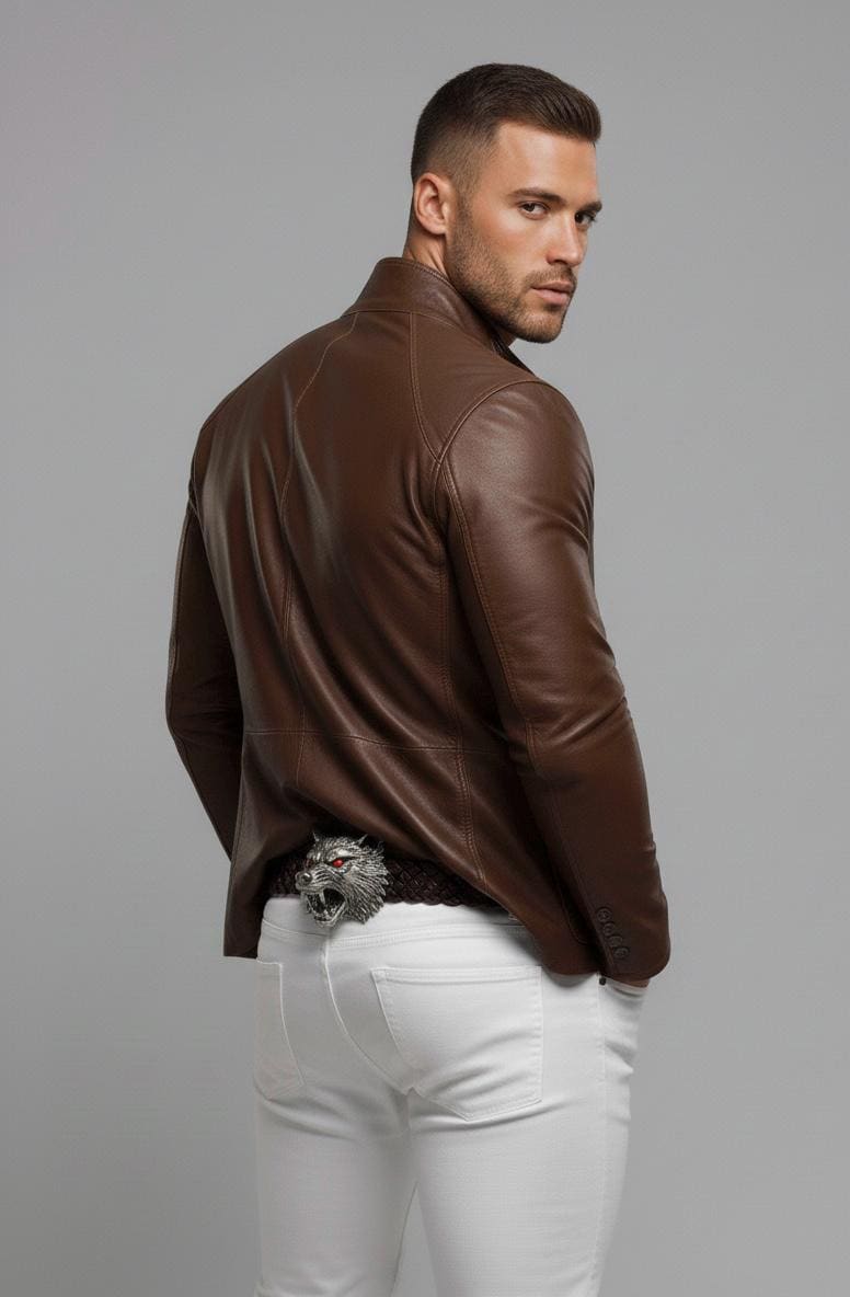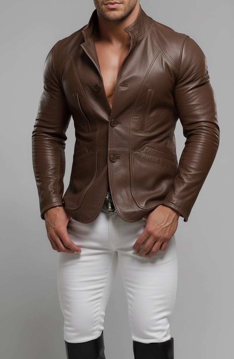 Men's Choco Brown Sheepskin Leather Blazer Elevate your wardrobe with this exquisite men's brown leather blazer from AG Groups. Crafted from premium, soft sheepskin leather, this jacket offers a modern, tailored fit that's perfect for a business-casual look, a night out, or adding a sophisticated edge to your everyday style. This is more than just a jacket; it's a statement piece designed for the modern man who values quality, style, and unique craftsmanship. Key Features Premium Material: Made with genuine, high-quality sheepskin lambskin leather for a soft, luxurious feel and durability. Tailored Fit: A modern slim-fit design that contours to your body for a sharp, flattering silhouette. Classic Design: Features a timeless two-button closure and a stand-up collar for a sleek, versatile look. Functional Pockets: Includes two front flap pockets and internal pockets for practical storage. Handmade Quality: Each blazer is carefully crafted to ensure superior finish and attention to detail. Versatile Style: Easily pairs with white jeans, dark trousers, or casual wear. Material & Care Outer Shell: 100% Genuine Sheepskin Leather Inner Lining: Soft, breathable polyester lining Care Instructions: Do not wash. Do not bleach. Do not tumble dry. Do not iron. Professional leather clean only. Sizing Guide & Customization Please refer to the sizing chart in the product images to find your perfect fit. We highly recommend sending us your measurements for a custom-tailored experience to ensure the best possible fit. AG Groups is dedicated to providing you with outerwear you'll love for years to come. If you have any questions, please feel free to reach out!