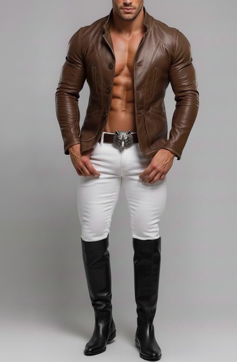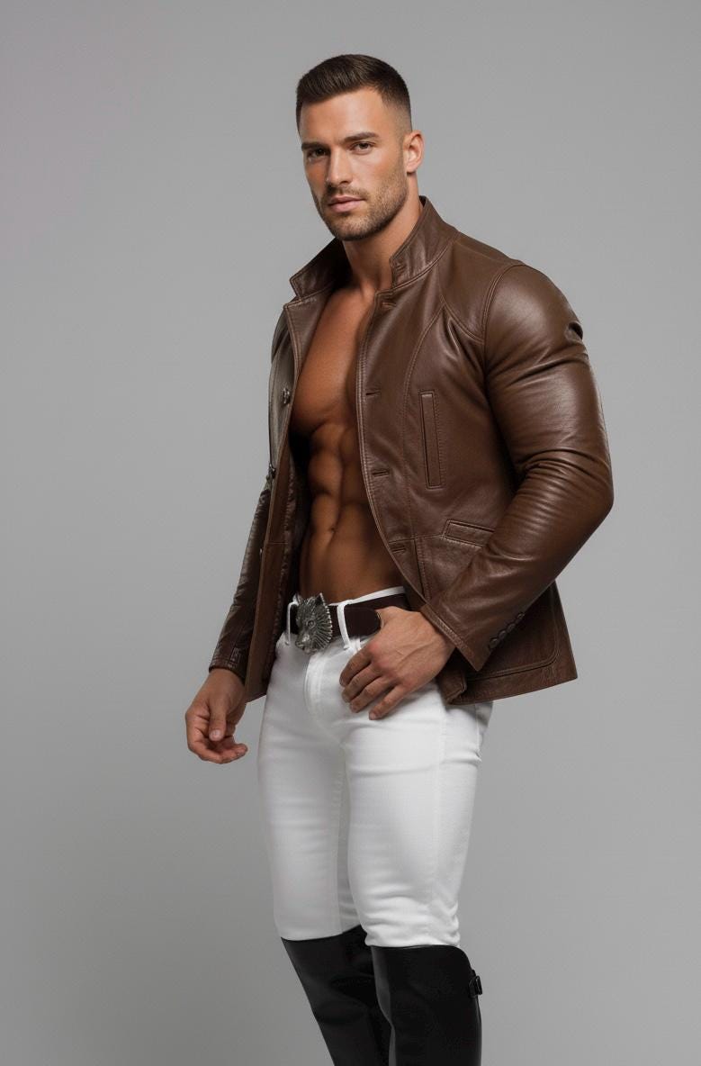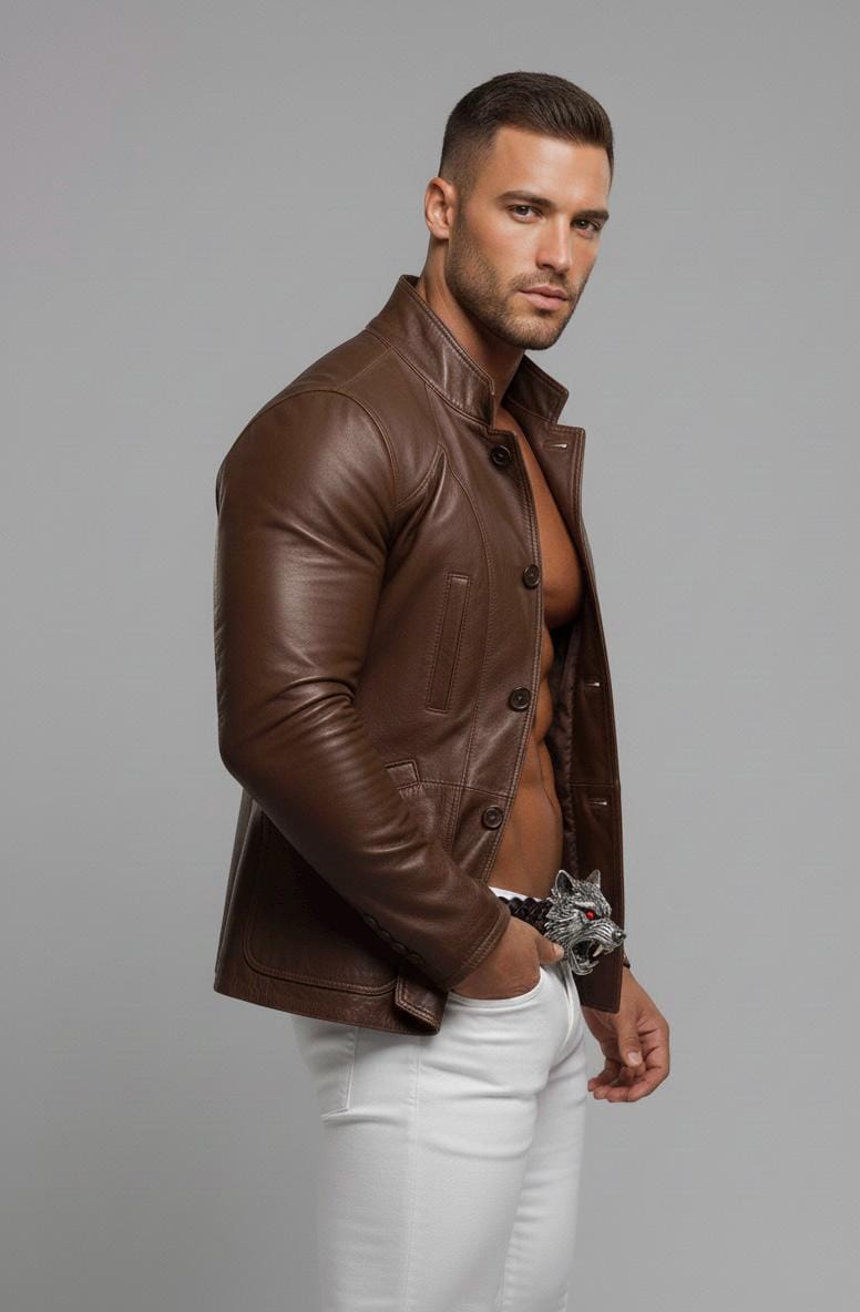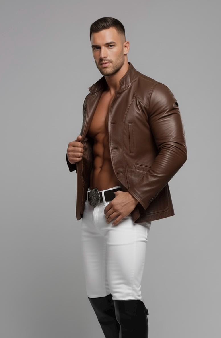 Men's Choco Brown Sheepskin Leather Blazer Elevate your wardrobe with this exquisite men's brown leather blazer from AG Groups. Crafted from premium, soft sheepskin leather, this jacket offers a modern, tailored fit that's perfect for a business-casual look, a night out, or adding a sophisticated edge to your everyday style. This is more than just a jacket; it's a statement piece designed for the modern man who values quality, style, and unique craftsmanship. Key Features Premium Material: Made with genuine, high-quality sheepskin lambskin leather for a soft, luxurious feel and durability. Tailored Fit: A modern slim-fit design that contours to your body for a sharp, flattering silhouette. Classic Design: Features a timeless two-button closure and a stand-up collar for a sleek, versatile look. Functional Pockets: Includes two front flap pockets and internal pockets for practical storage. Handmade Quality: Each blazer is carefully crafted to ensure superior finish and attention to detail. Versatile Style: Easily pairs with white jeans, dark trousers, or casual wear. Material & Care Outer Shell: 100% Genuine Sheepskin Leather Inner Lining: Soft, breathable polyester lining Care Instructions: Do not wash. Do not bleach. Do not tumble dry. Do not iron. Professional leather clean only. Sizing Guide & Customization Please refer to the sizing chart in the product images to find your perfect fit. We highly recommend sending us your measurements for a custom-tailored experience to ensure the best possible fit. AG Groups is dedicated to providing you with outerwear you'll love for years to come. If you have any questions, please feel free to reach out!