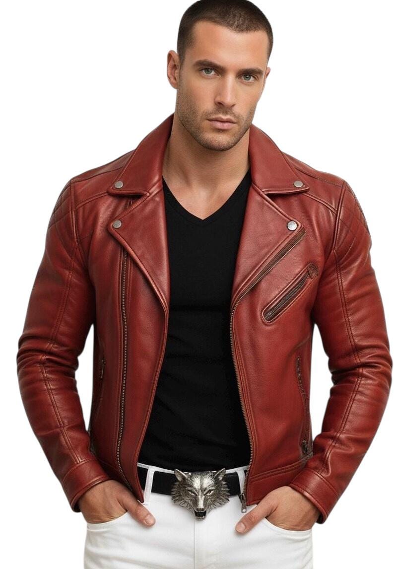 Elevate your style with this iconic AG Groups men's red leather biker jacket. Crafted from premium, genuine leather, this jacket offers a perfect blend of timeless style and modern edge. Whether you're hitting the open road or the city streets, this moto jacket is designed to make a statement.