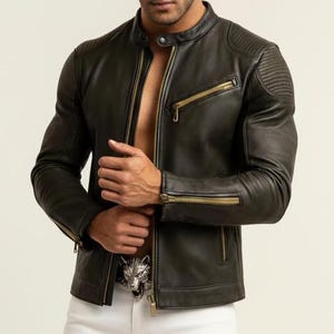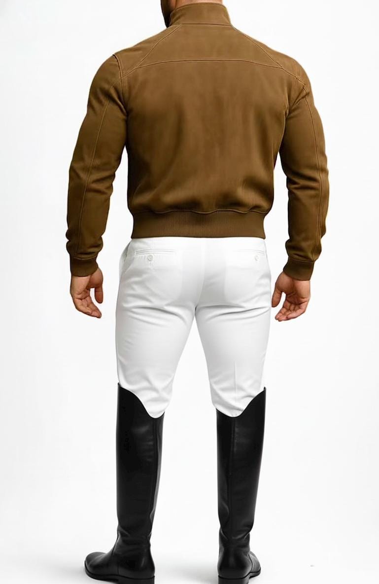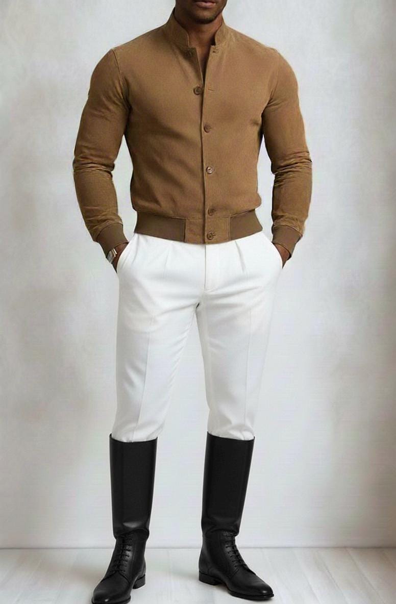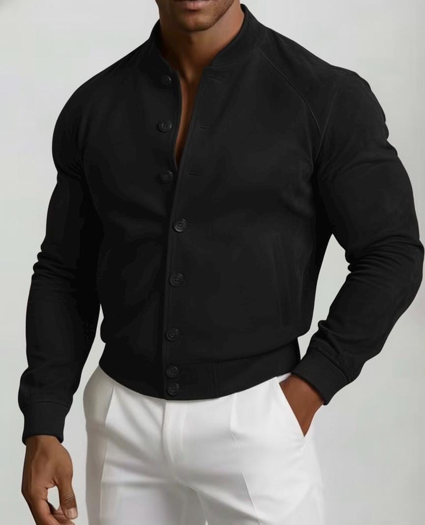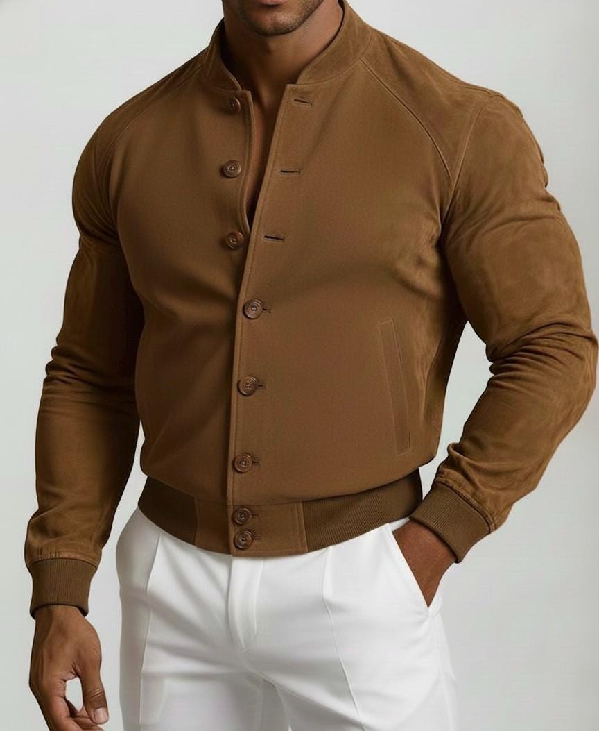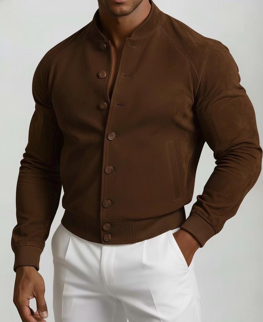 AG GROUPS Men's Brown Suede Bomber Jacket Elevate your wardrobe with this classic and stylish men's suede bomber jacket from AG GROUPS. Crafted from premium genuine leather, this jacket offers a luxurious feel and a timeless silhouette that is perfect for any casual or semi-formal occasion. Features: Material: 100% Genuine Suede Leather Color: Rich Tan/Brown Style: Classic bomber style with a band collar and ribbed cuffs/hem Closure: Button-front closure Pockets: Discreet side slip pockets Lining: Soft inner lining for comfort and warmth Description: This AG GROUPS jacket combines rugged durability with sophisticated design. The soft, velvety texture of the suede provides a premium look and feel, while the tailored fit ensures a flattering and modern appearance. Whether paired with white trousers as shown, or your favorite dark denim, this versatile piece is a wardrobe staple. Perfect for layering during transitional weather, it offers both style and practicality.