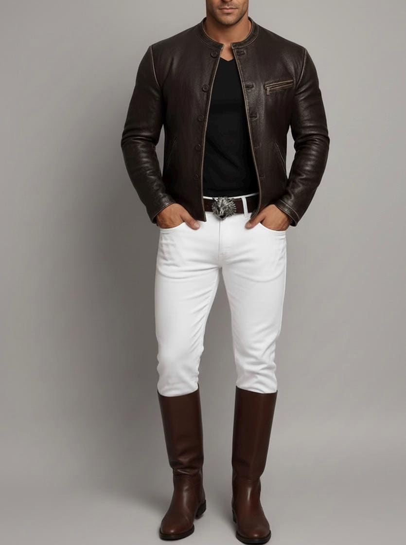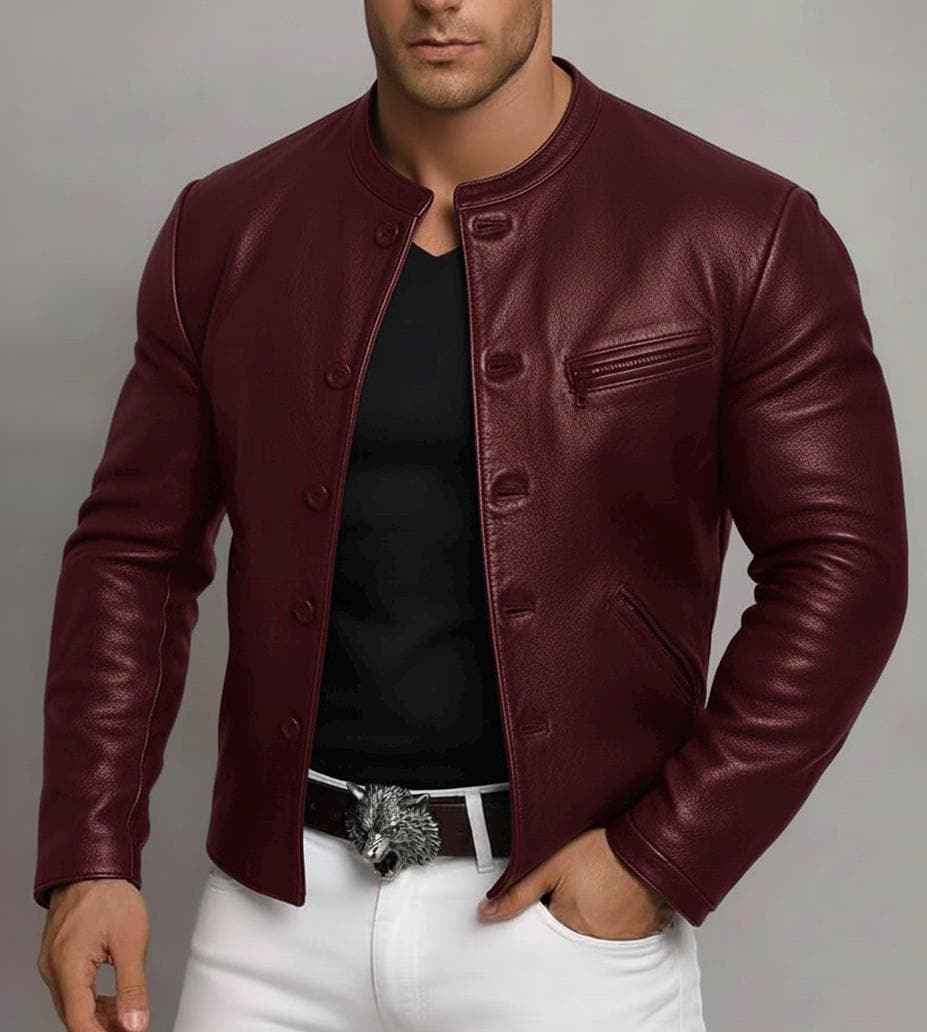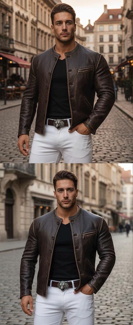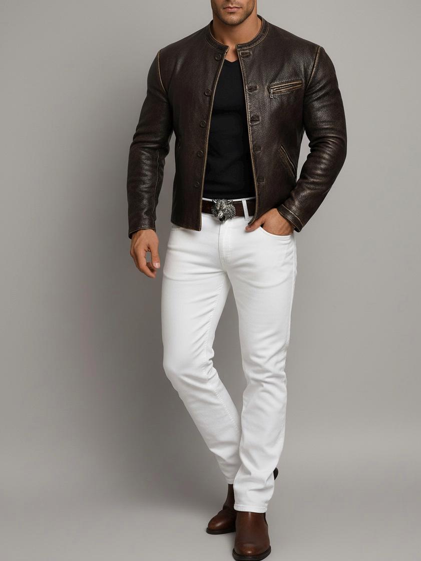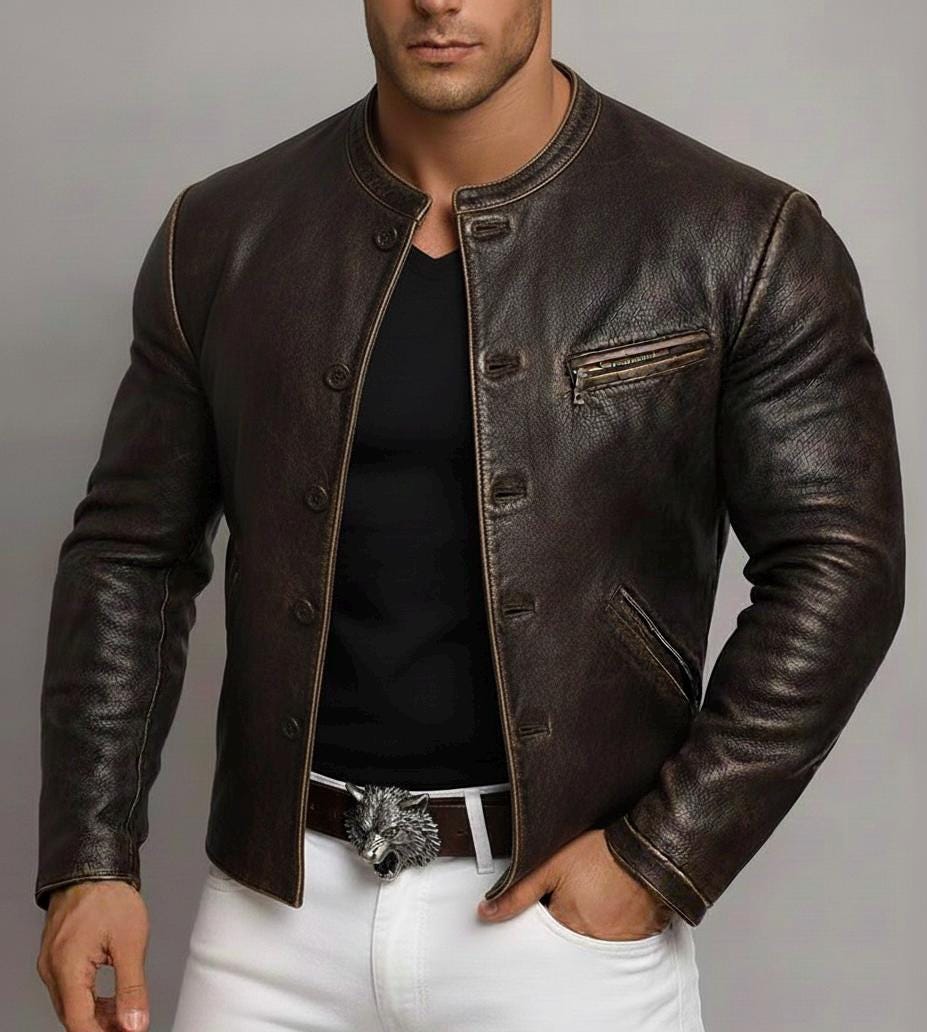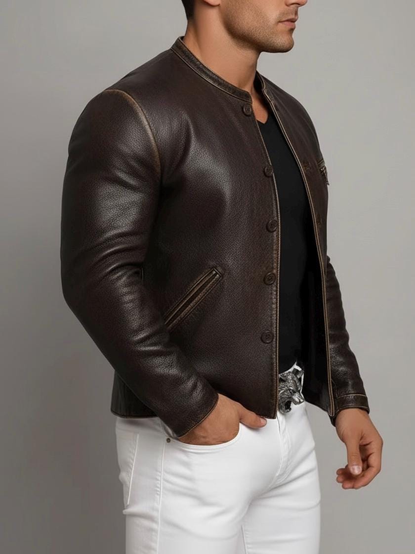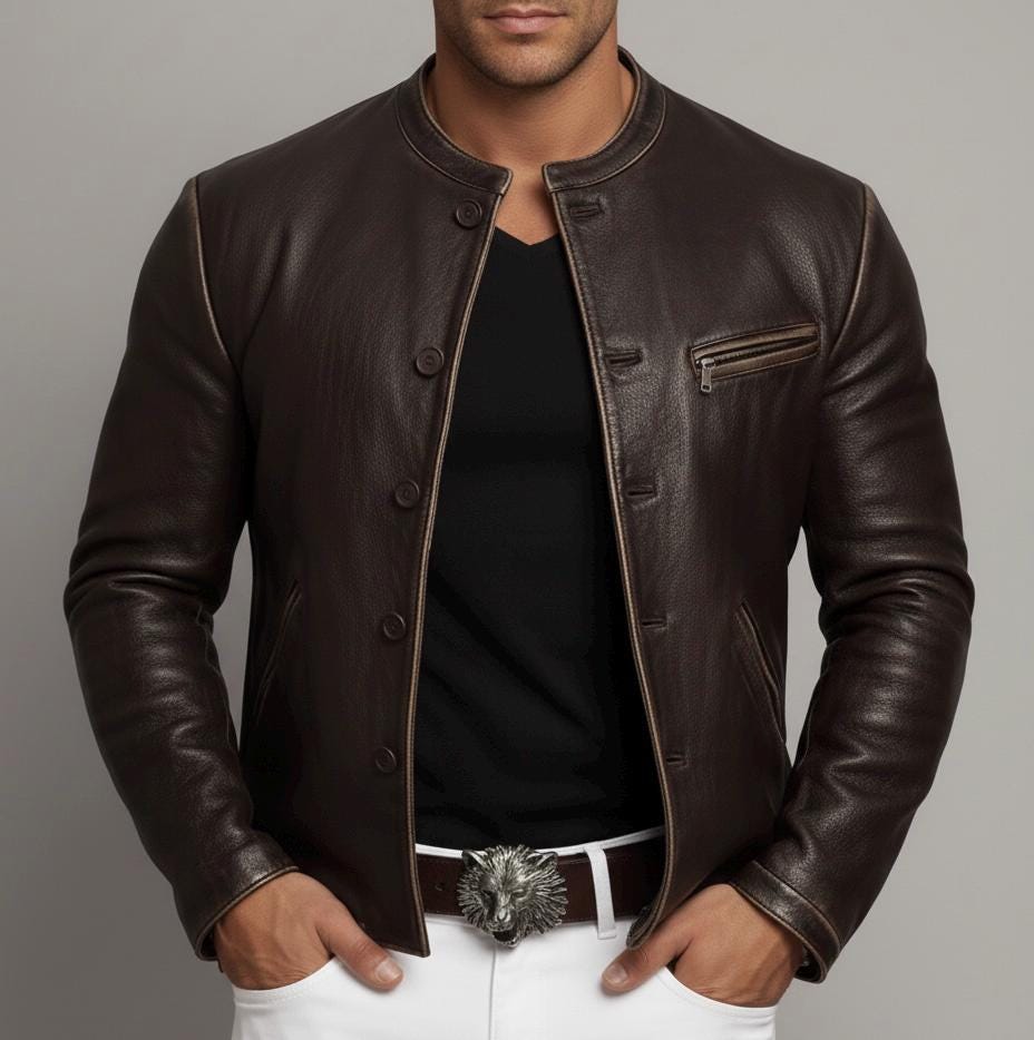 Step into Timeless Style with Our Men's Distressed Brown Leather Jacket | AG GROUPS Handcrafted from premium genuine leather, this jacket is designed for the man who values quality, rugged sophistication, and vintage flair. It’s more than just outerwear; it’s a statement piece that tells a story and only gets better with every wear. The rich, distressed finish gives it that authentic, worn-in look from day one, while the classic button-up design and stand collar offer a timeless cafe racer style that stands out from the crowd. Features & Benefits Premium Genuine Leather: Made from 100% genuine sheep leather, offering durability and a soft, supple feel. Unique Distressed Finish: The aged texture provides a bold, vintage look that ensures every jacket is unique. Comfortable Lining: Lined with soft viscose for all-day comfort, whether you're on a ride or a casual evening out. Classic Design: Features a stylish mandarin collar, full front button closure, and functional side pockets for a blend of contemporary minimalism and retro charm. Versatile Wear: Easily transitions from a casual day look paired with a t-shirt and jeans to a more polished outfit with a light shirt and chinos. Product Details Brand: AG GROUPS Material: 100% Genuine Sheep Leather (Outer Shell), Viscose Lining (Inner) Color: Distressed Brown Closure: Button-up front Style: Cafe Racer, Biker, Vintage Pockets: Two side pockets, one zippered chest pocket (as seen in image) Care: Leather specialist cleaning recommended Elevate your wardrobe with a jacket built to last a lifetime. This is the perfect gift for birthdays, anniversaries, or simply to treat yourself or a loved one. 💬 Questions? Message the AG GROUPS team anytime—we’re here to help you find your perfect fit!