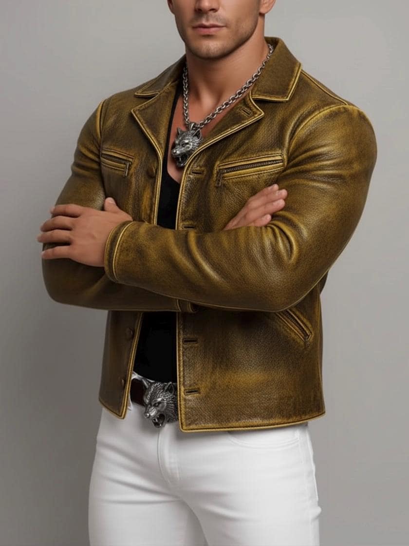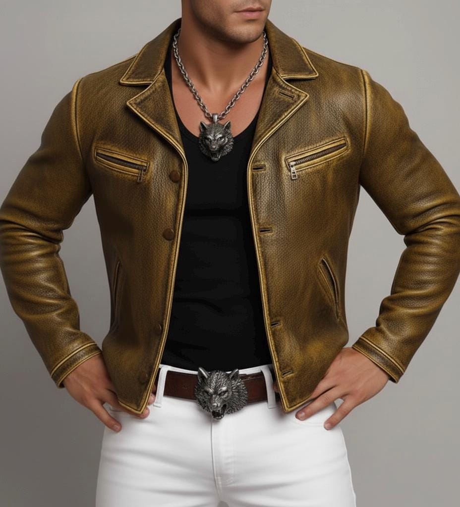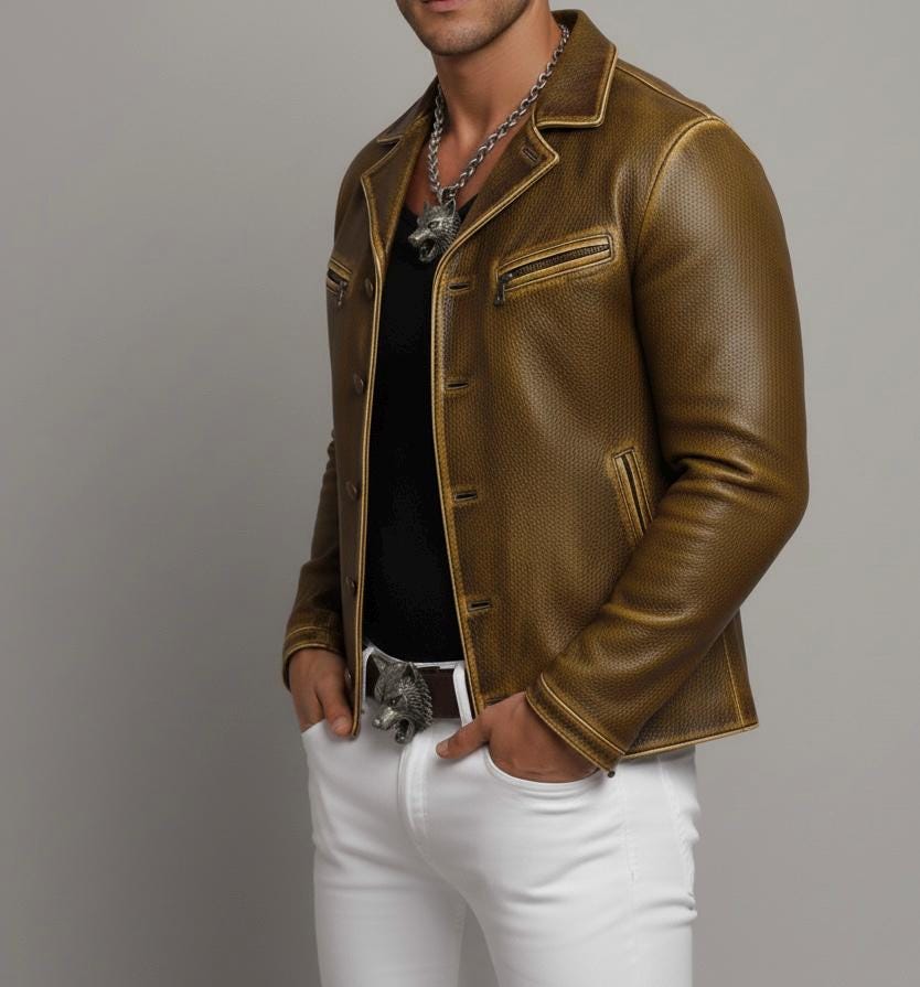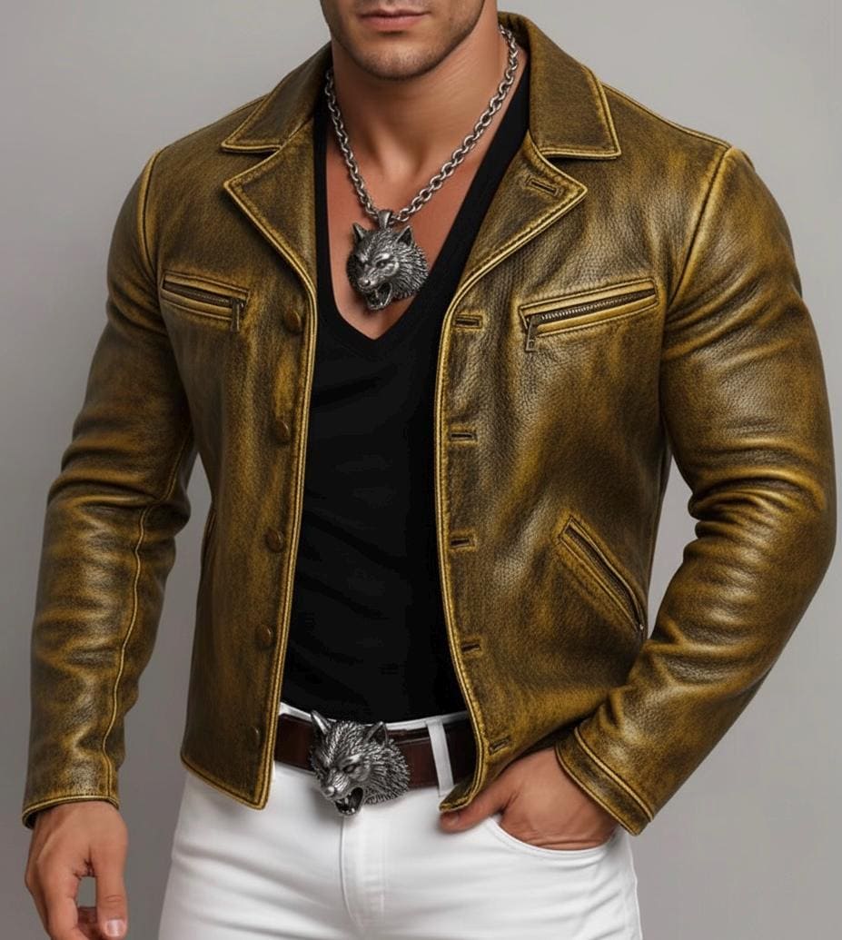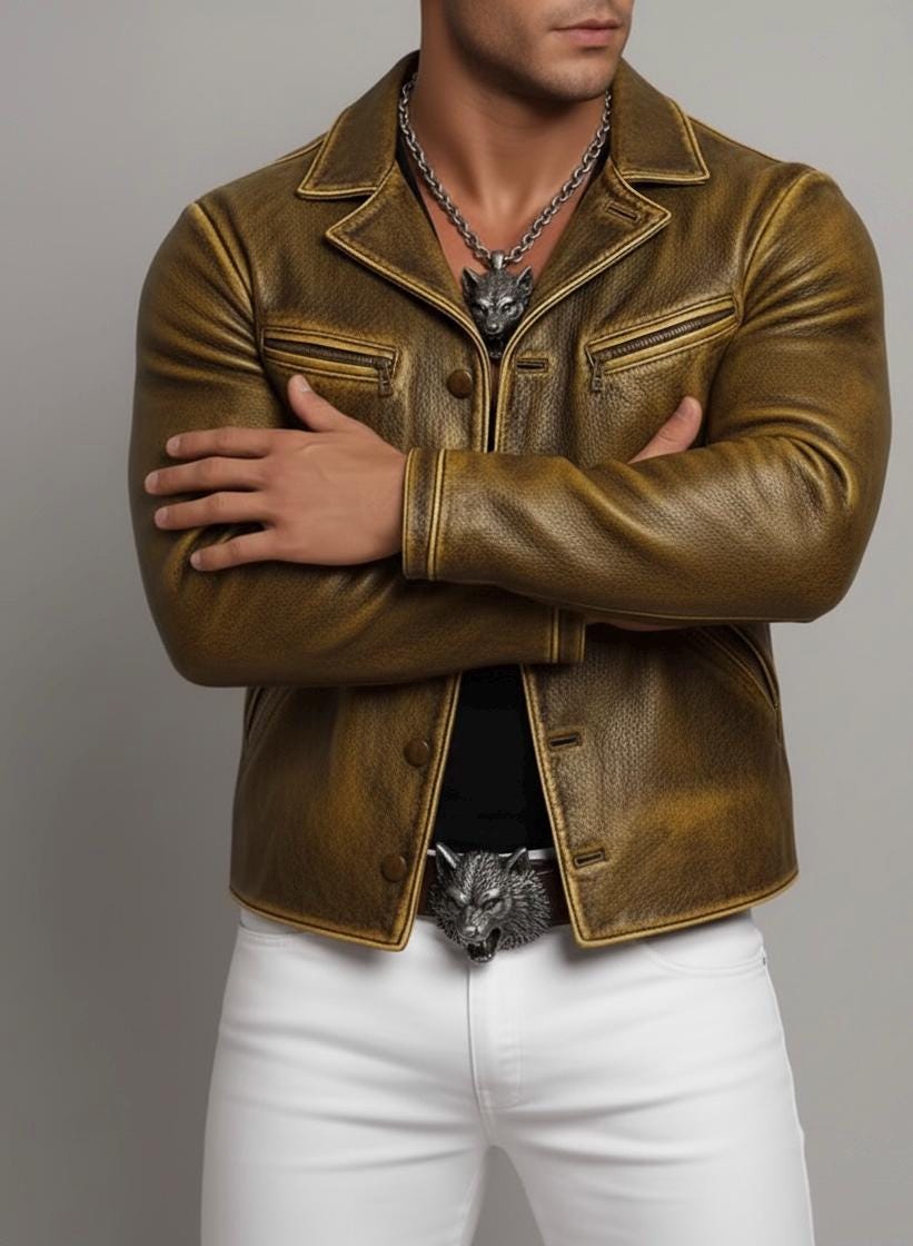 Welcome to AG GROUPS, where style meets rugged durability. Step into a timeless, vintage aesthetic with our signature Men's Distressed Mustard Yellow Leather Jacket. Crafted from genuine cowhide, this biker coat offers a unique, golden-brown finish and a classic retro silhouette perfect for making a statement on or off the road. Features & Benefits Genuine Cowhide Leather: Experience the quality and rugged texture of real leather that softens and molds to your body over time. Unique Distressed Finish: The mustard yellow/cognac color and worn-in look give this jacket an authentic, vintage appeal that stands out from the crowd. Classic Biker Style: Features a smart, pointed collar, button-front closure, and practical zippered chest and waist pockets for essential storage. Comfortable Fit: Designed with a soft inner lining for all-day comfort and a great fit. Versatile Outerwear: Perfect for a casual ride, a night out, or simply adding an edge to your everyday style. Product Details Brand: AG GROUPS Material: 100% Genuine Cowhide Leather (Exterior), Soft Polyester Lining (Interior) Color: Distressed Mustard Yellow / Cognac Tan Style: Vintage Biker, Cafe Racer, Casual Closure: Button-front and zipper details Pockets: Two zippered chest pockets, two zippered waist pockets, internal pocket Care Instructions: Dry clean only by a leather specialist. Sizing & Customization Please refer to our size chart (usually found in the last image of the listing photos) to ensure the perfect fit. Leather jackets should fit snugly initially as they stretch slightly with wear. Need a custom size or have questions? Feel free to message us! We are happy to help you find your ideal jacket.