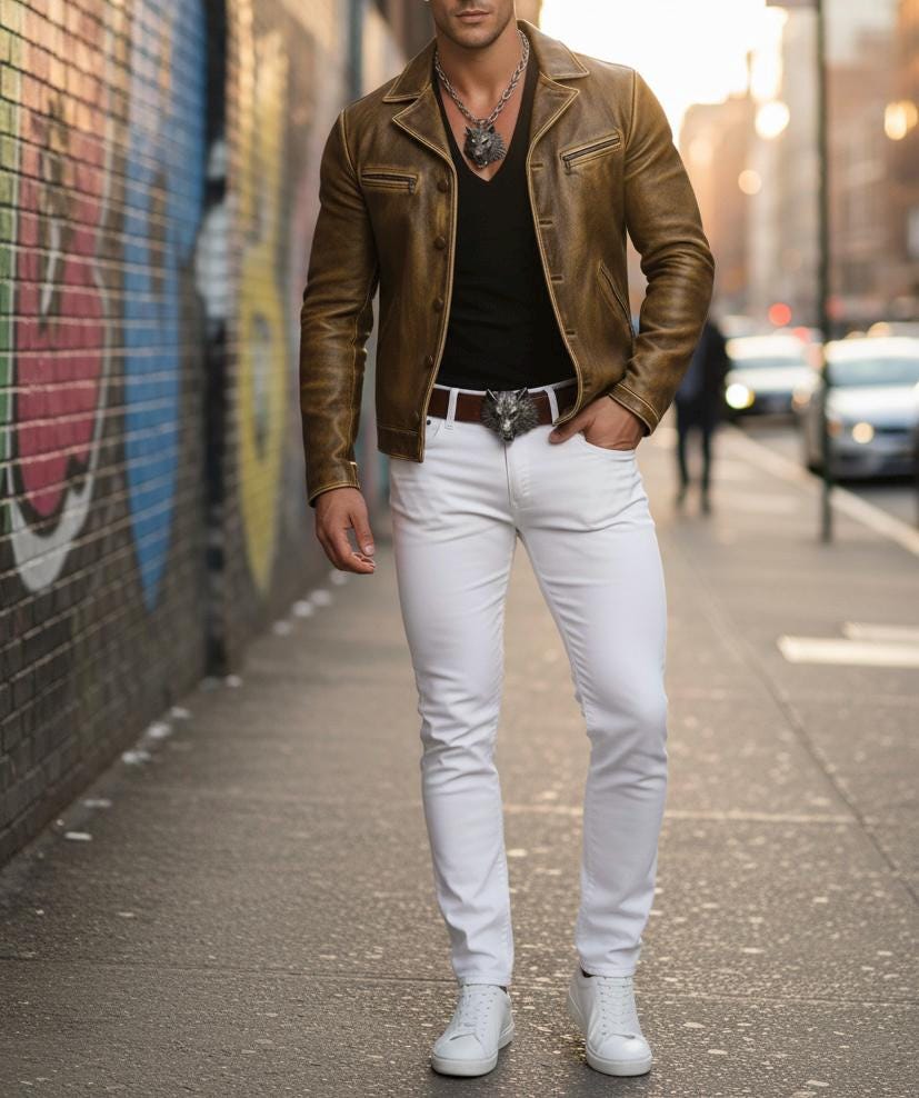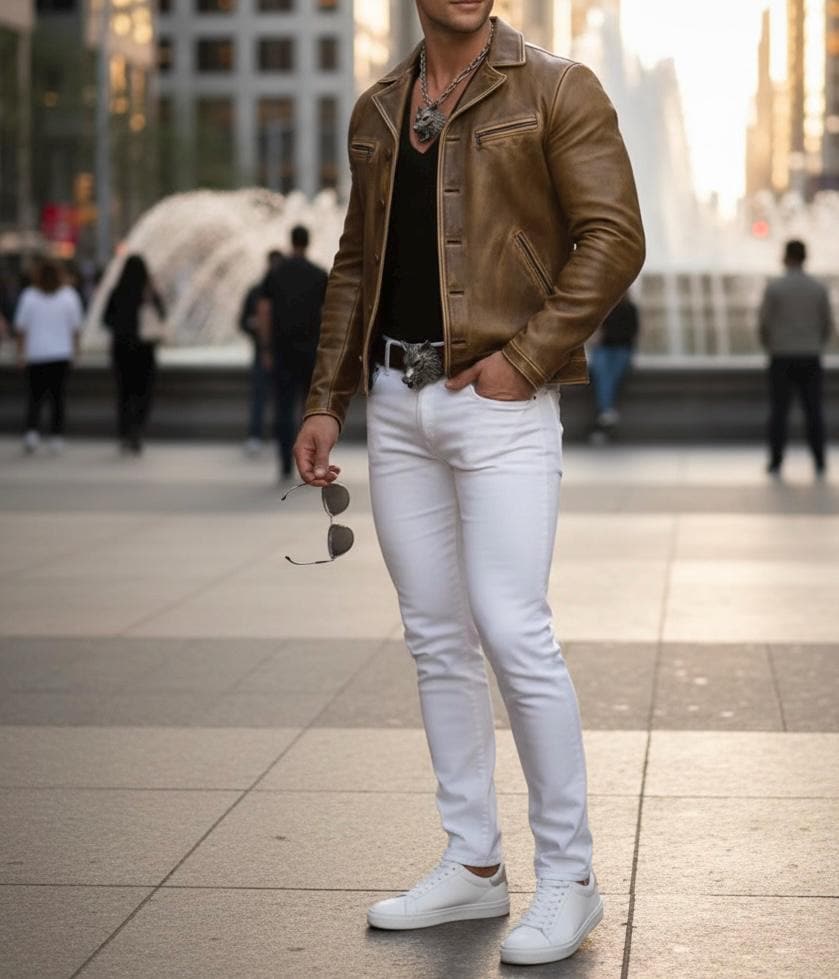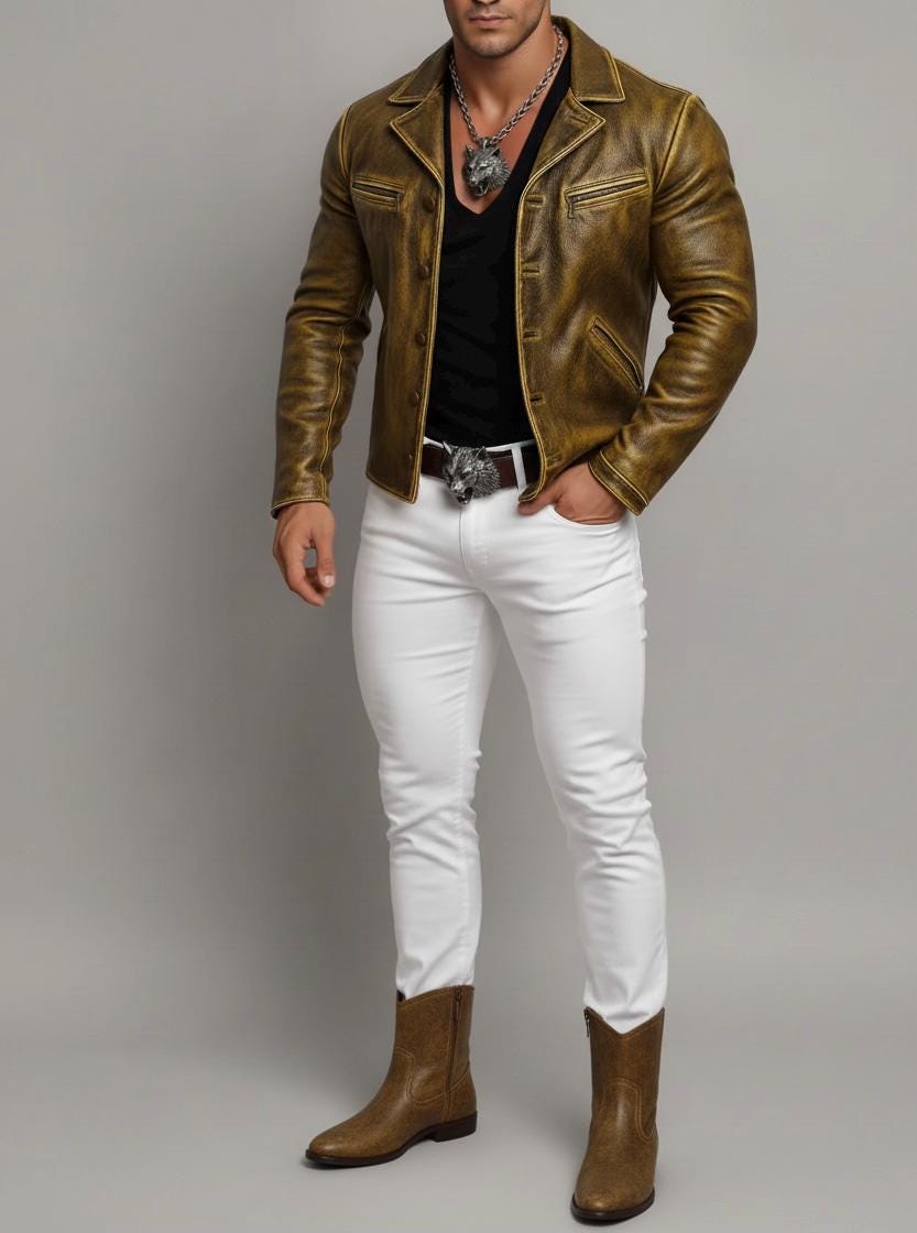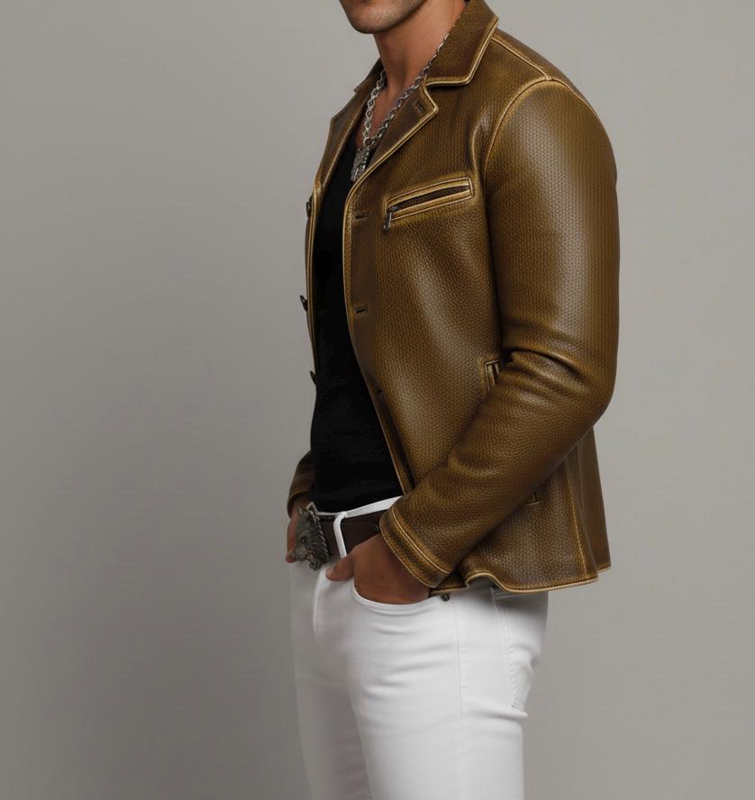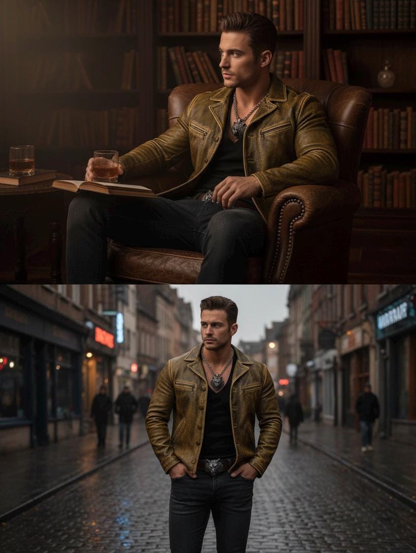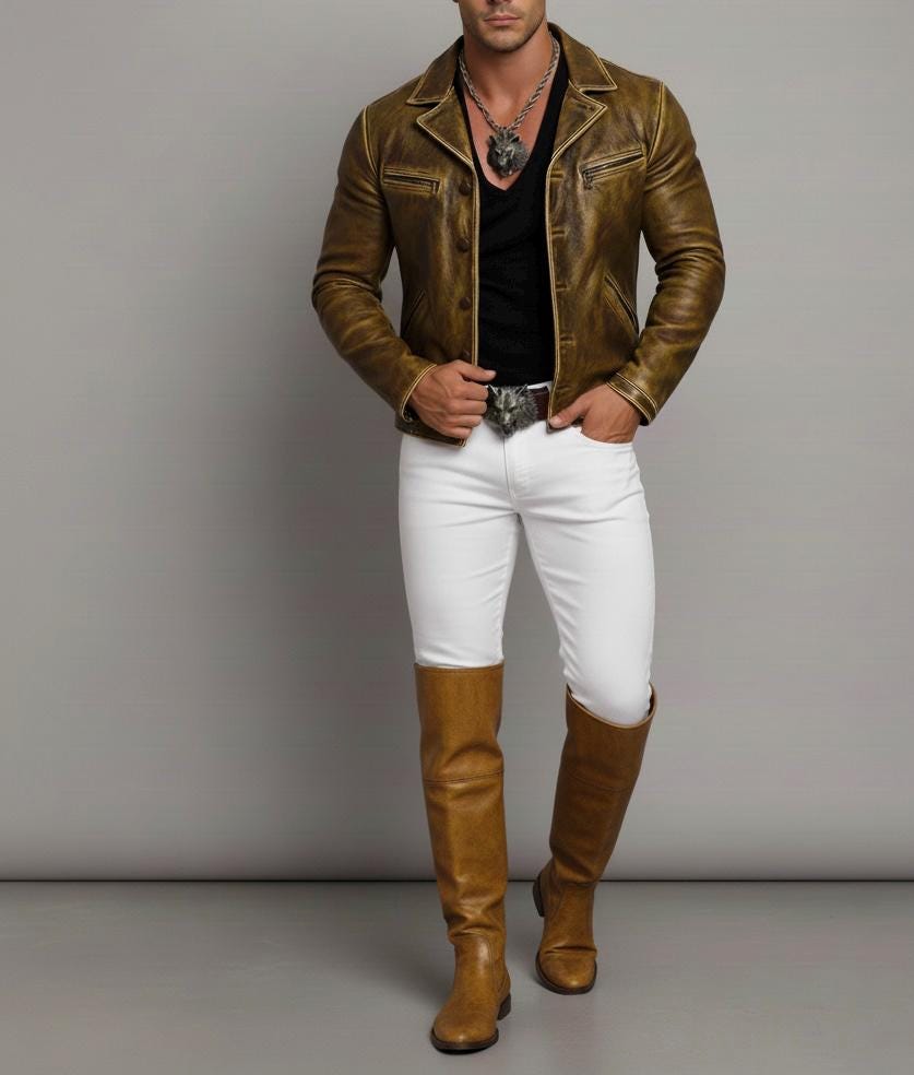 Welcome to AG GROUPS, where style meets rugged durability. Step into a timeless, vintage aesthetic with our signature Men's Distressed Mustard Yellow Leather Jacket. Crafted from genuine cowhide, this biker coat offers a unique, golden-brown finish and a classic retro silhouette perfect for making a statement on or off the road. Features & Benefits Genuine Cowhide Leather: Experience the quality and rugged texture of real leather that softens and molds to your body over time. Unique Distressed Finish: The mustard yellow/cognac color and worn-in look give this jacket an authentic, vintage appeal that stands out from the crowd. Classic Biker Style: Features a smart, pointed collar, button-front closure, and practical zippered chest and waist pockets for essential storage. Comfortable Fit: Designed with a soft inner lining for all-day comfort and a great fit. Versatile Outerwear: Perfect for a casual ride, a night out, or simply adding an edge to your everyday style. Product Details Brand: AG GROUPS Material: 100% Genuine Cowhide Leather (Exterior), Soft Polyester Lining (Interior) Color: Distressed Mustard Yellow / Cognac Tan Style: Vintage Biker, Cafe Racer, Casual Closure: Button-front and zipper details Pockets: Two zippered chest pockets, two zippered waist pockets, internal pocket Care Instructions: Dry clean only by a leather specialist. Sizing & Customization Please refer to our size chart (usually found in the last image of the listing photos) to ensure the perfect fit. Leather jackets should fit snugly initially as they stretch slightly with wear. Need a custom size or have questions? Feel free to message us! We are happy to help you find your ideal jacket.