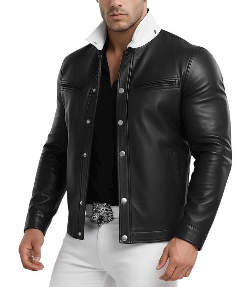 AG GROUPS Men's Black Leather Biker Jacket with White Collar