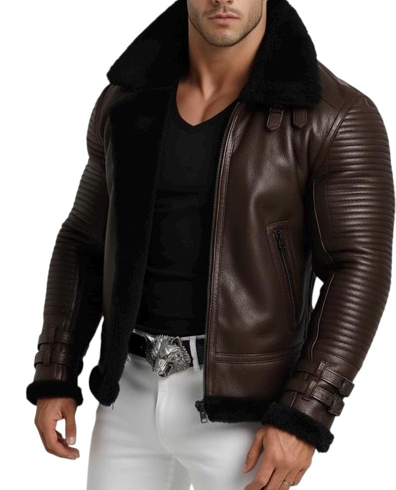 Classic Biker/Aviator Style: Features a bold black fur collar with buckle details, cuffs with adjustable straps, and a sturdy front zipper closure.