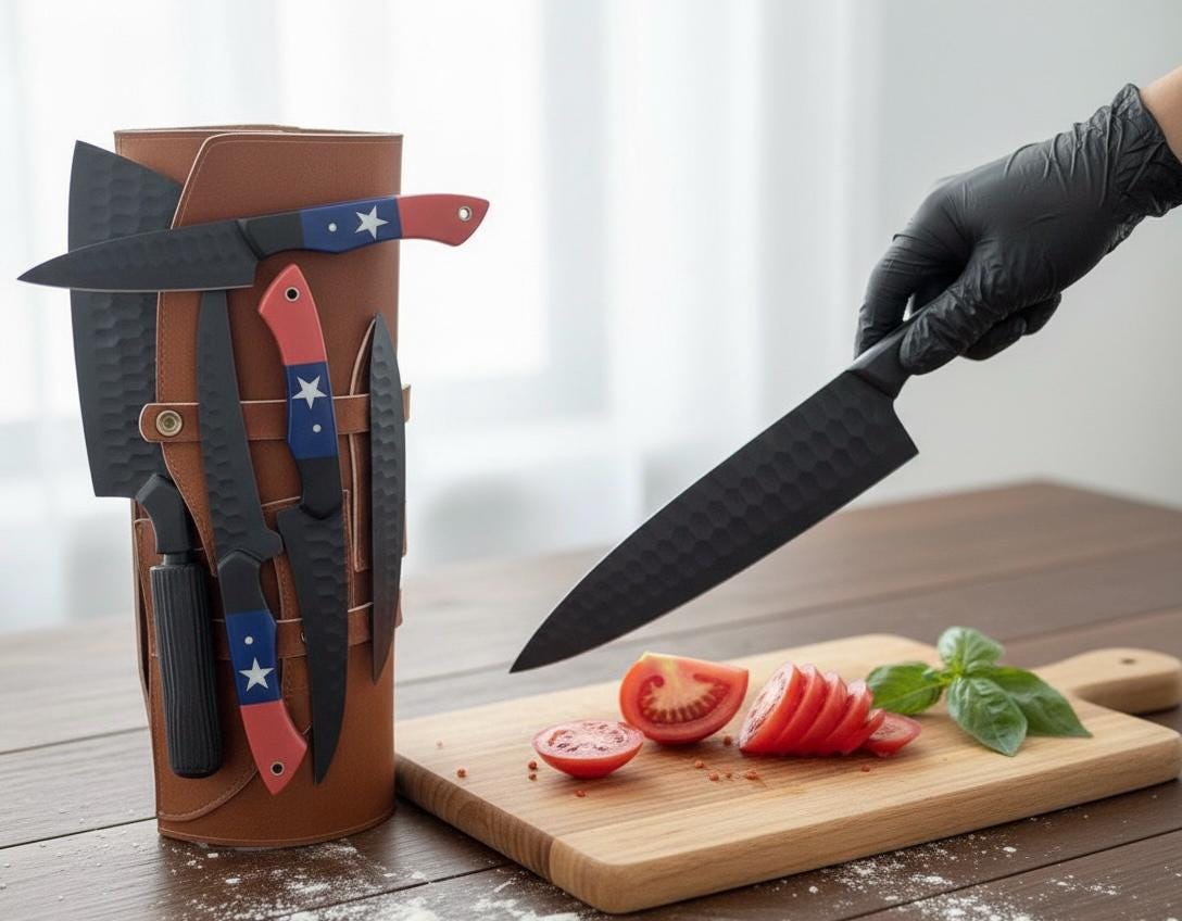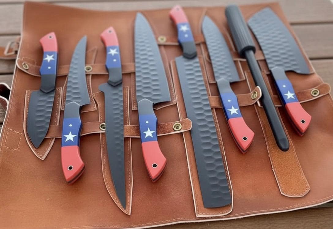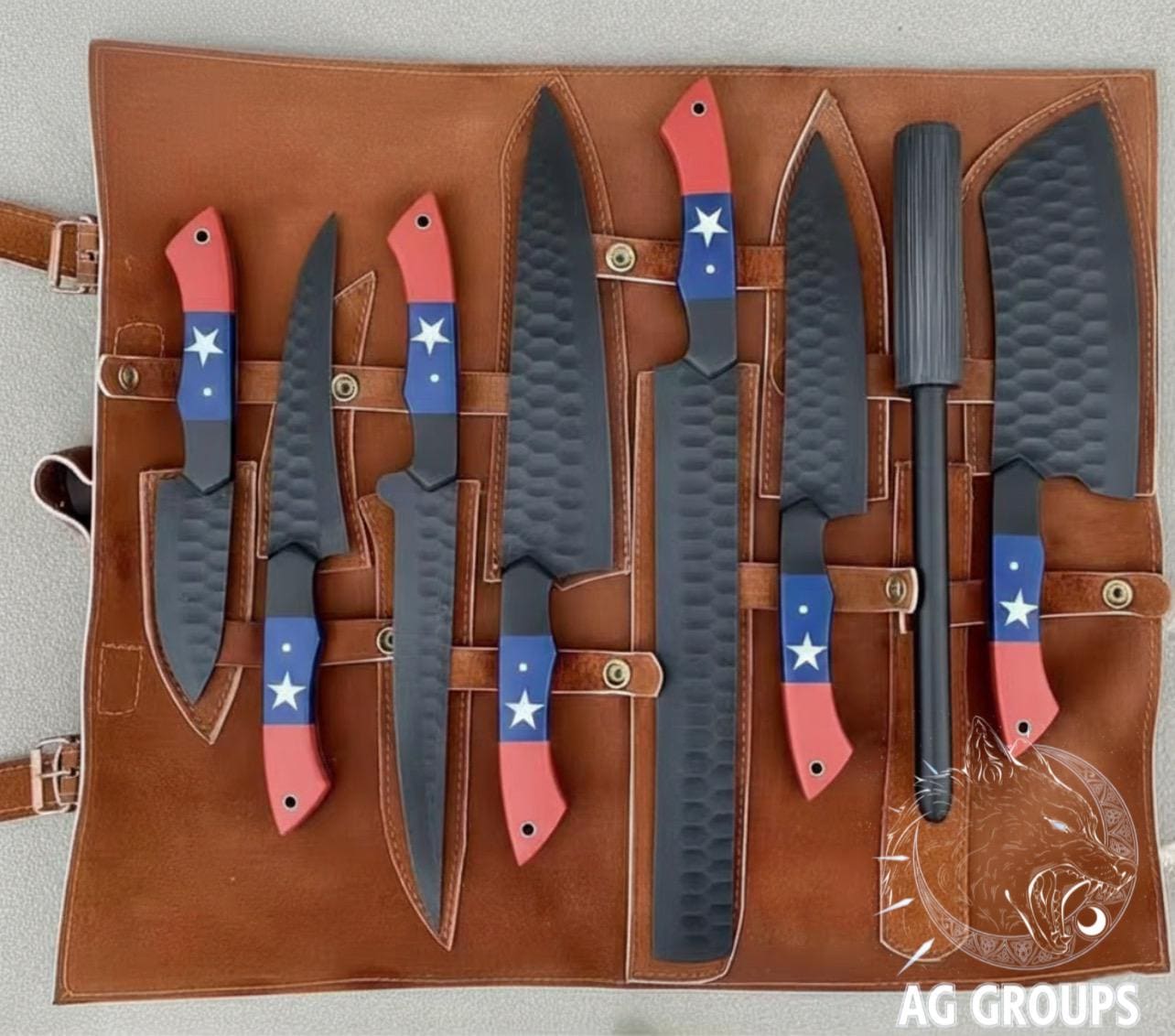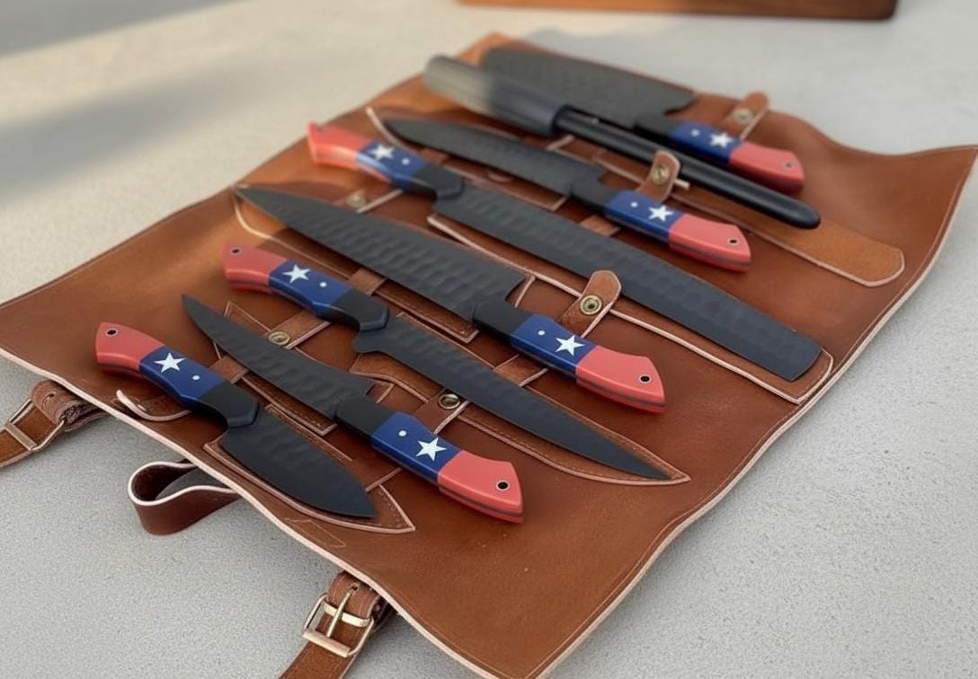 Handmade 8-Piece Chef Knives Set with Leather Roll Elevate your culinary experience with this stunning, handcrafted 8-piece chef knife set. Featuring a comprehensive range of knives essential for any kitchen task, from delicate slicing to heavy-duty chopping, this set combines exceptional functionality with a unique, patriotic aesthetic. Each knife is housed in a durable, stylish leather roll bag for safe storage and transport. Set Includes: 1x Meat Cleaver: [Approx. blade length] for heavy cuts of meat and bone. 1x Santoku Knife: [Approx. blade length] for versatile chopping, dicing, and mincing. 1x Chef Knife: [Approx. blade length] the all-purpose workhorse of the kitchen. 1x Boning Knife: [Approx. blade length] designed for precision deboning. 1x Paring/Utility Knife: [Approx. blade length] ideal for intricate tasks and peeling. 1x Smaller Cleaver: [Approx. blade length] 1x Utility Knife: [Approx. blade length] 1x Sharpening Rod: Keep your edges razor-sharp. Product Features: Premium Material: Blades forged from high-quality [e.g., Damascus steel, 440C high-carbon stainless steel] for exceptional edge retention and durability. Unique Handles: Distinctive and ergonomic red, white, and blue handles with star accents provide a comfortable and secure grip. Leather Carry Case: A rugged, genuine [color, e.g., brown] leather roll keeps your tools secure and protected. Perfect Gift: An ideal personalized gift for chefs, home cooks, groomsmen, or anyone who appreciates quality craftsmanship for birthdays, weddings, anniversaries, or Father's Day.