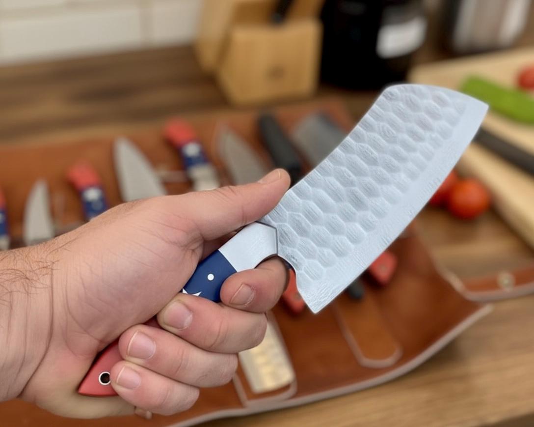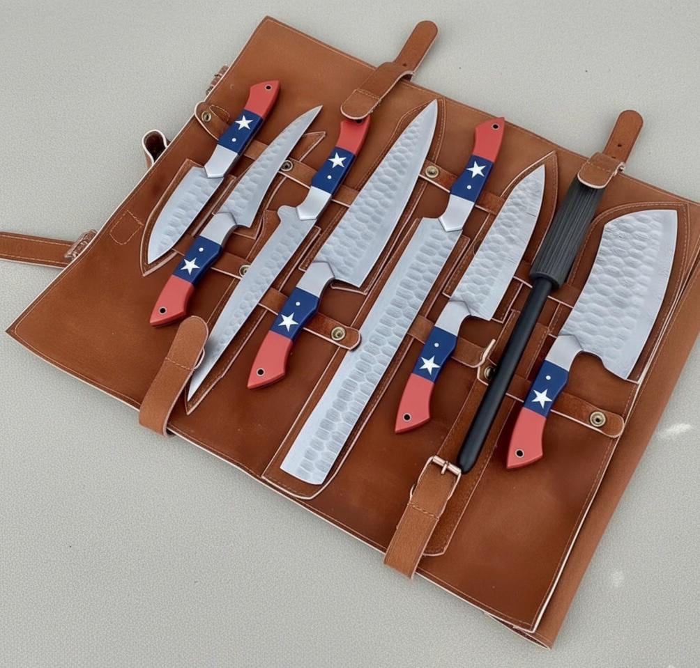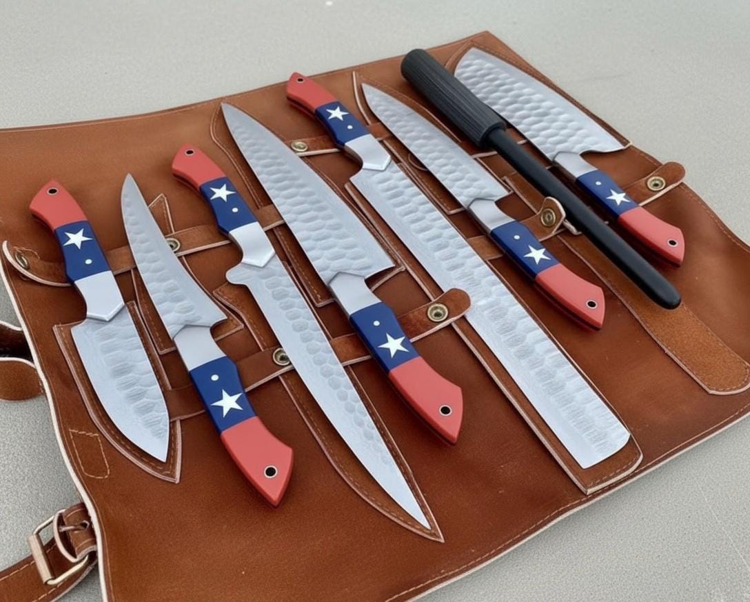 This appears to be a handmade 8-piece professional chef knife set by the brand AG Groups. The knives feature high-carbon steel blades, often advertised as Damascus steel, and distinctive red, white, and blue handles with a star motif, reminiscent of the American flag. Key Features Set Composition: The set includes seven individual knives of varying lengths and styles (such as chef, cleaver, utility, and paring knives), plus one black sharpening rod. Materials: The blades are typically advertised as high-carbon which provides a sharp edge but requires handwashing and oiling to prevent rust. The handles are full tang for durability and balance and may be made from materials like Resin depending on the specific variation. Aesthetics: The standout feature is the patriotic handle design and the unique hammered or patterned texture on the blades. Storage: The set comes in a genuine brown leather roll bag for safe transport and storage.