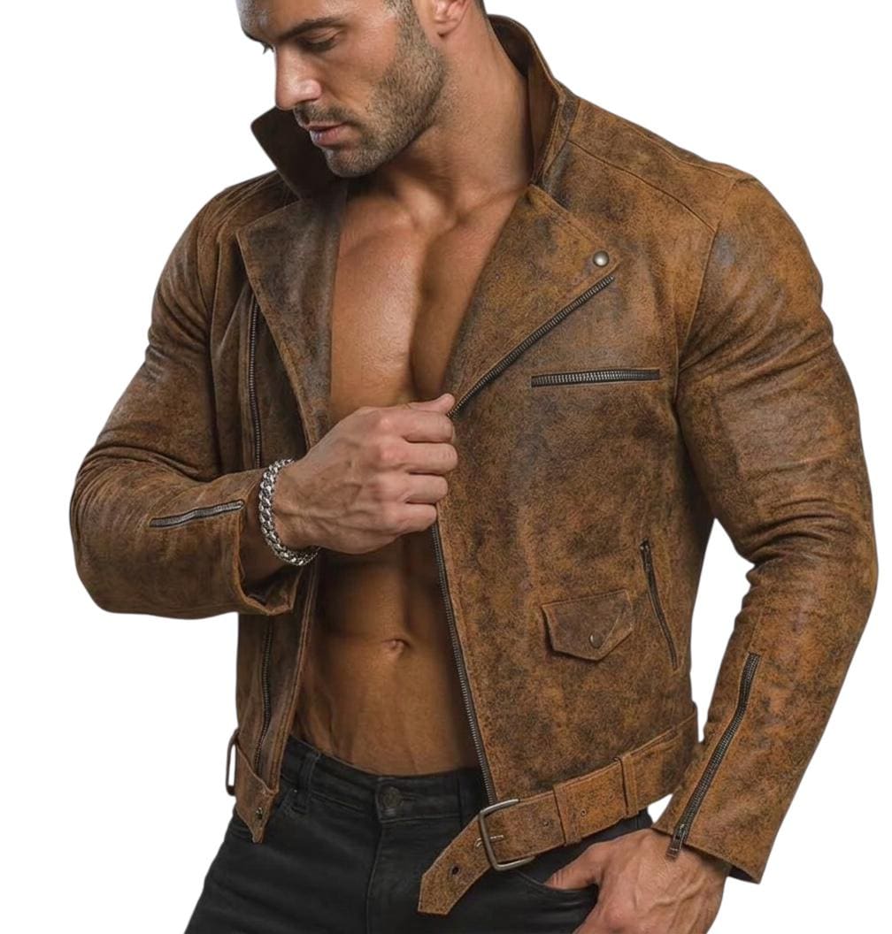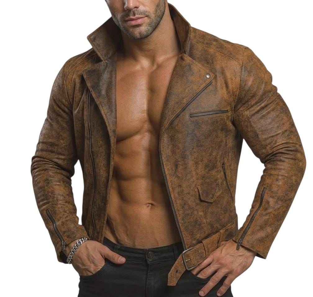 Men's Distressed Brown Sheepskin Leather Biker Jacket – Vintage Motorcycle Rider Retro Streetwear