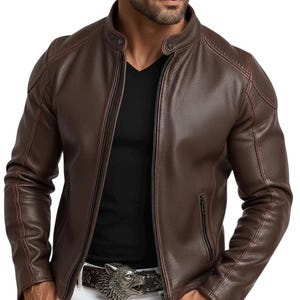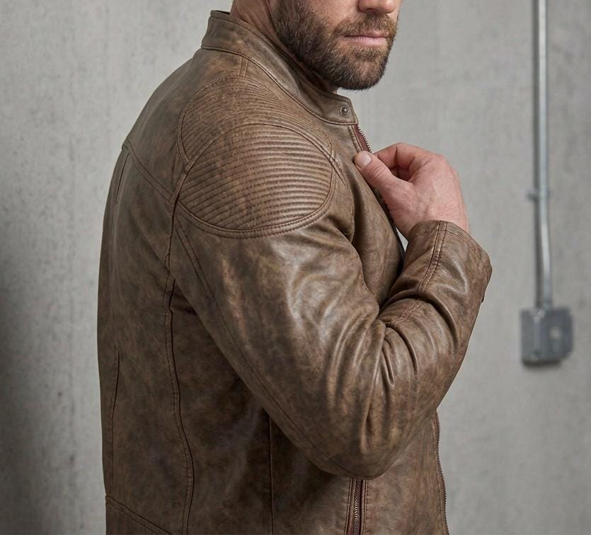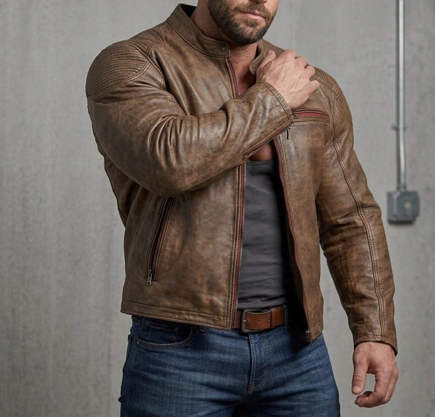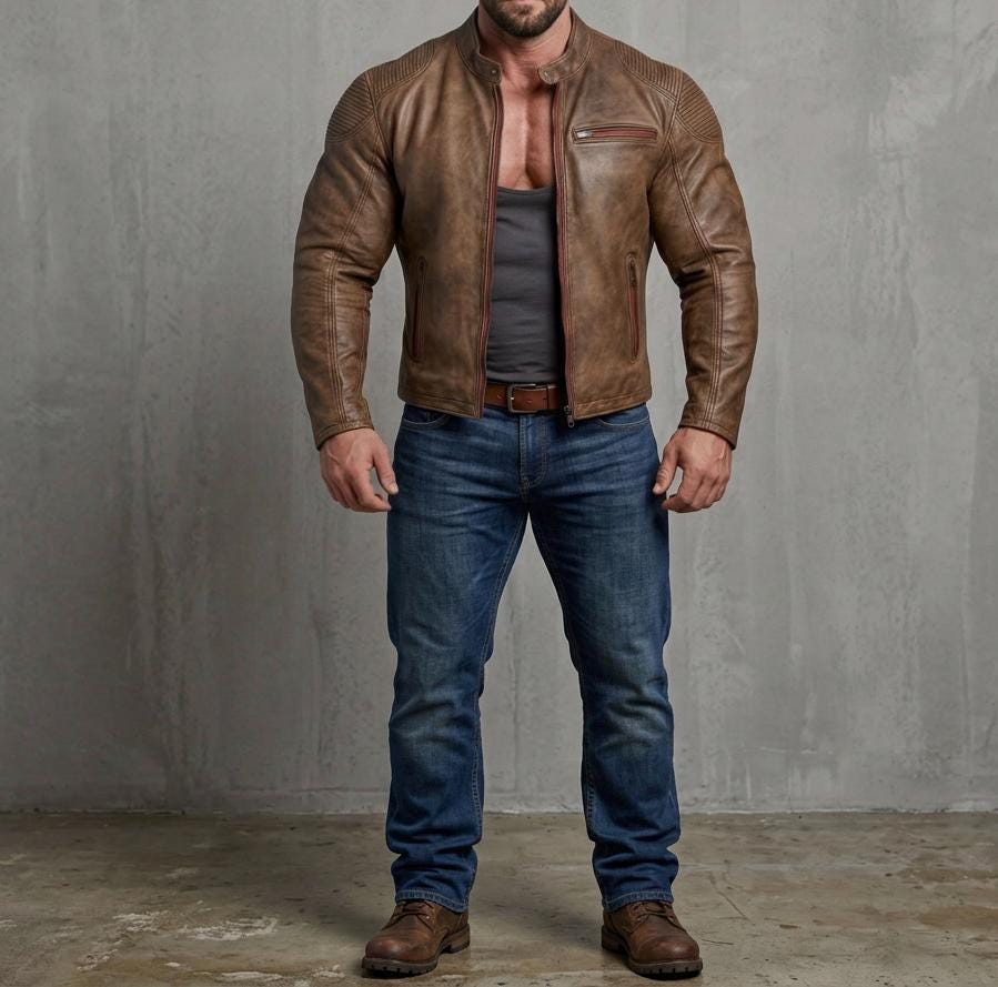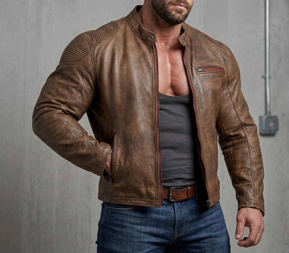 Classic Cafe Racer Silhouette: Features a sleek stand-up collar (band style) and a slim-fit design that highlights the physique.