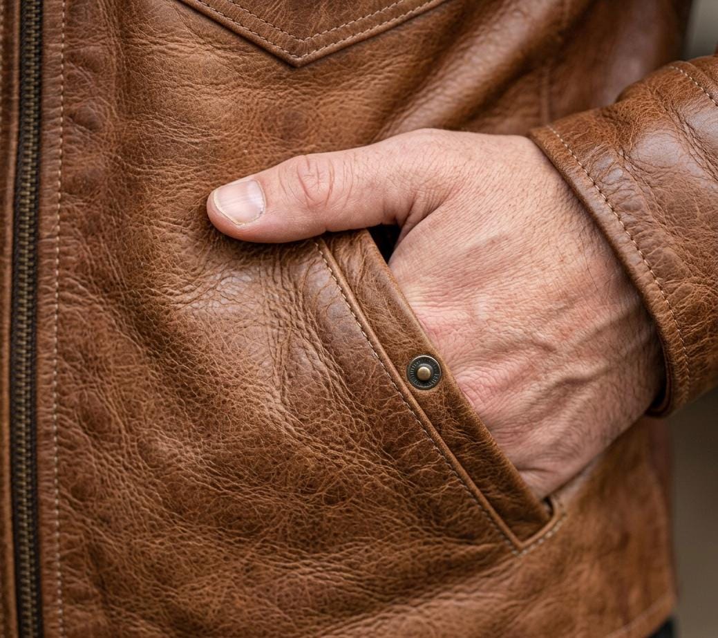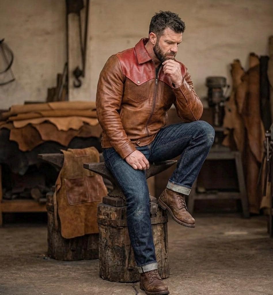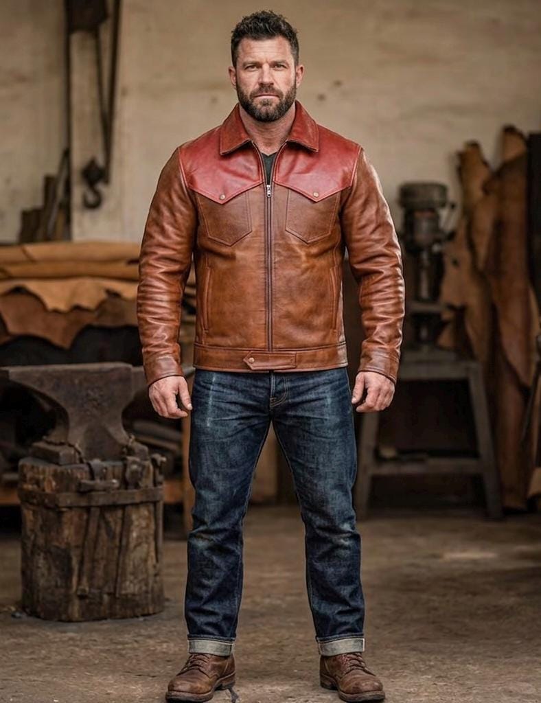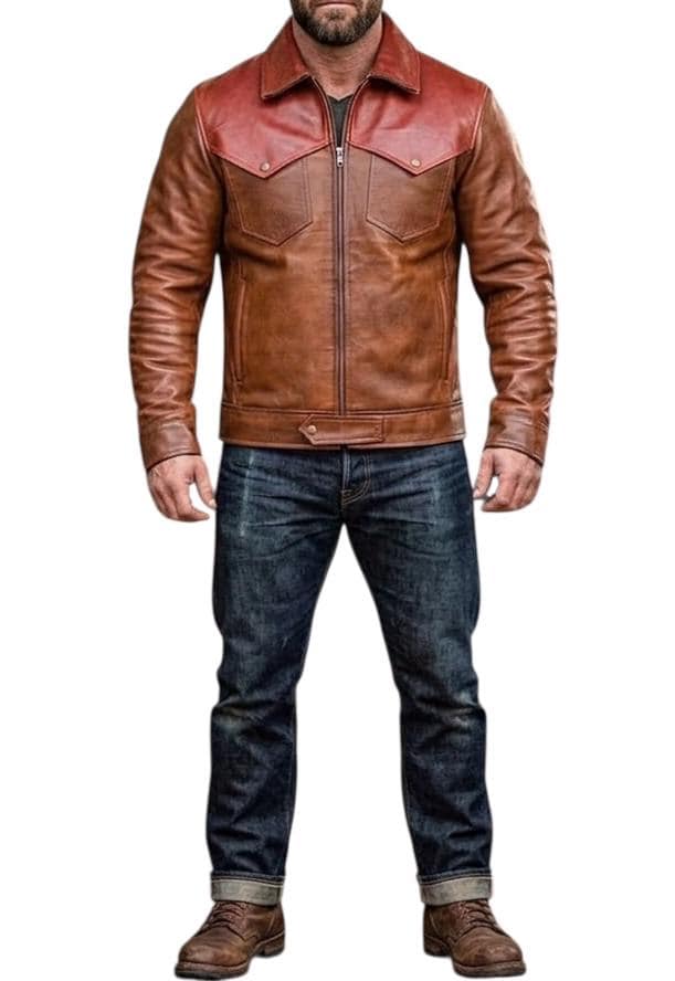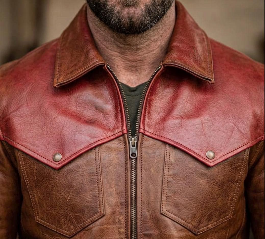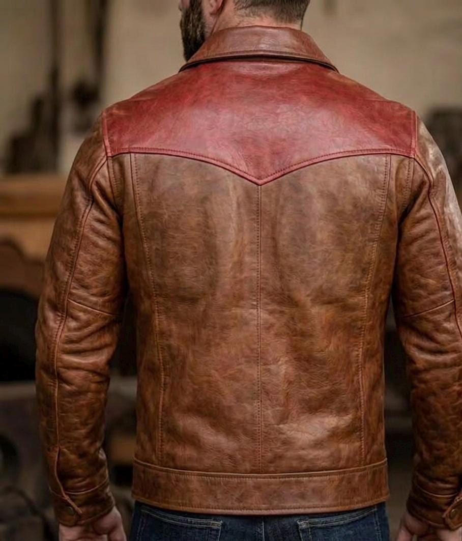 This handcrafted two-tone leather jacket is more than just outerwear—it’s a symbol of grit and timeless style. Inspired by classic Western and heritage designs, it features a distinctive contrasting yoke in a rich cognac hue against a deep Austin brown body, creating a bold, rugged look that stands out in any crowd.