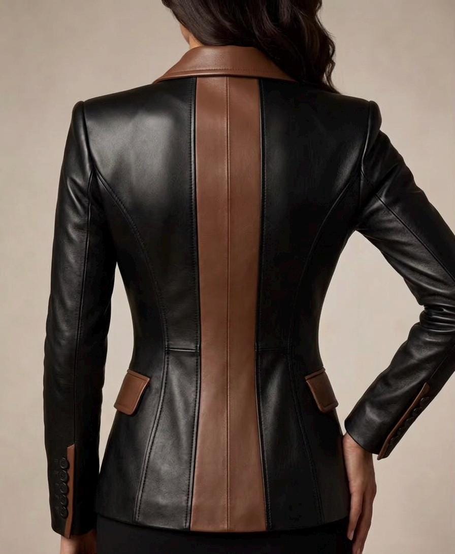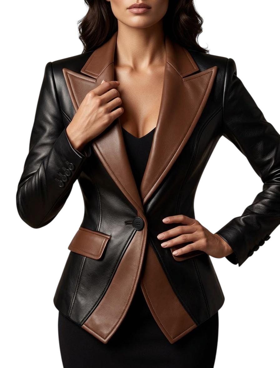 Elevate your wardrobe with this exquisite Two-Tone Leather Blazer. Designed for the modern woman who values sophisticated tailoring with an edgy twist, this jacket features a striking contrast between deep ebony and rich mocha tones. Its sharp, oversized lapels and cinched waist create a powerful, feminine silhouette perfect for both professional and evening wear.