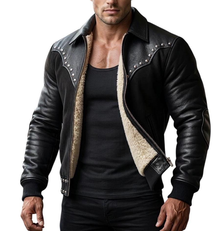 Men's Black Studded Leather Biker Jacket, Faux Shearling Lined Western Coat