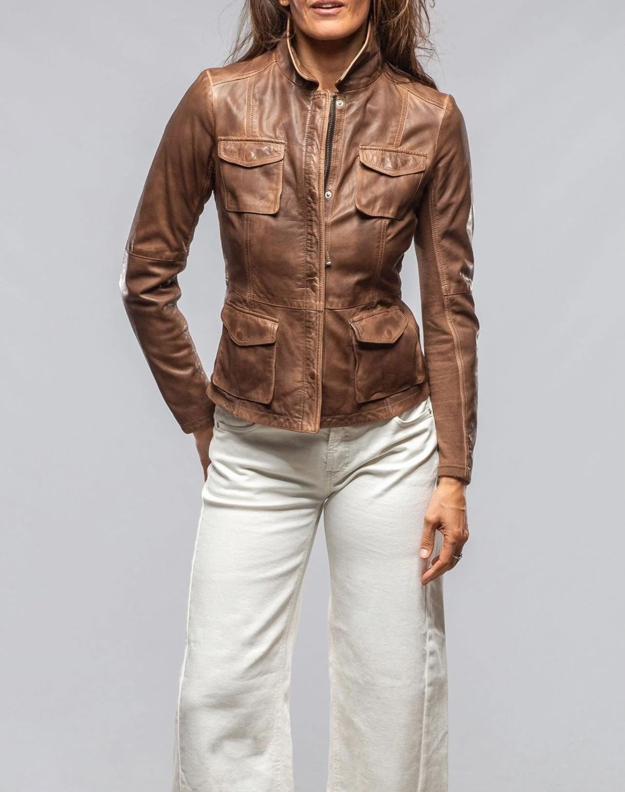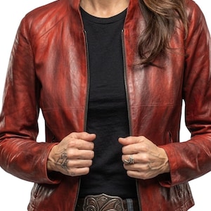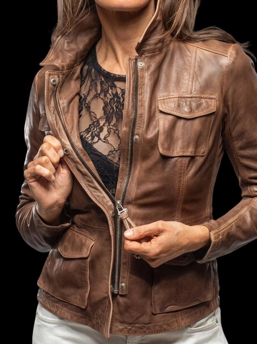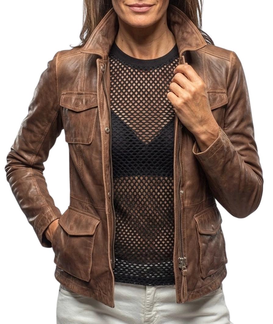 Vintage Distressed Brown Leather Jacket - Women’s Soft Lambskin Utility Biker Coat with 4 Pockets
