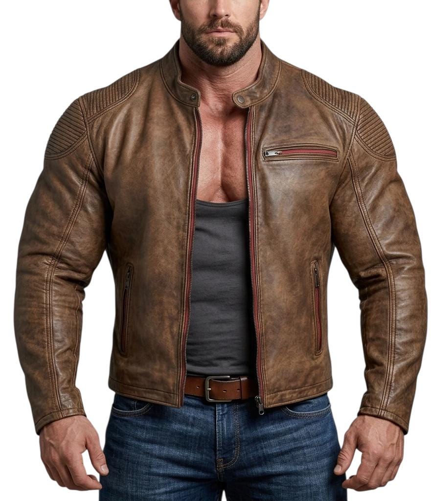 This isn't just a jacket; it’s a statement piece designed for those who appreciate the timeless aesthetic of vintage motorcycle culture. Crafted from premium, hand-selected leather, this jacket features a unique distressed finish that gives it a "lived-in" character from day one. Why You’ll Love It: Classic Cafe Racer Silhouette: Features a sleek stand-up collar (band style) and a slim-fit design that highlights the physique. Premium Craftsmanship: Detailed quilted padding on the shoulders adds a layer of vintage texture and durability. Built to Last: Equipped with high-quality YKK zippers on the front and pockets for smooth, reliable use. Functional Style: Includes multiple exterior zippered pockets and internal pockets for your essentials. Comfortable Interior: Fully lined with a soft, breathable polyester lining, making it perfect for year-round wear. Specifications: Material: 100% Genuine Leather (Sheepskin) Color: Distressed Vintage Brown Style: Biker / Moto / Cafe Racer Closure: Front Zip with Snap Button Collar Fit: Slim Fit (Please refer to our size chart) Care Instructions: To maintain the vintage look, we recommend professional leather cleaning only. Avoid prolonged exposure to heavy rain.